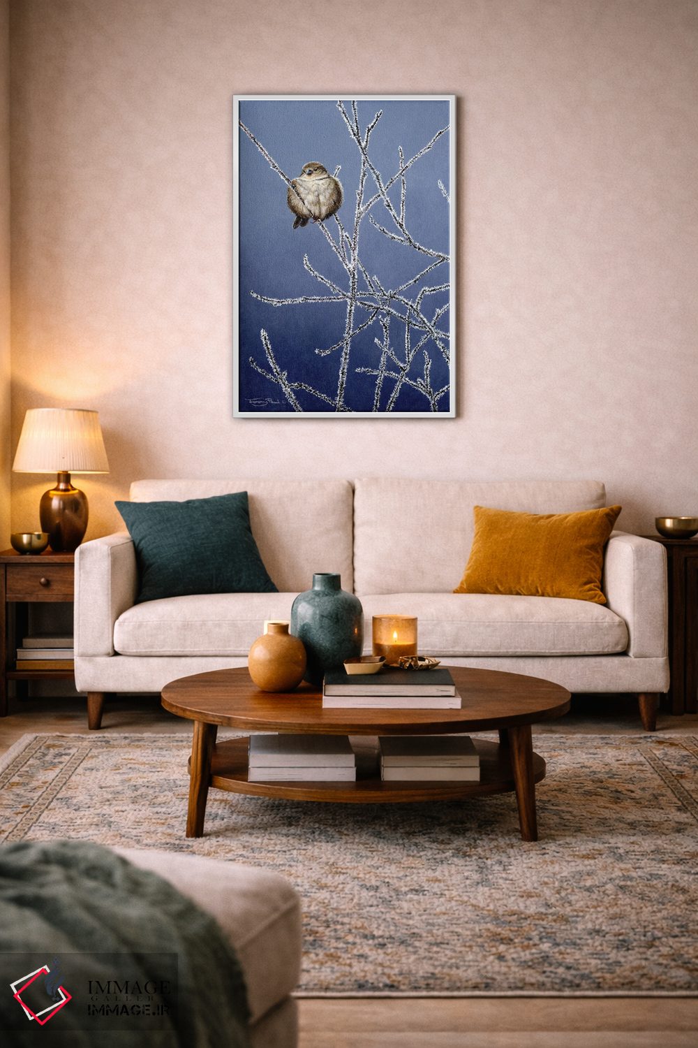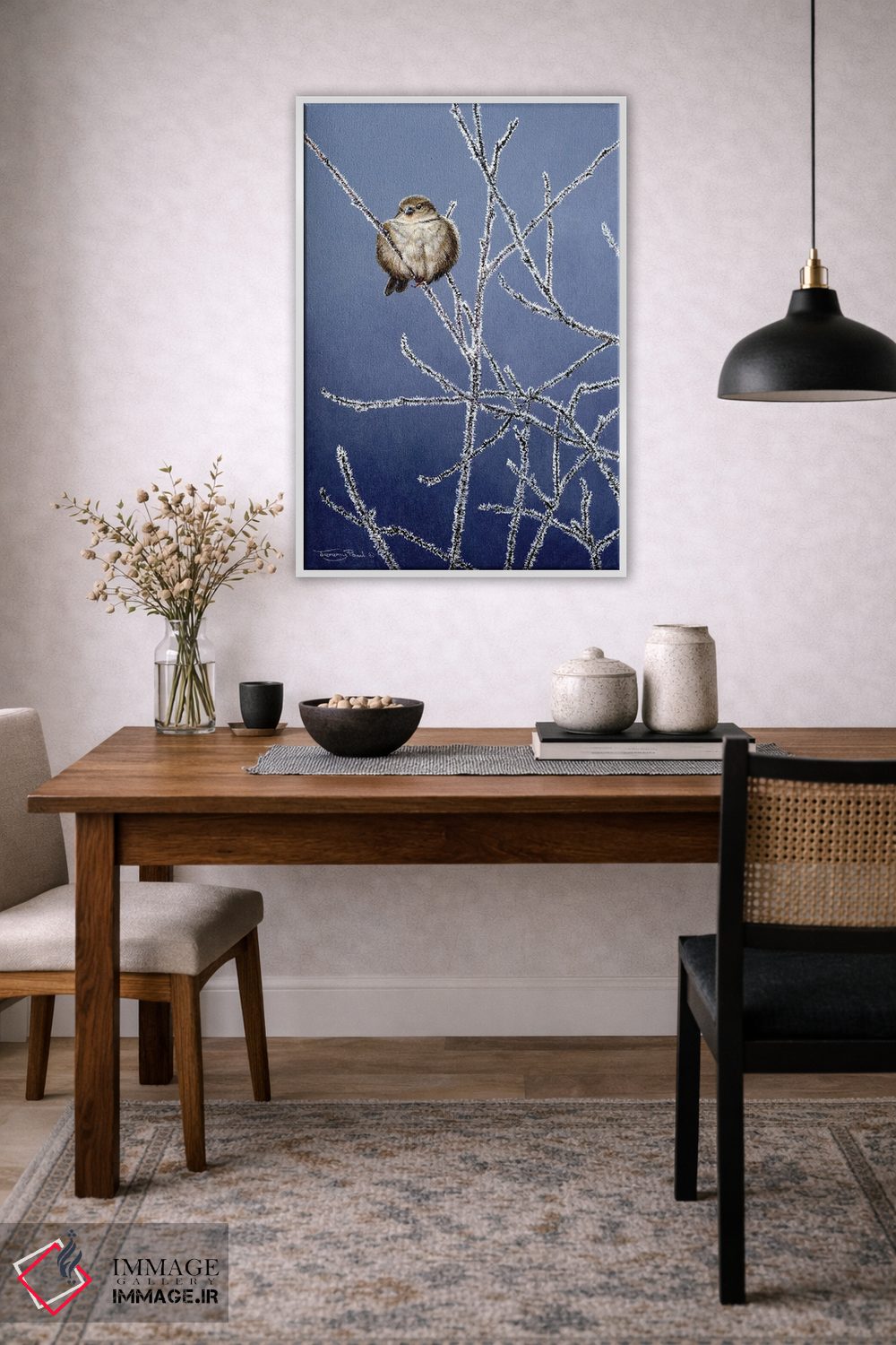 این اثر با عنوان «شاخههای یخزده» اثرِ «جرمی پاول» در کنار رنگهای خنثی، تضاد دلچسبی میسازد؛ برای کافههای کوچک و صمیمی انتخابی خوشسلیقه است. هم فضا را گرم میکند، هم شلوغش نمیکند.