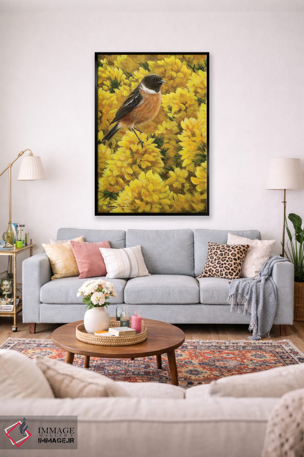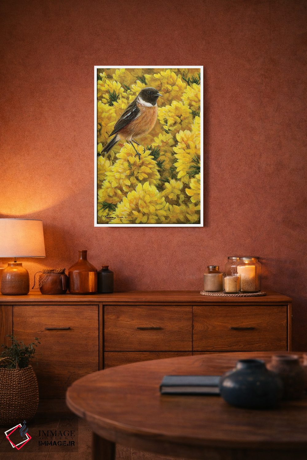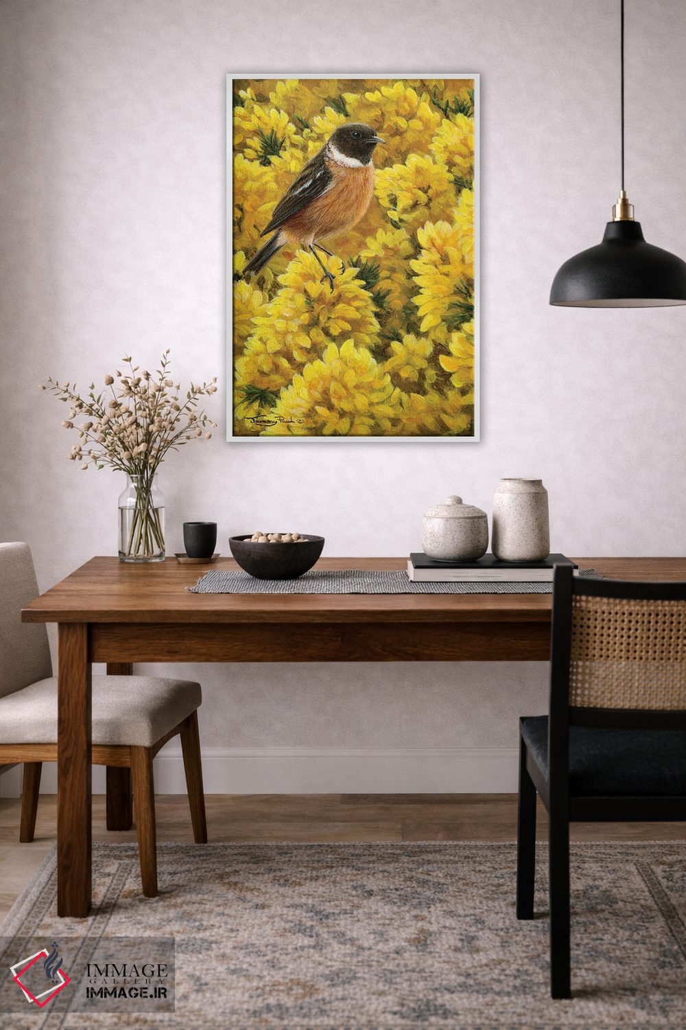 برای دیوارهای ساده، «سنگچرخ و خار زرد (دو پرنده و گیاهی)» اثرِ «جرمی پاول» به فضا، گرمیِ ملایم اضافه میکند؛ برای دکورهای مدرن و مینیمال انتخابی خوشسلیقه است. برای دیوار گالریوار هم گزینهٔ خوبیست.
