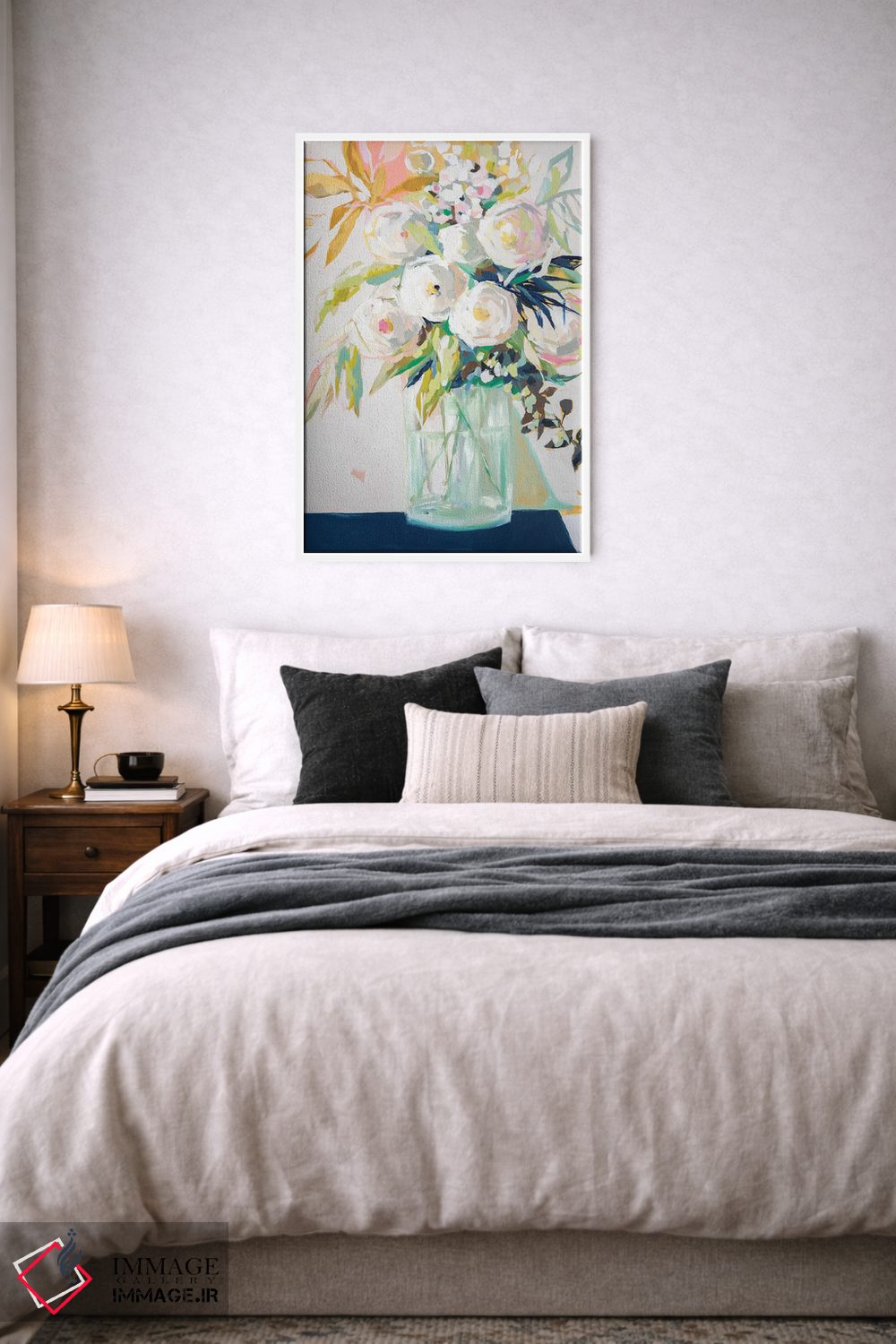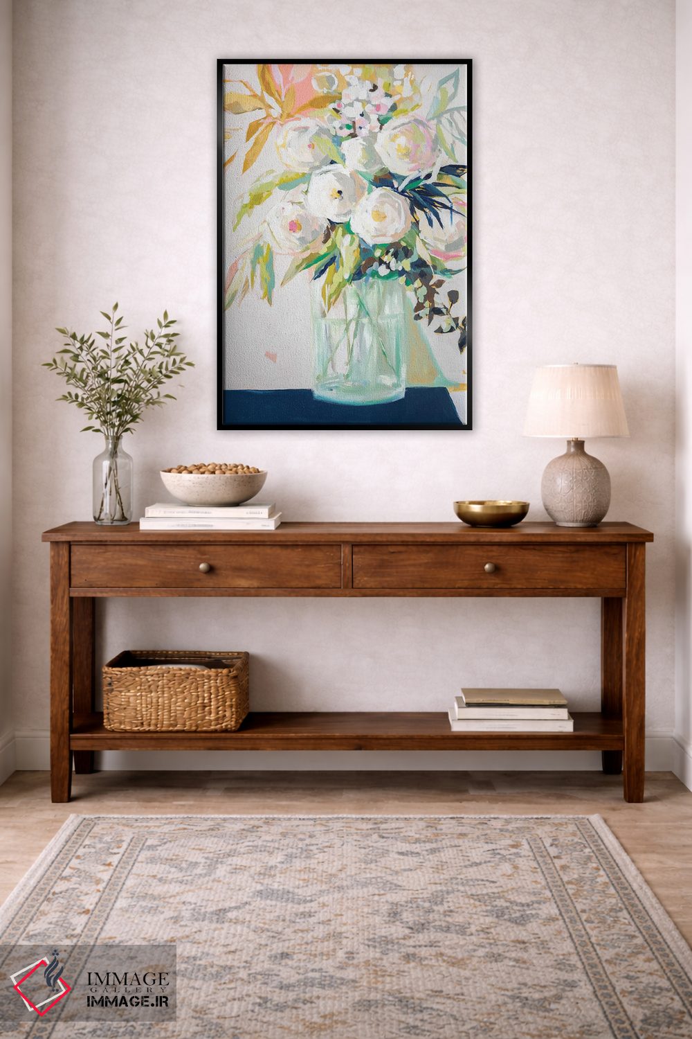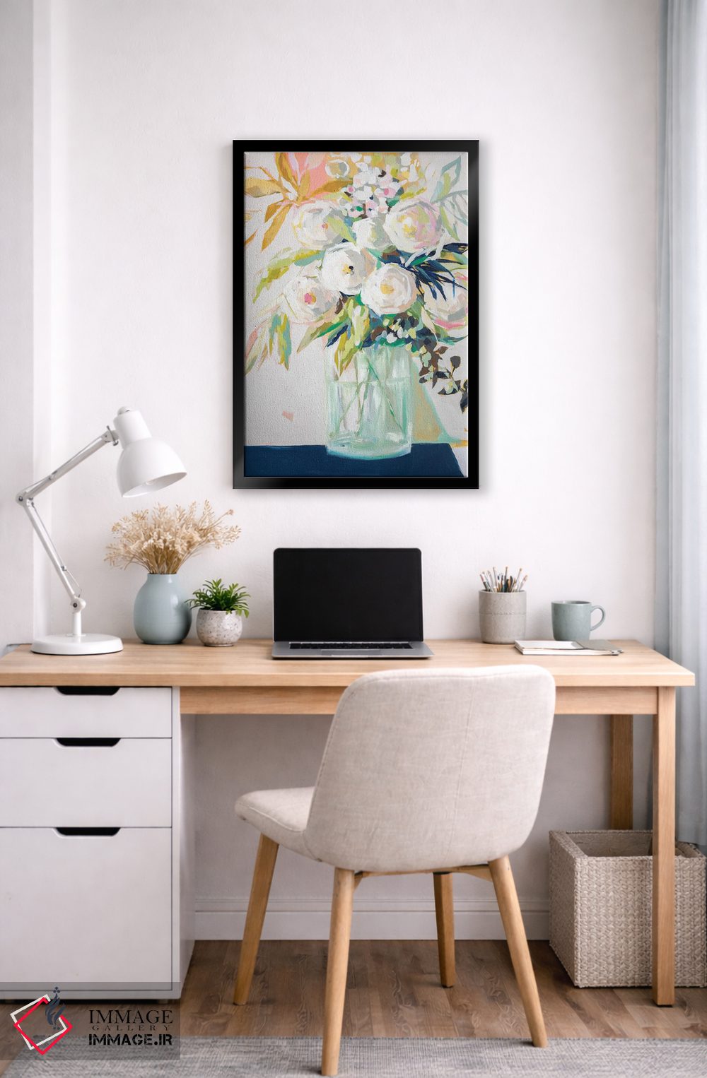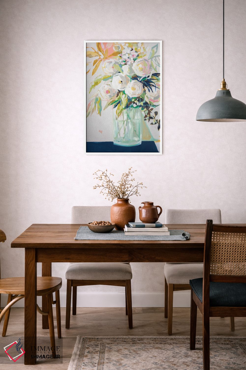 برای اتاق خواب و نشیمنهای آرام، «گلهای گلدان سرمهای» اثرِ «جنی وستنهوفر» حس فصل را آرام وارد فضا میکند؛ برای کنار میز آرایش یا کنسول انتخابی خوشسلیقه است. فضا را شلوغ نمیکند؛ فقط لطیفترش میکند.