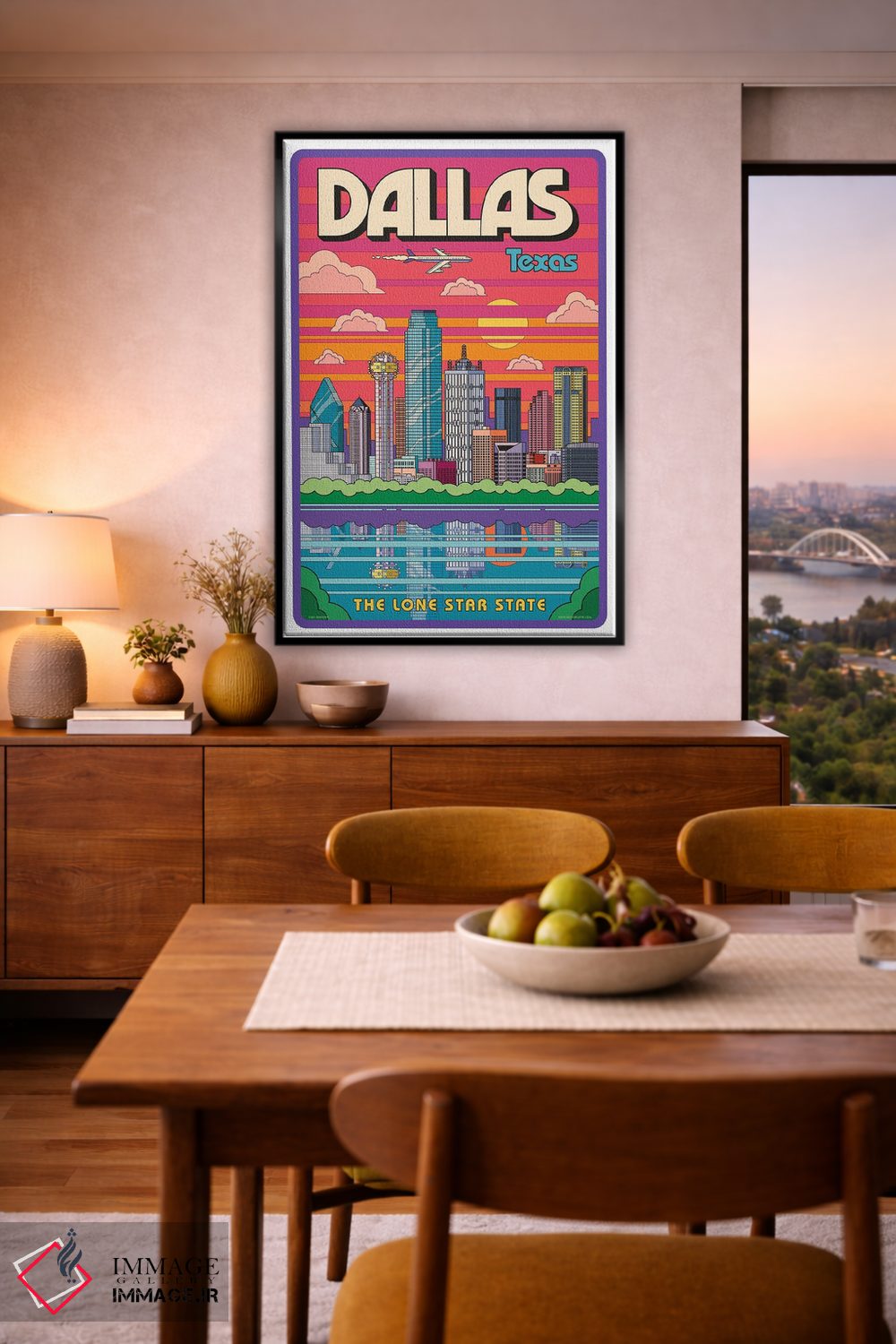 برای ترکیب با گلدانهای سبز، پارچههای ساده و نور گرم، «پوستر سفر پاپآرت دالاس» اثرِ «جیم زانیسر» با موضوعِ این اثر انتخابی هماهنگ است.