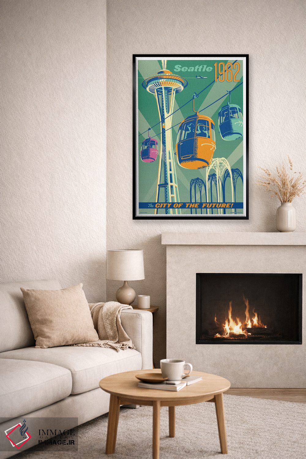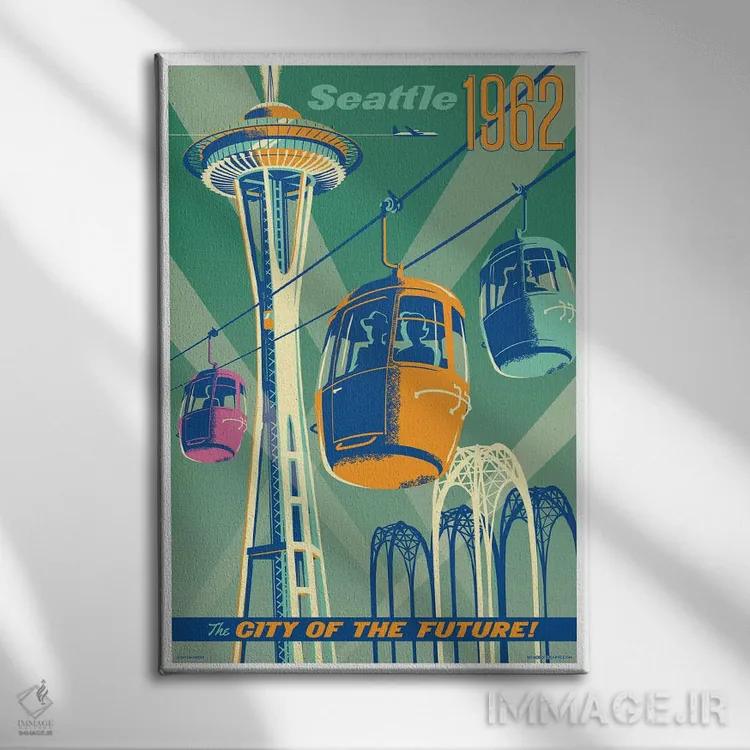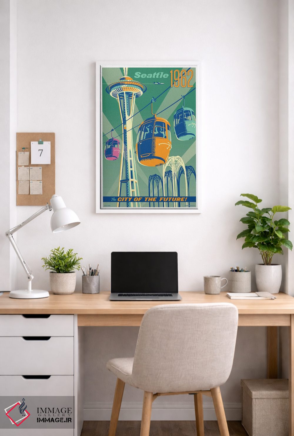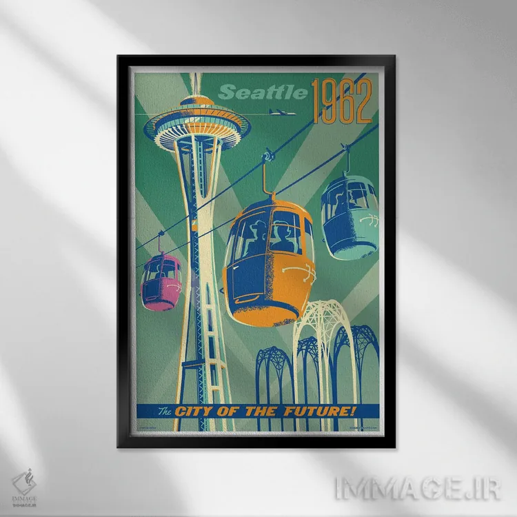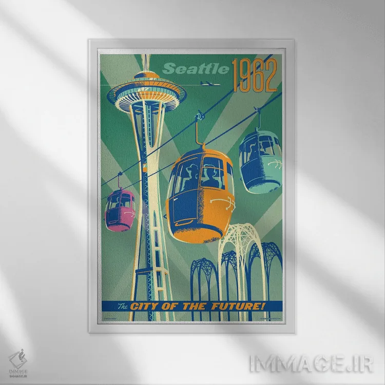 این اثر با عنوان «پوستر سفر سیاتل ۱۹۶۲» اثرِ «جیم زانیسر»، تمیز و دقیق است؛ مناسب دیوارهای مینیمال.