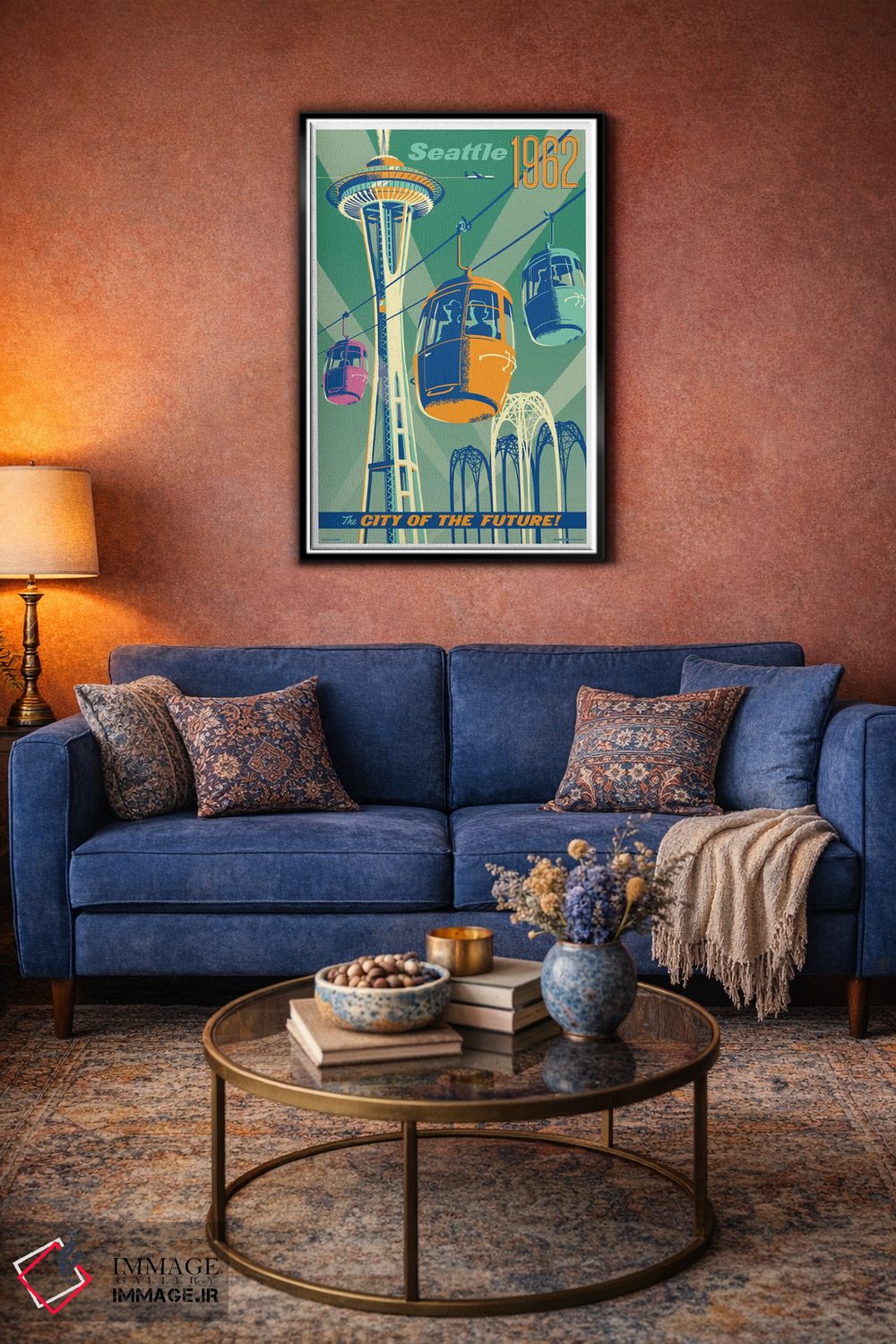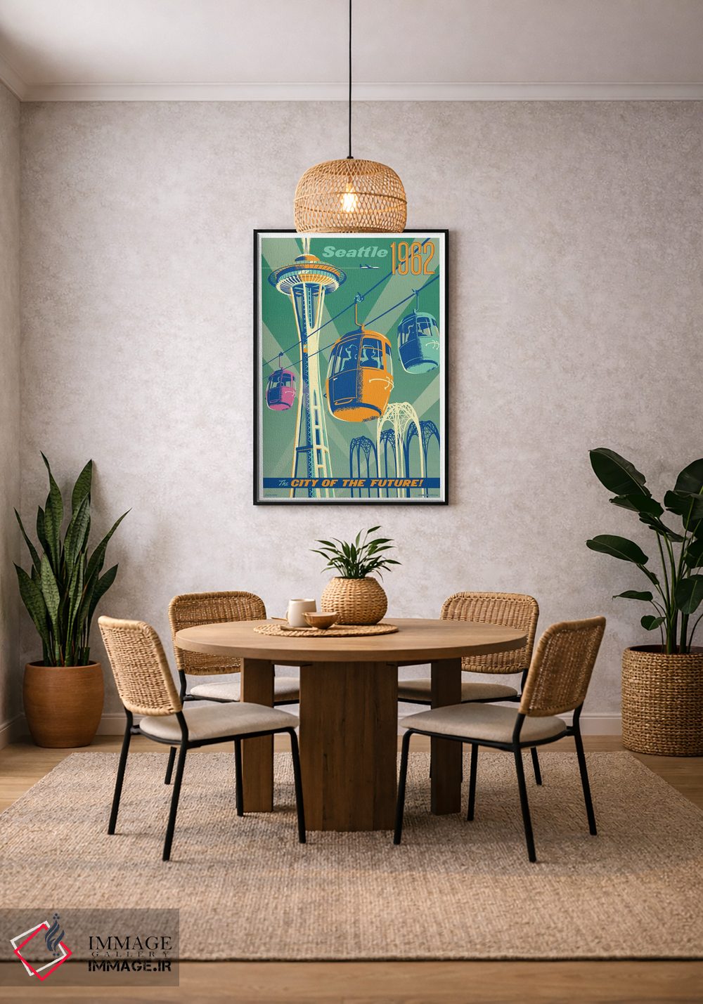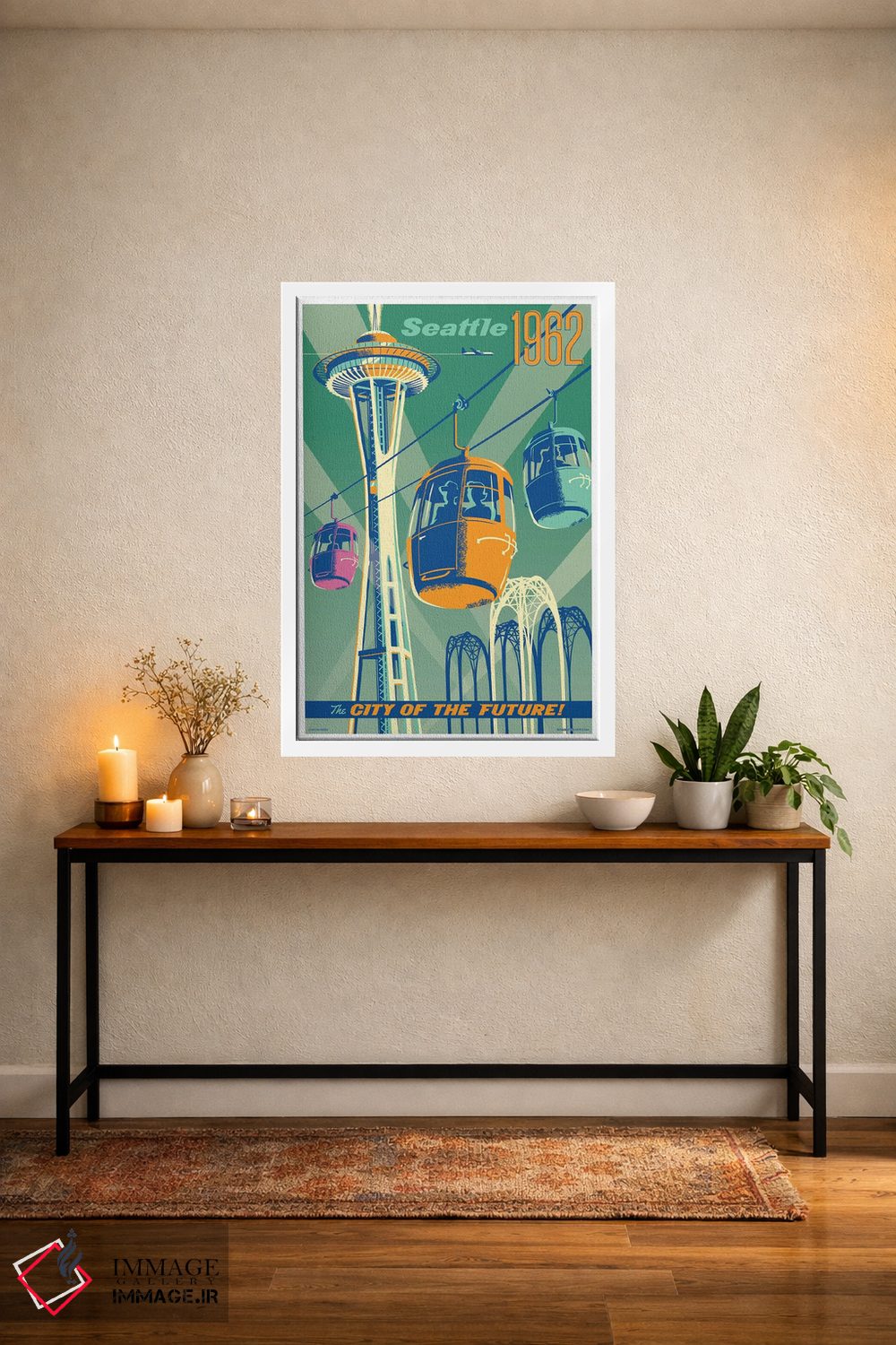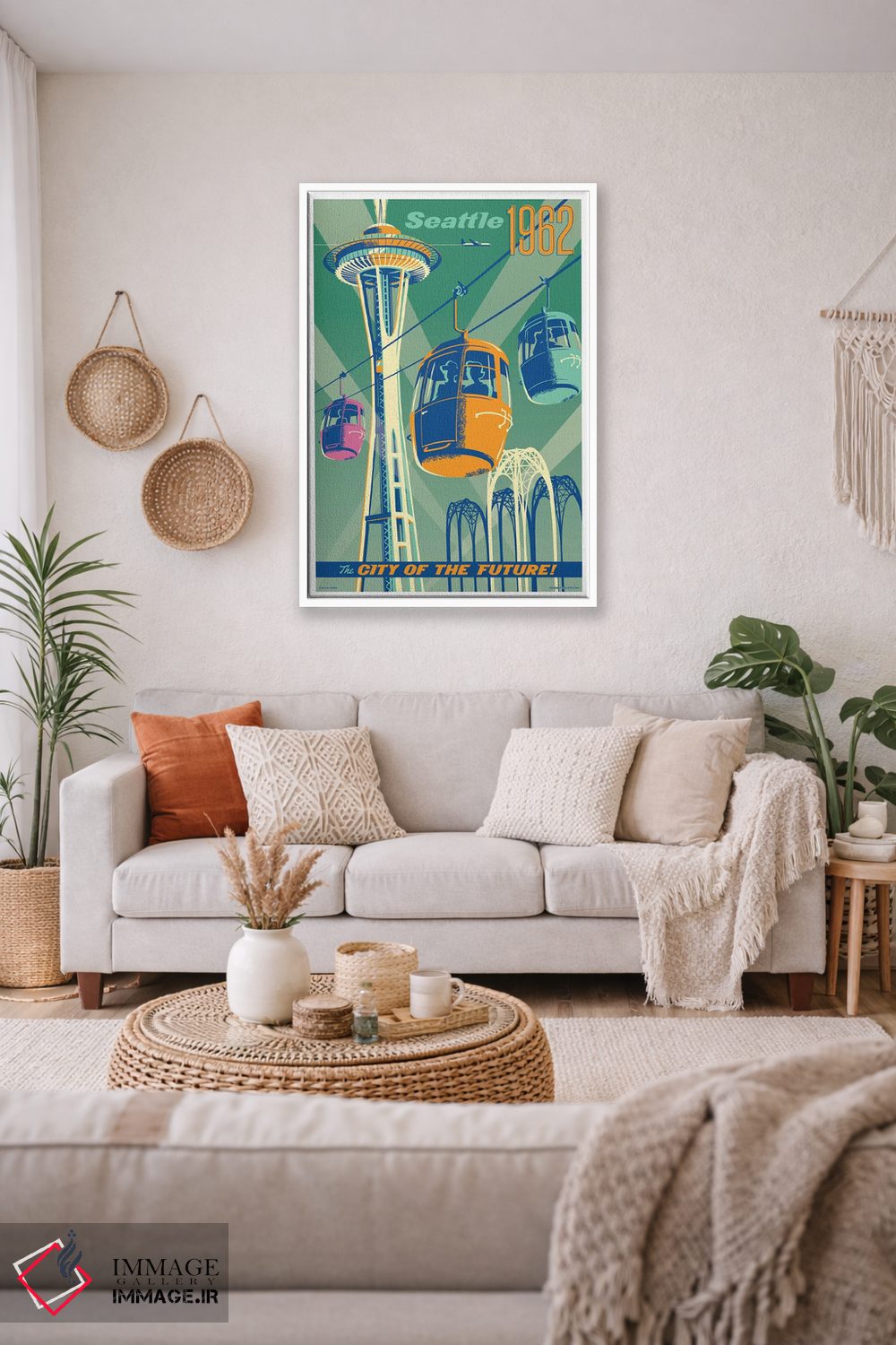این اثر با عنوان «پوستر سفر سیاتل ۱۹۶۲» اثرِ «جیم زانیسر»، تمیز و دقیق است؛ مناسب دیوارهای مینیمال.