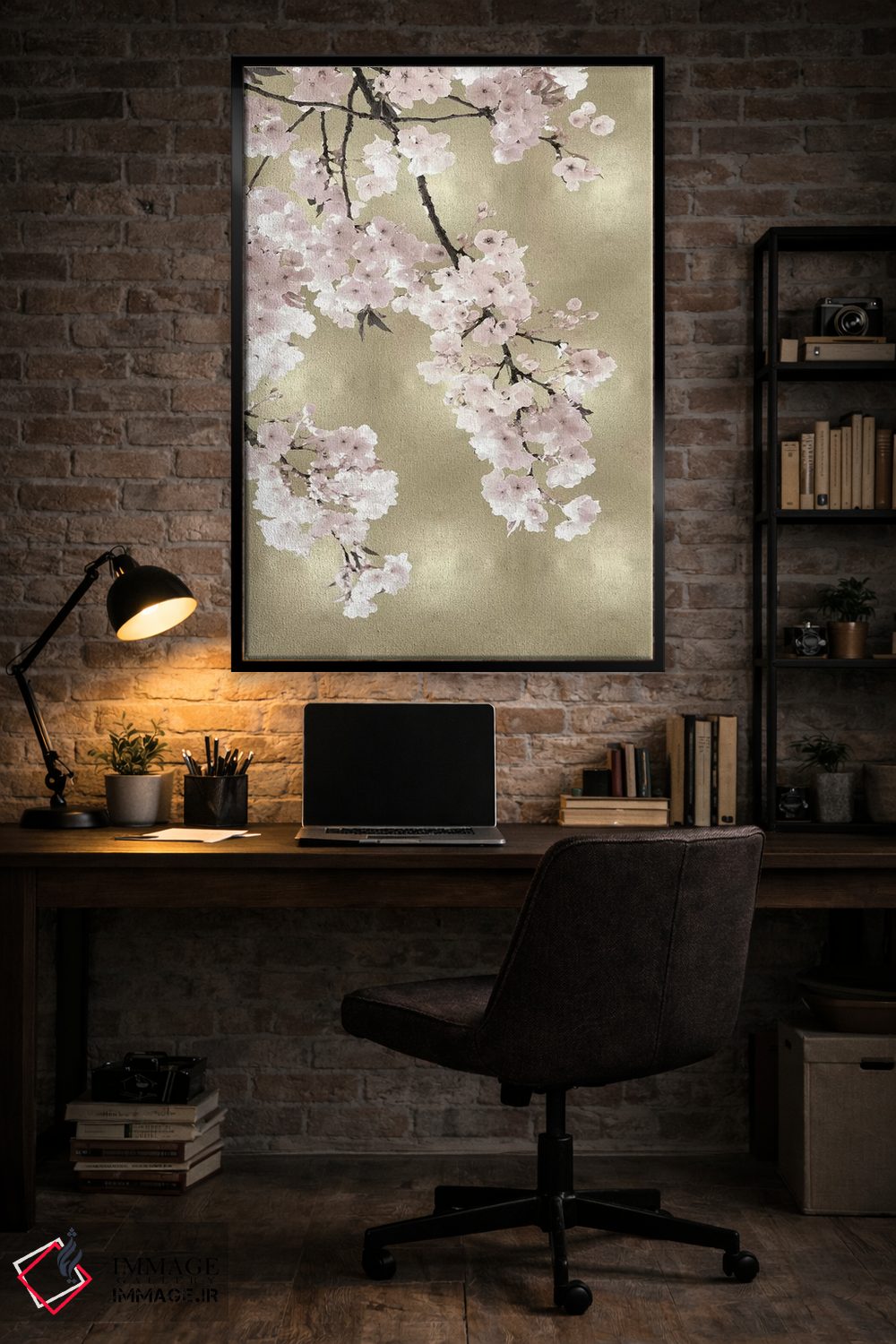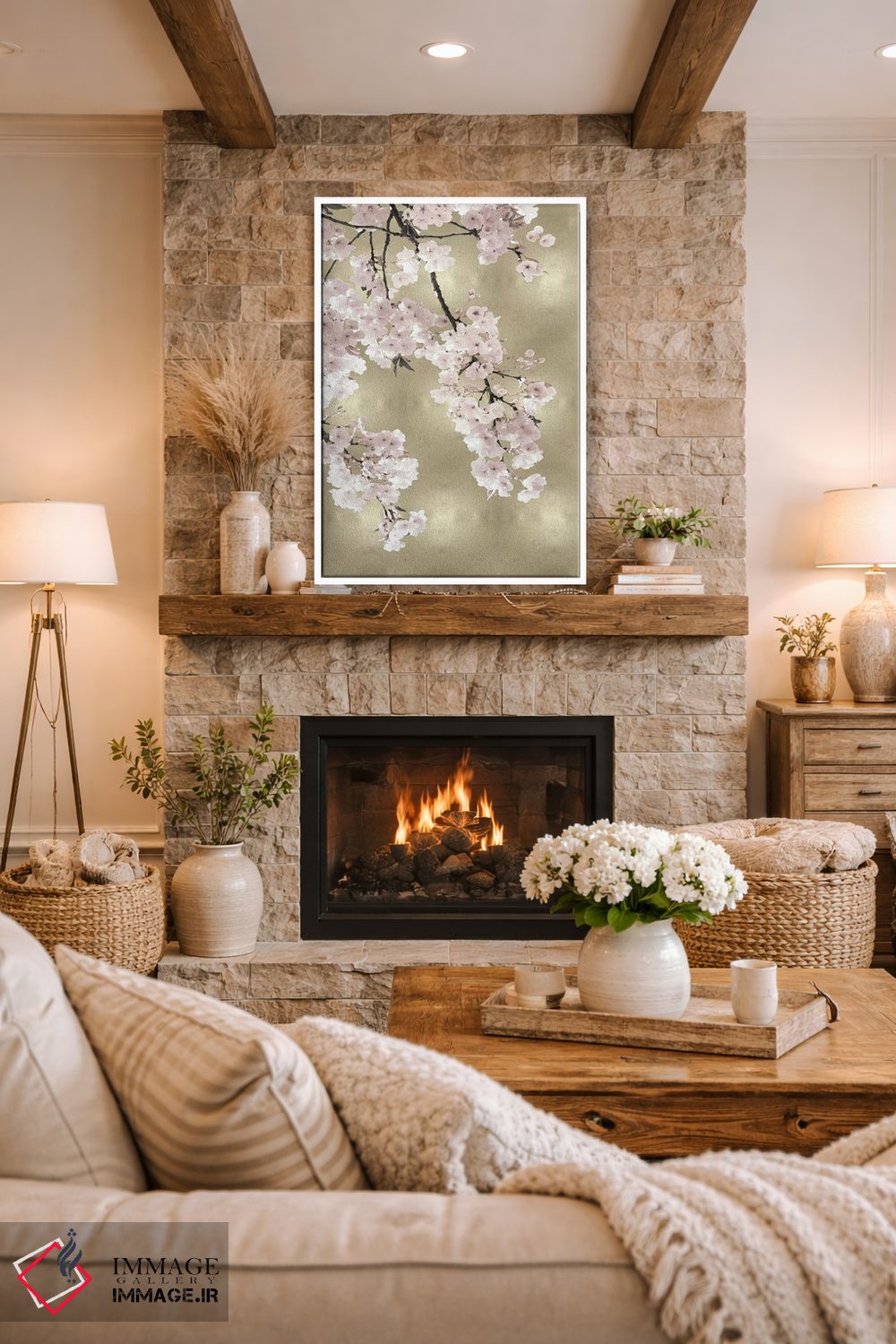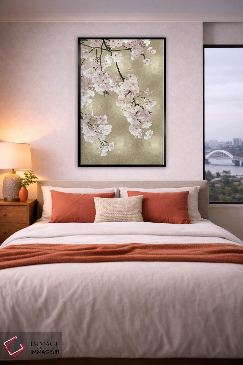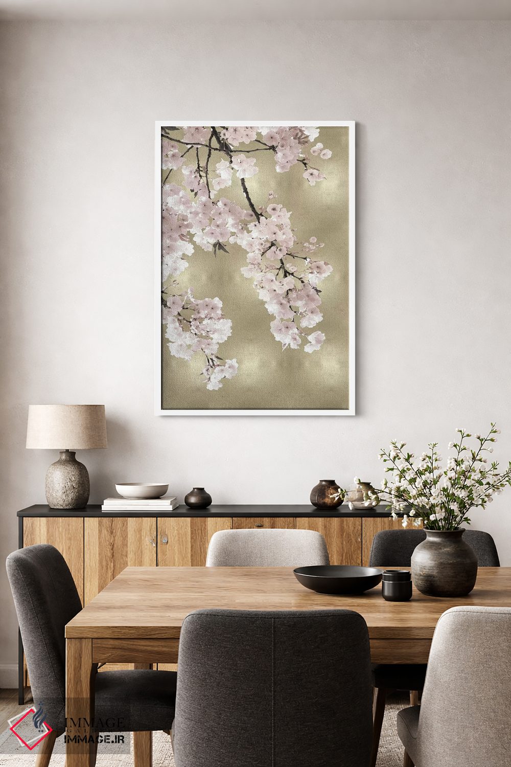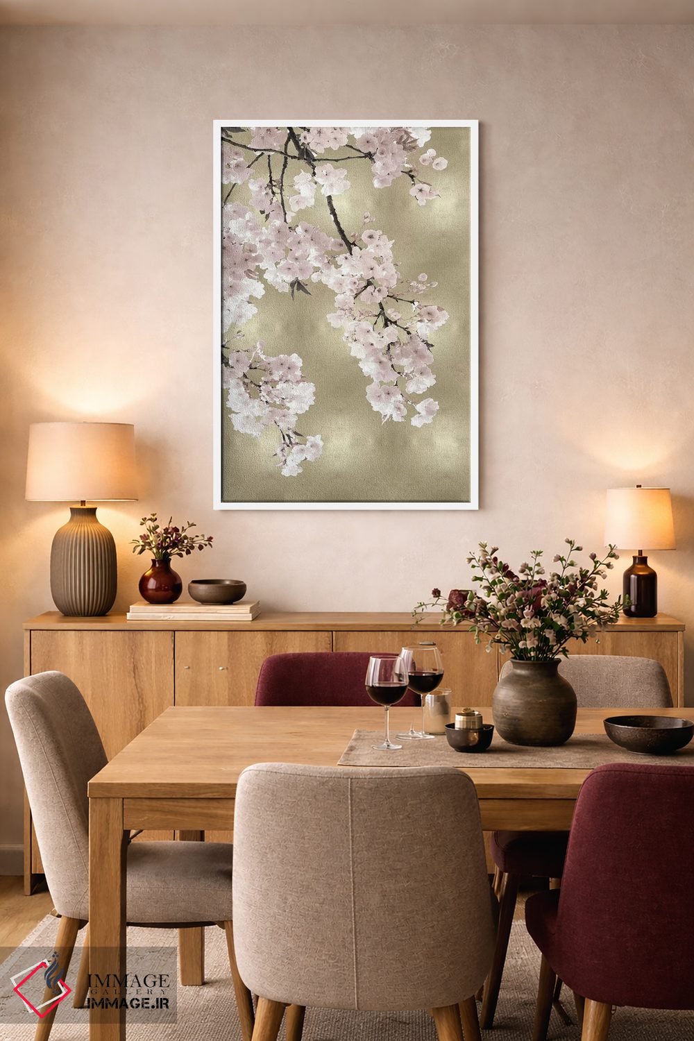 براساس پالت گرم اثر، قاب بلوط روشن (چوبی) پیشنهاد اول است و استخوانی ملایم مکمل. برای سفارشهای پروژهای با ابعاد و قابهای اختصاصی با ایماژ در تماس باشید.