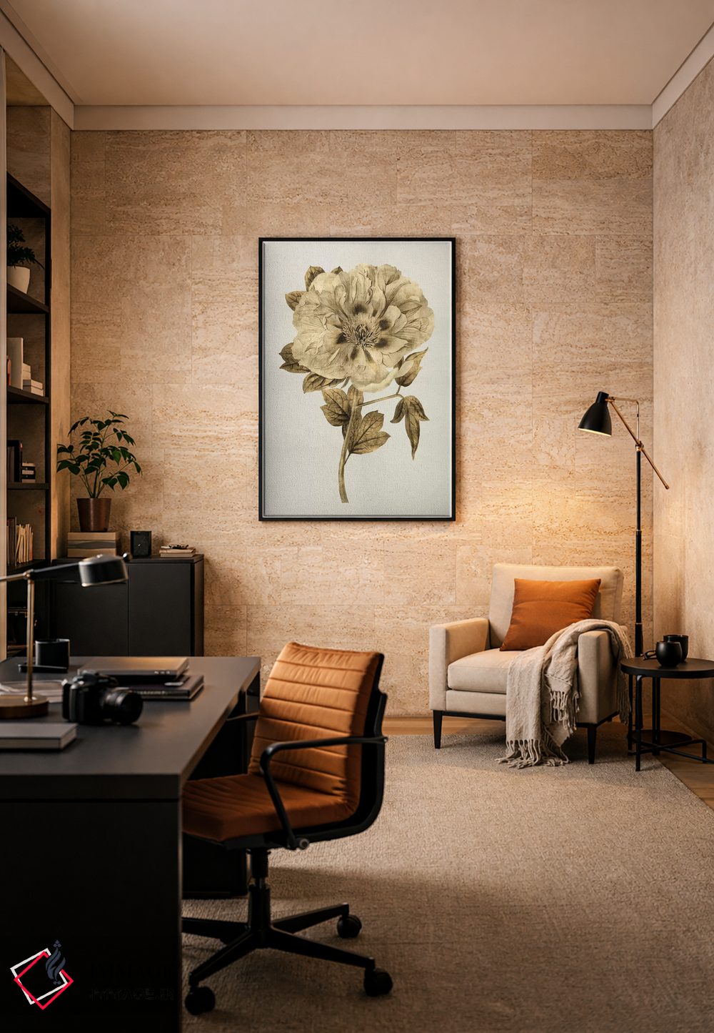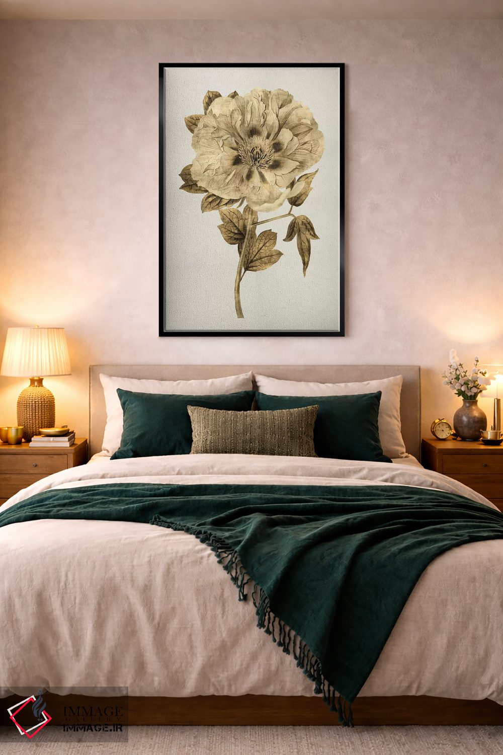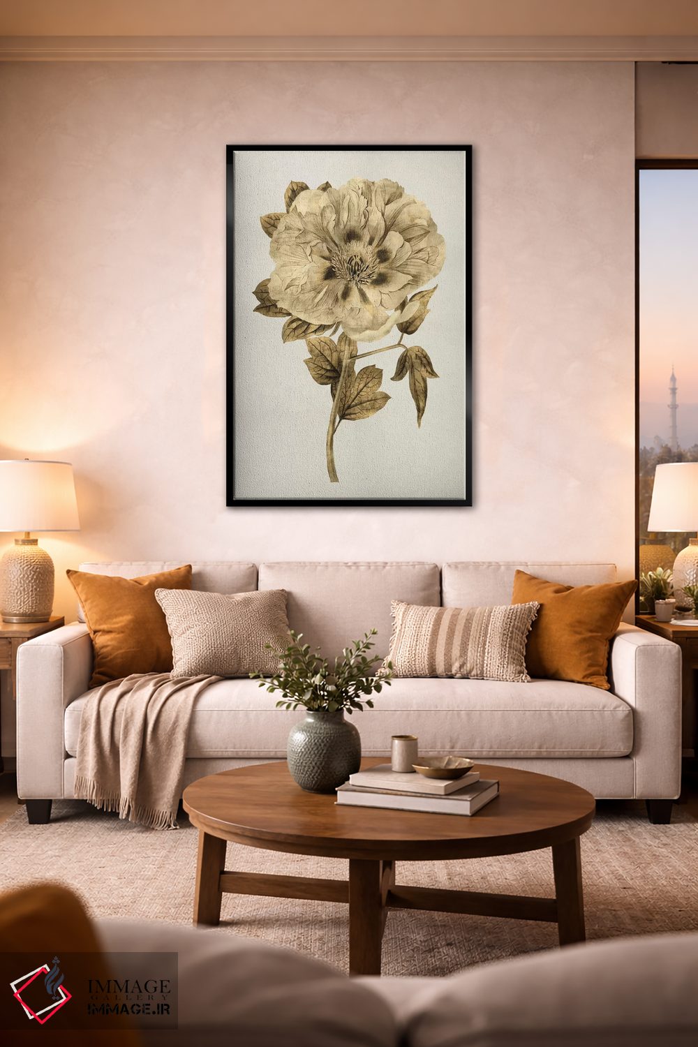 براساس پالت گرم اثر، قاب بلوط روشن (چوبی) پیشنهاد اول است و استخوانی ملایم مکمل. برای سفارشهای پروژهای با ابعاد و قابهای اختصاصی با ایماژ در تماس باشید.
