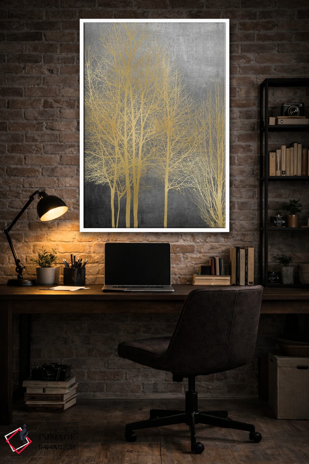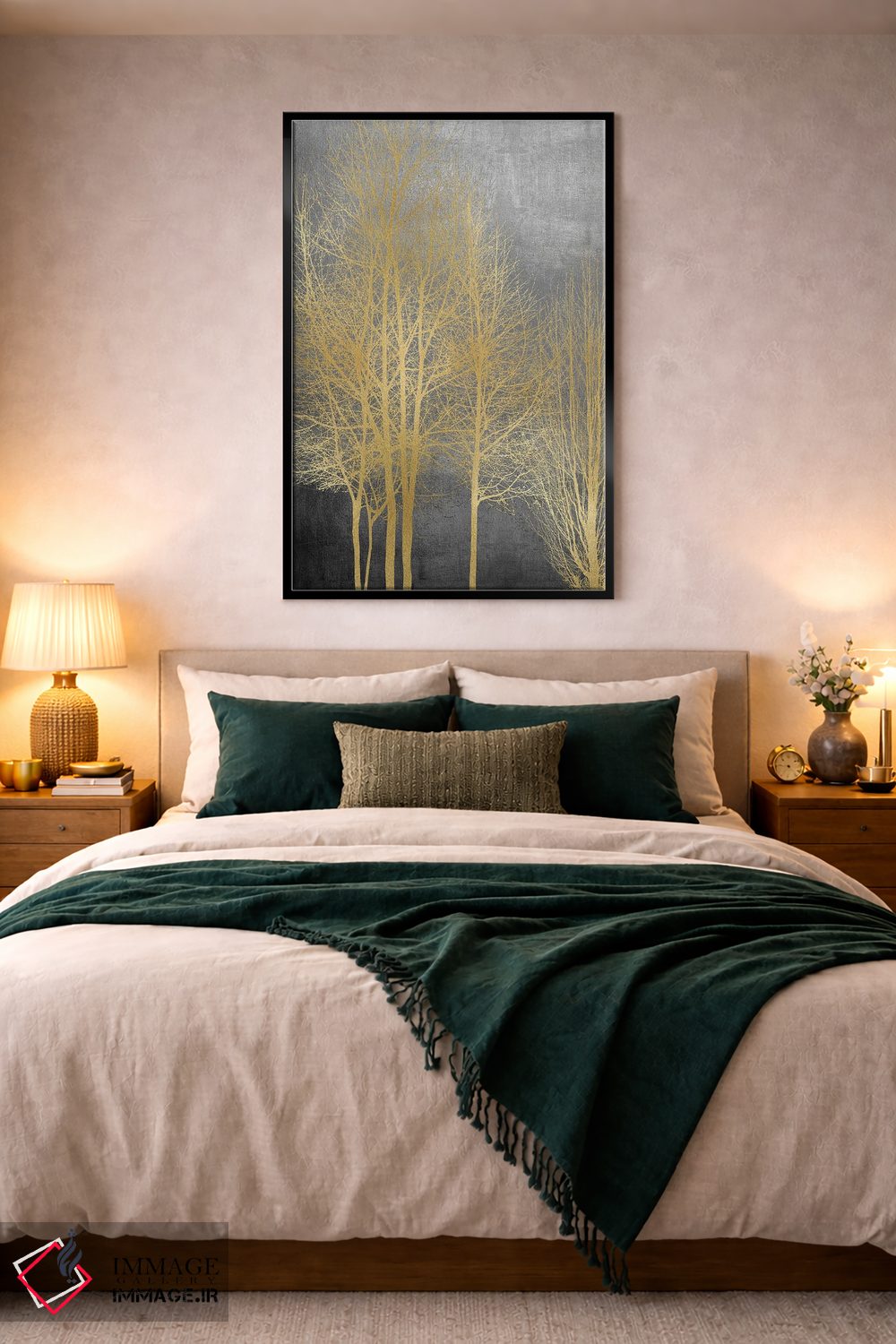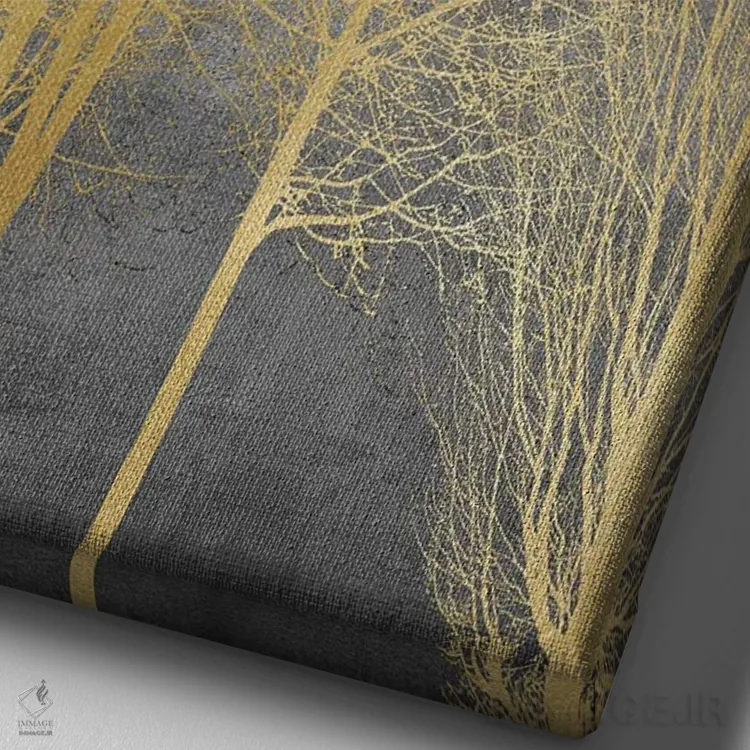 در «درختان طلایی روی پنل خاکستری I» اثرِ «کیت بنت»، عناصر گیاهی نقش اصلی دارند؛ مناسب برای فضاهایی که دنبال آرامش و لطافت پُرانرژی.