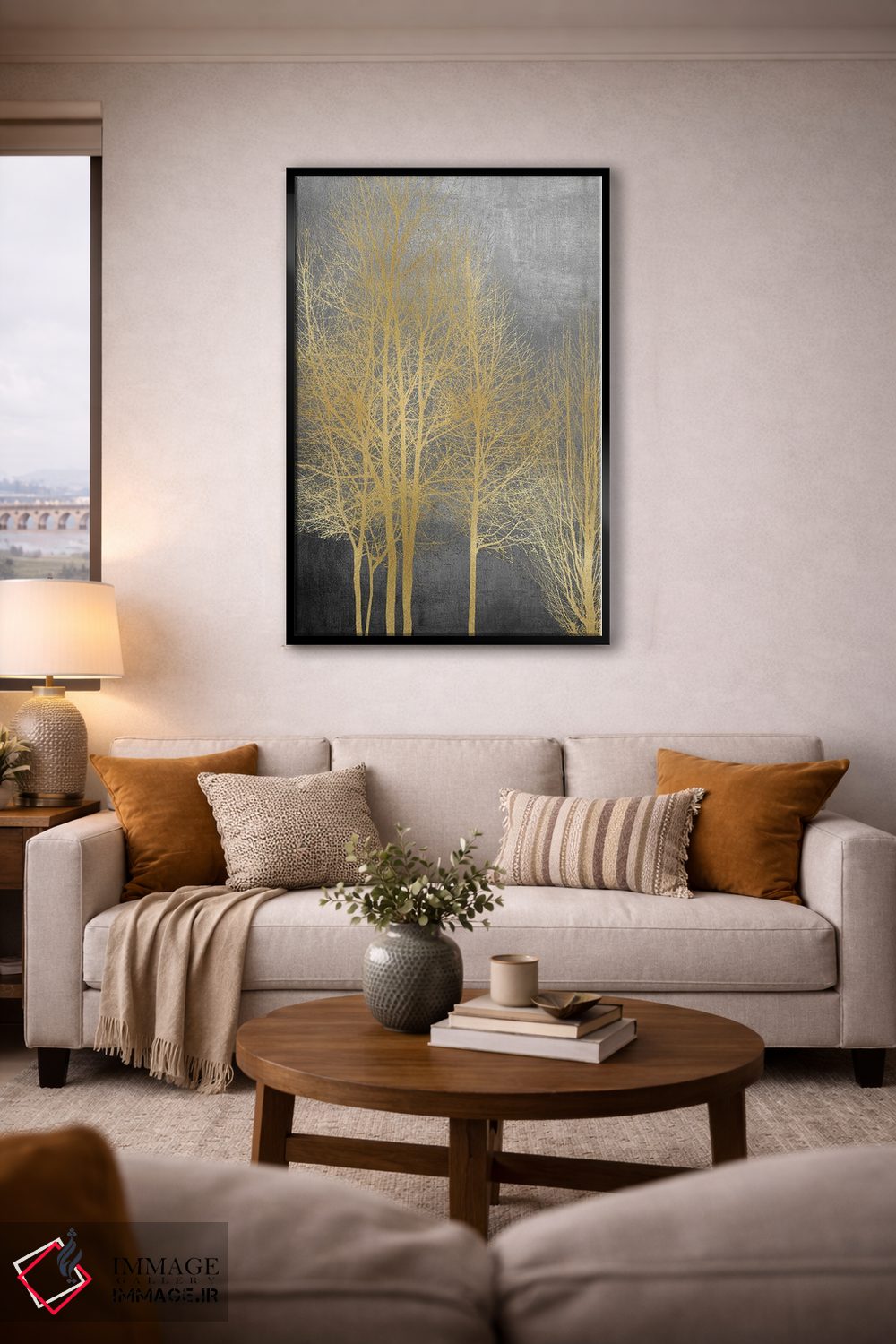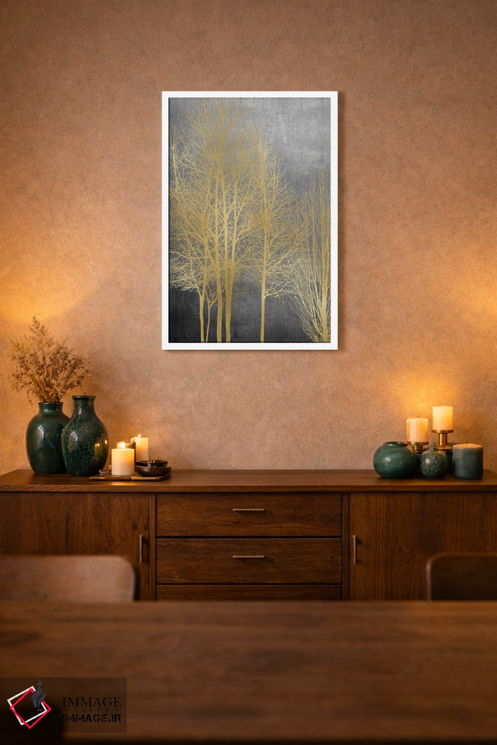 براساس پالت گرم اثر، قاب بلوط روشن (چوبی) پیشنهاد اول است و استخوانی ملایم مکمل. برای سفارشهای پروژهای با ابعاد و قابهای اختصاصی با ایماژ در تماس باشید.