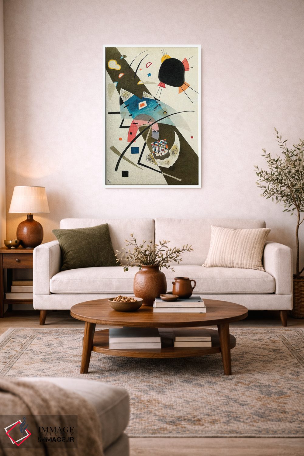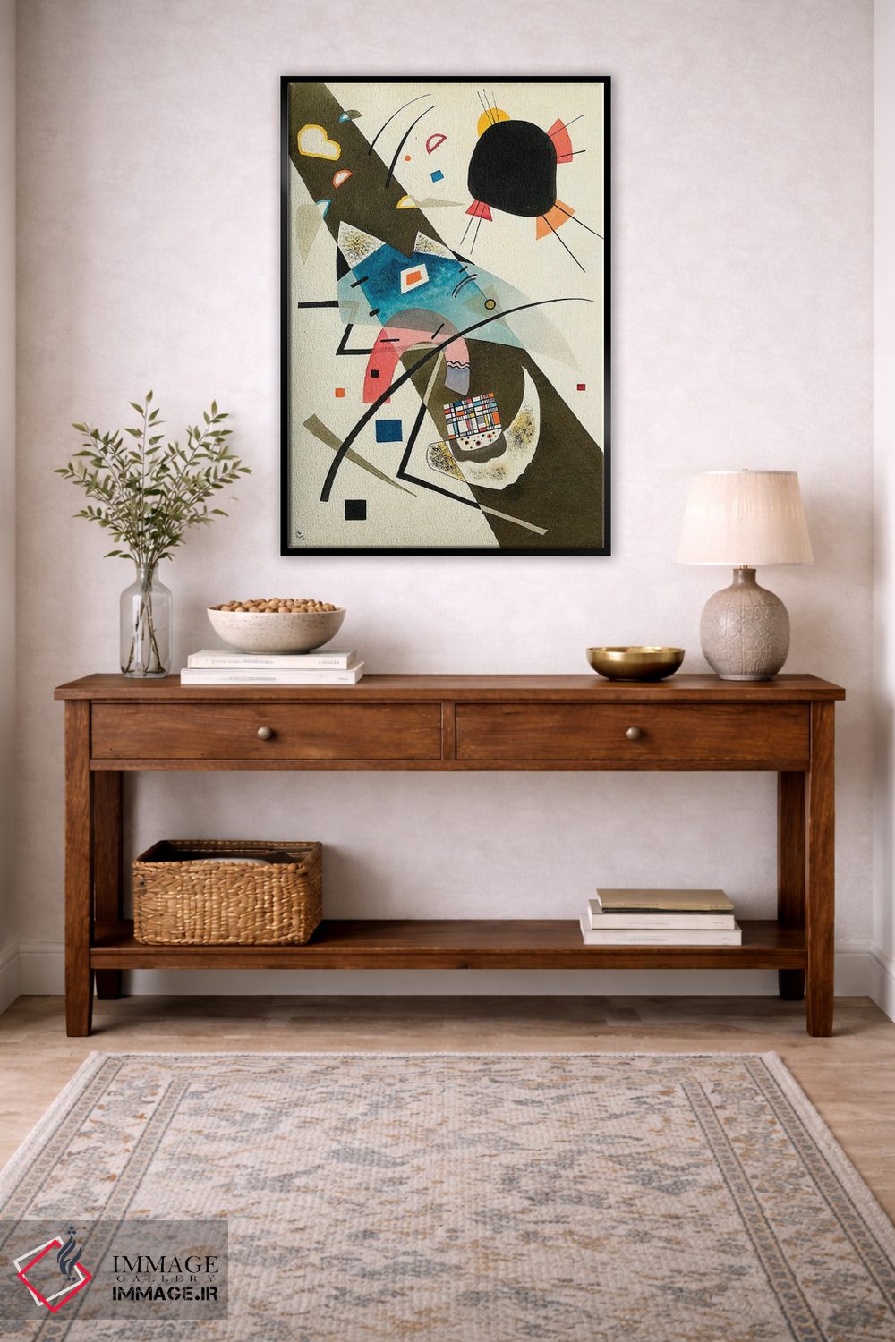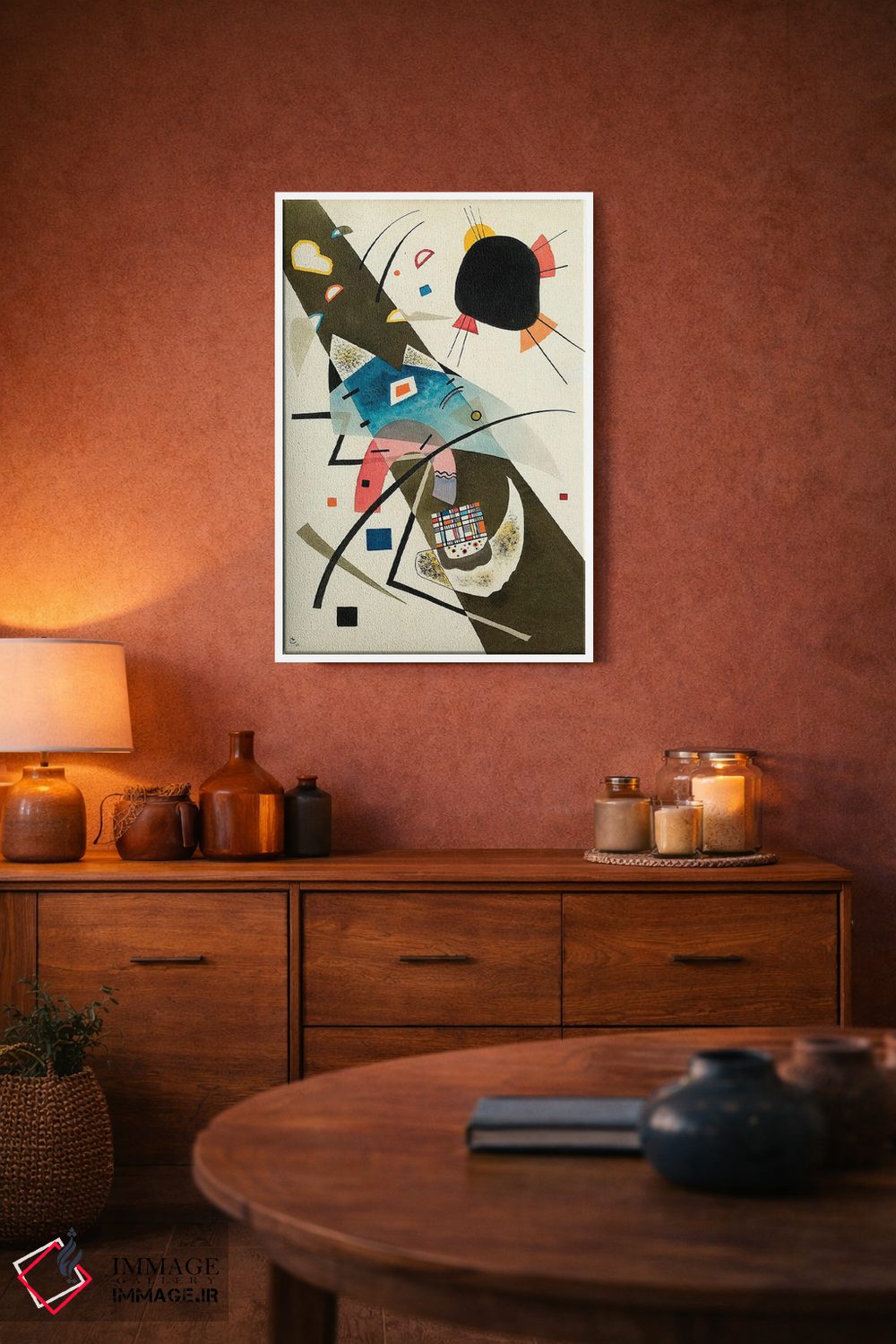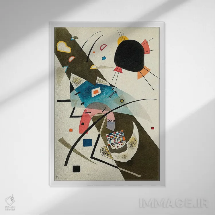 اگر دوست دارید فضا را با یک کار انتزاعی متعادل کنید، این اثر گزینهی شیک و مطمئن و هماهنگپذیری است اثرِ «واسیلی کانباورسکی (نقاش روس بنیانگذار انتزاعی)».