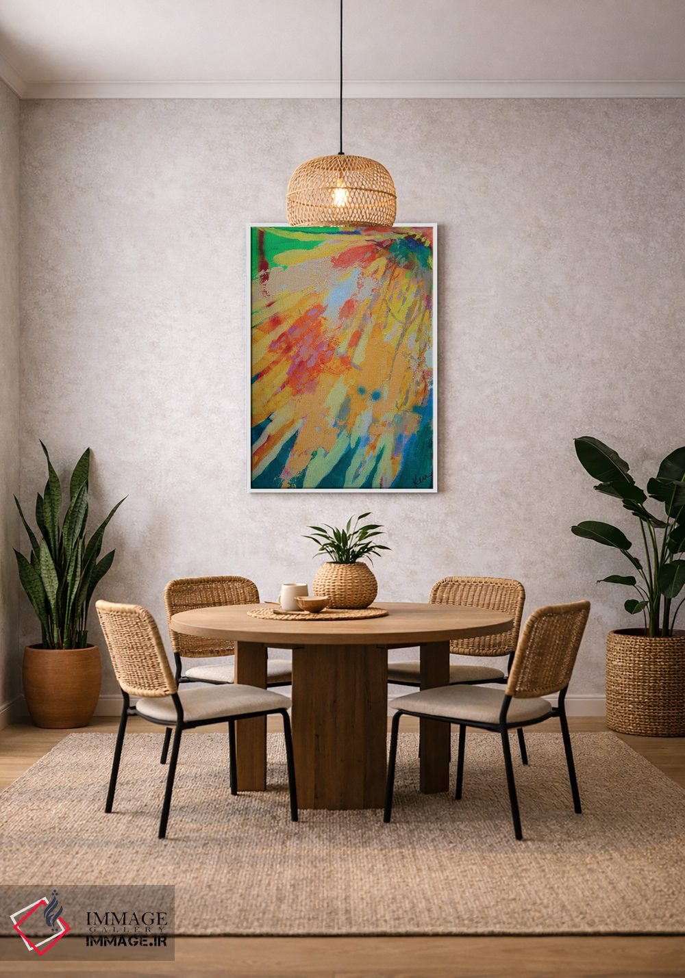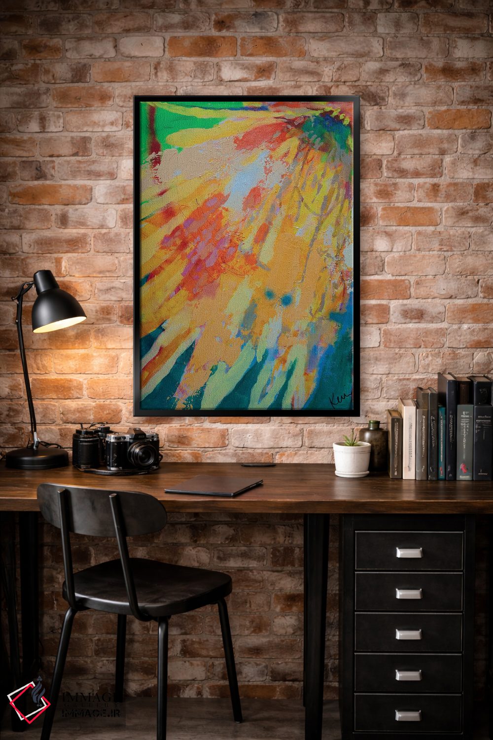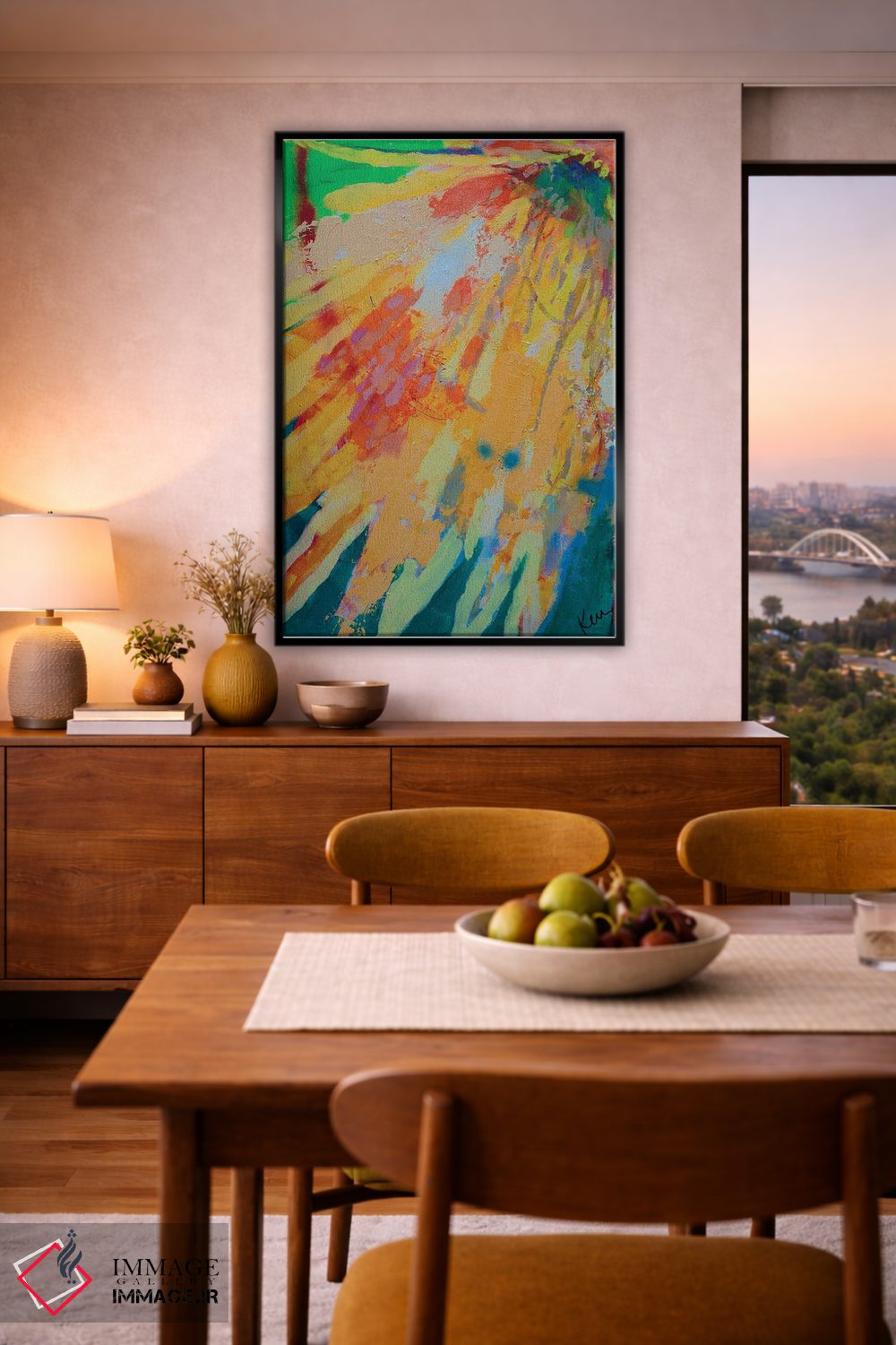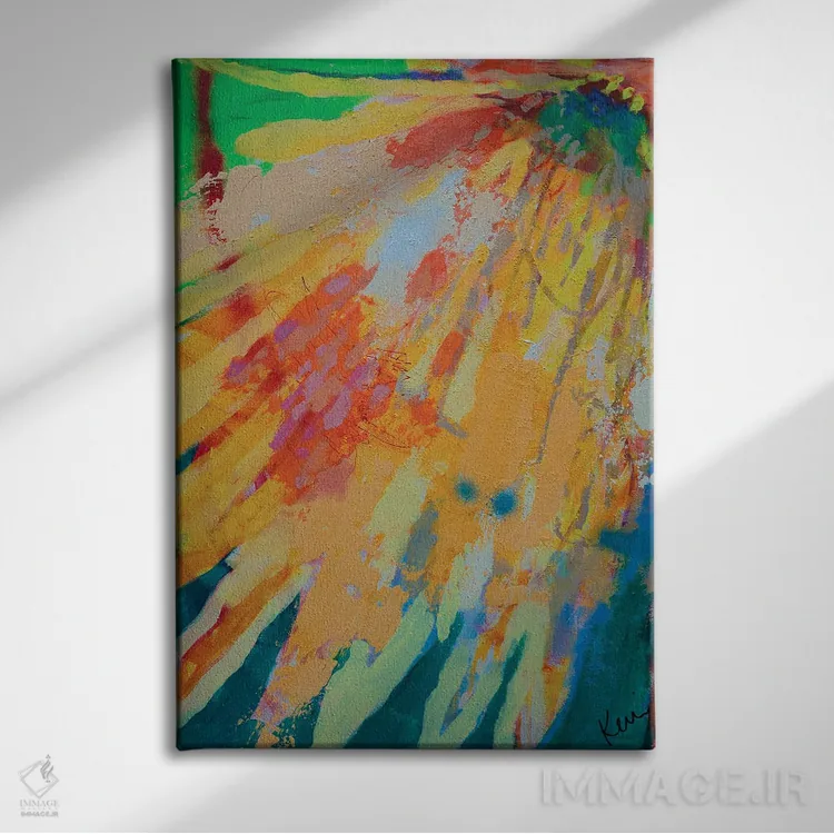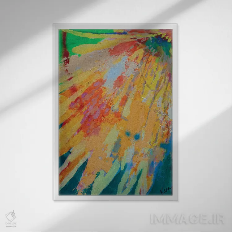 براساس پالت ترکیبی اثر، قاب تیک گرم (چوبی) پیشنهاد اول است و مشکی مات (فریم متوسط) مکمل. برای سفارشهای پروژهای با ابعاد و قابهای اختصاصی با ایماژ در تماس باشید.