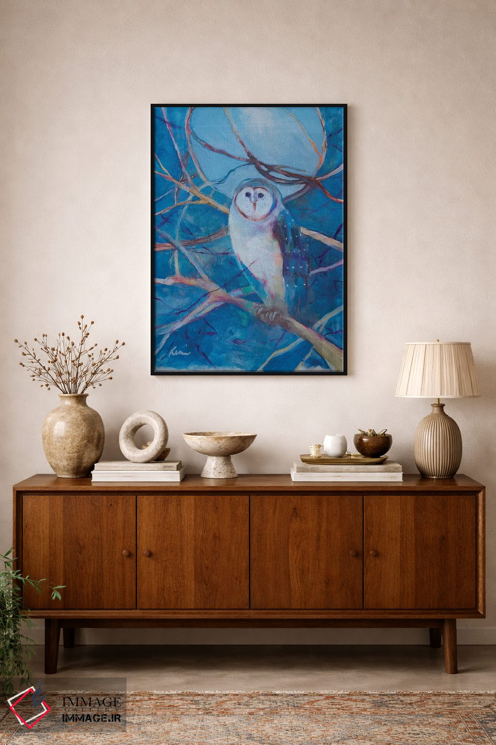براساس پالت ترکیبی اثر، قاب تیک گرم (چوبی) پیشنهاد اول است و مشکی مات (فریم متوسط) مکمل. برای سفارشهای پروژهای با ابعاد و قابهای اختصاصی با ایماژ در تماس باشید.