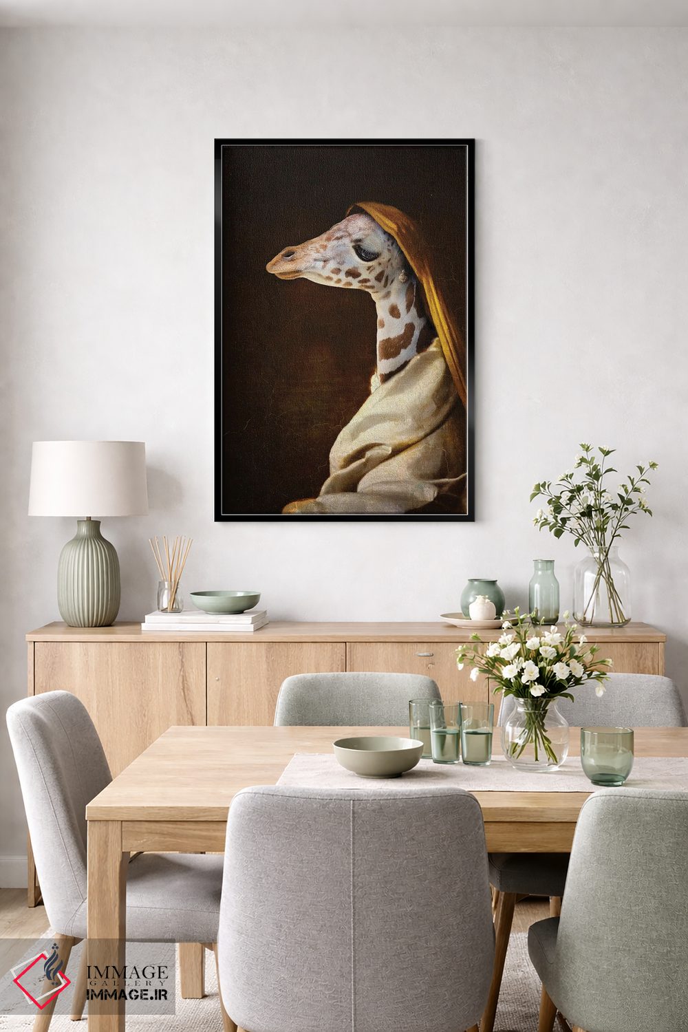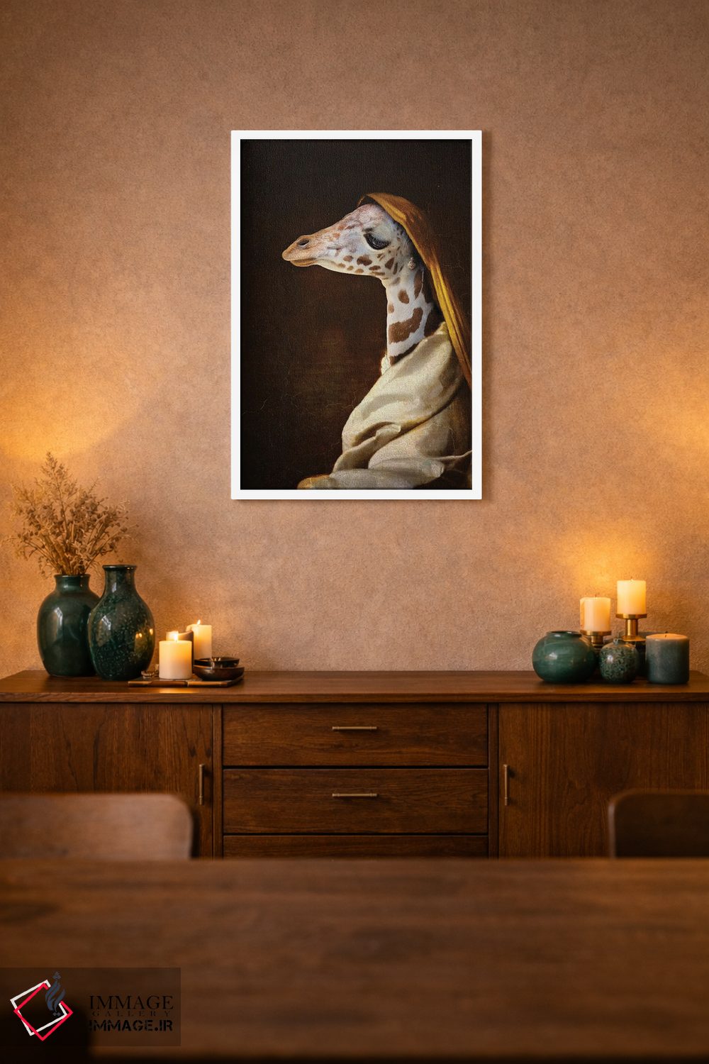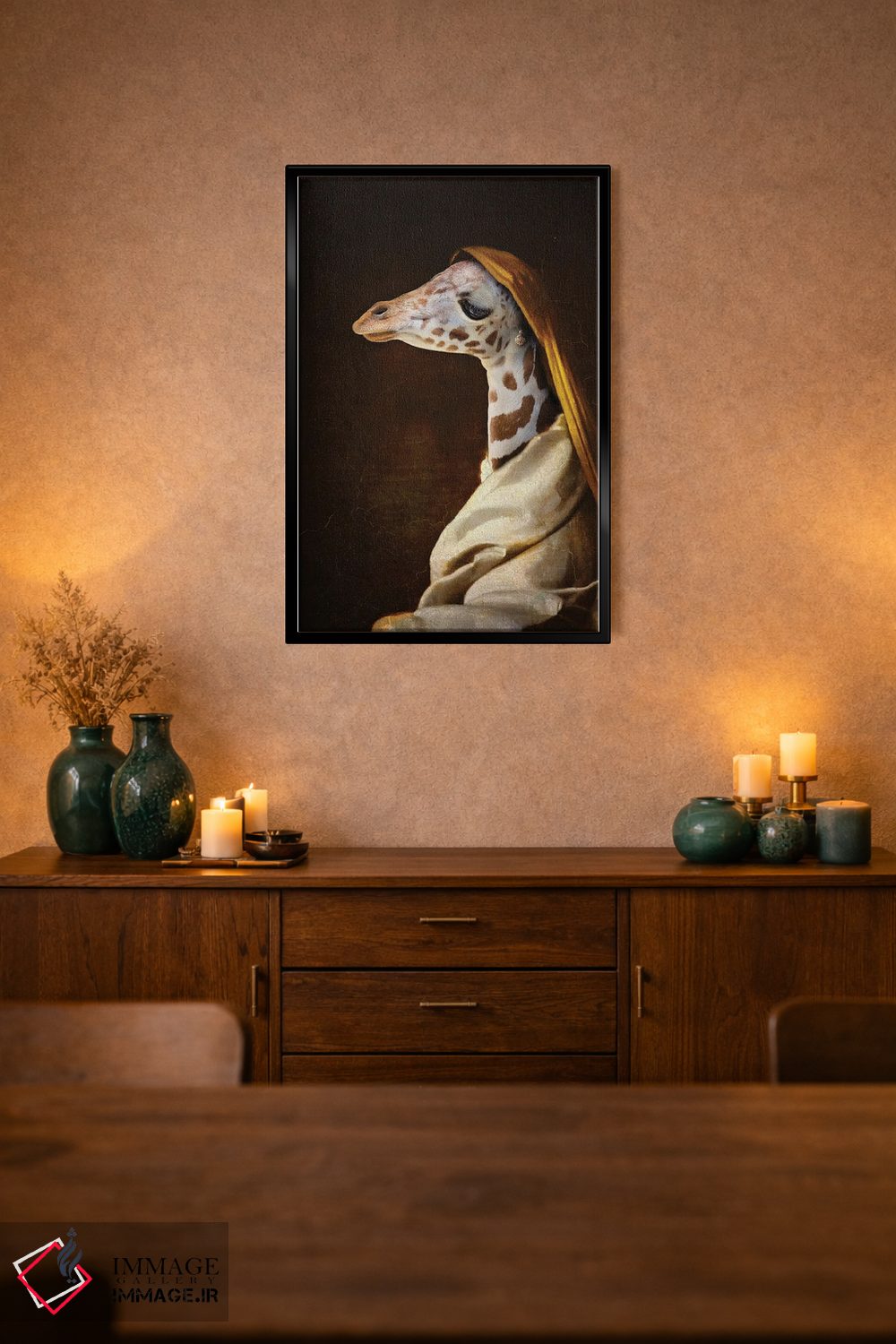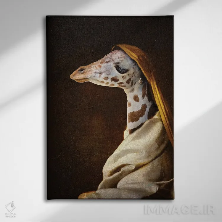 اگر به آثار حیوانات علاقه دارید، «پرتره زرافه جوان» اثرِ «کارن بورک» به دیوار، انرژیِ نرم و زنده میدهد، برای فضاهای روستیک یا بوهو گزینهٔ مناسبیست. با قاب چوبی یا مشکی، حس مرتبتری پیدا میکند.