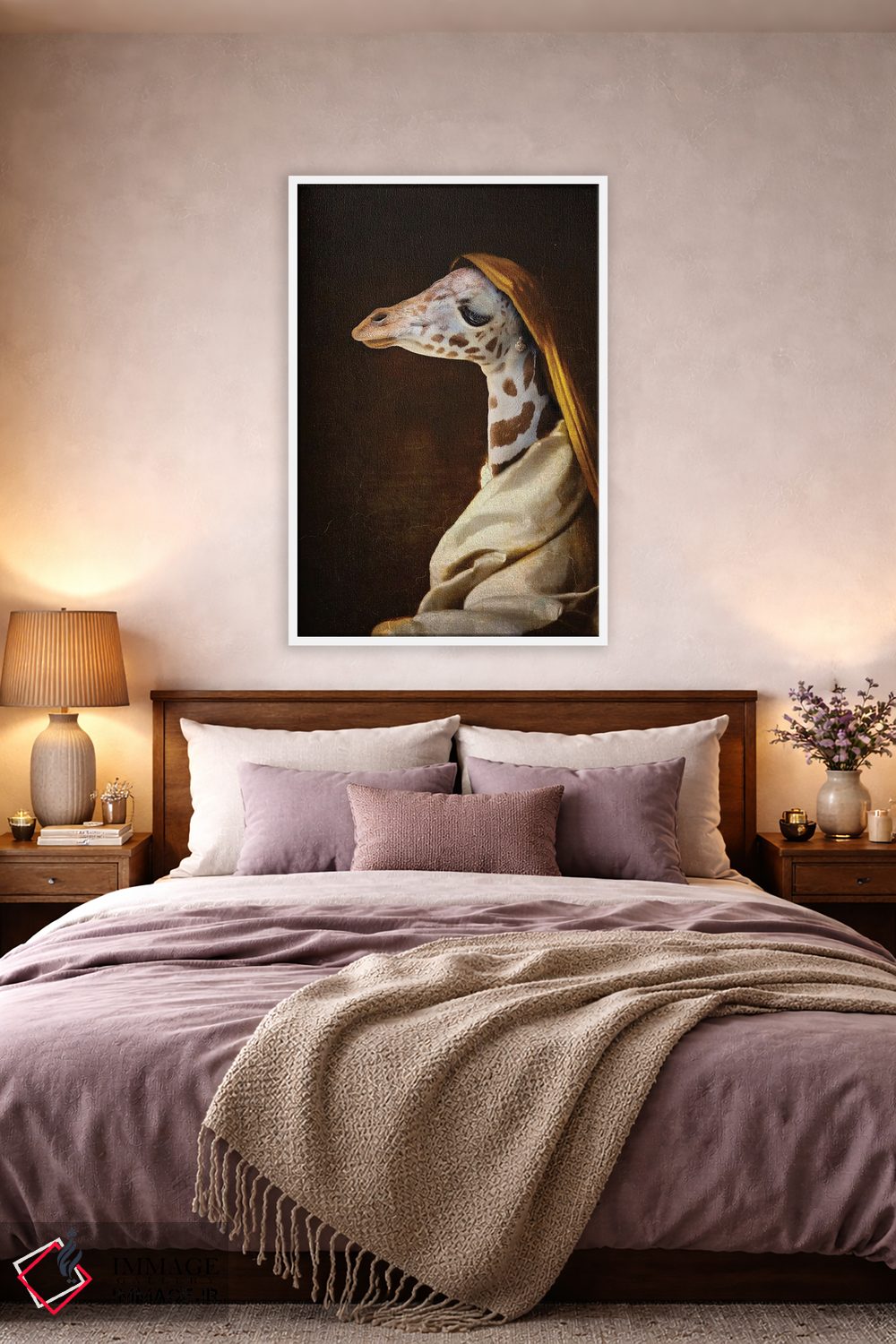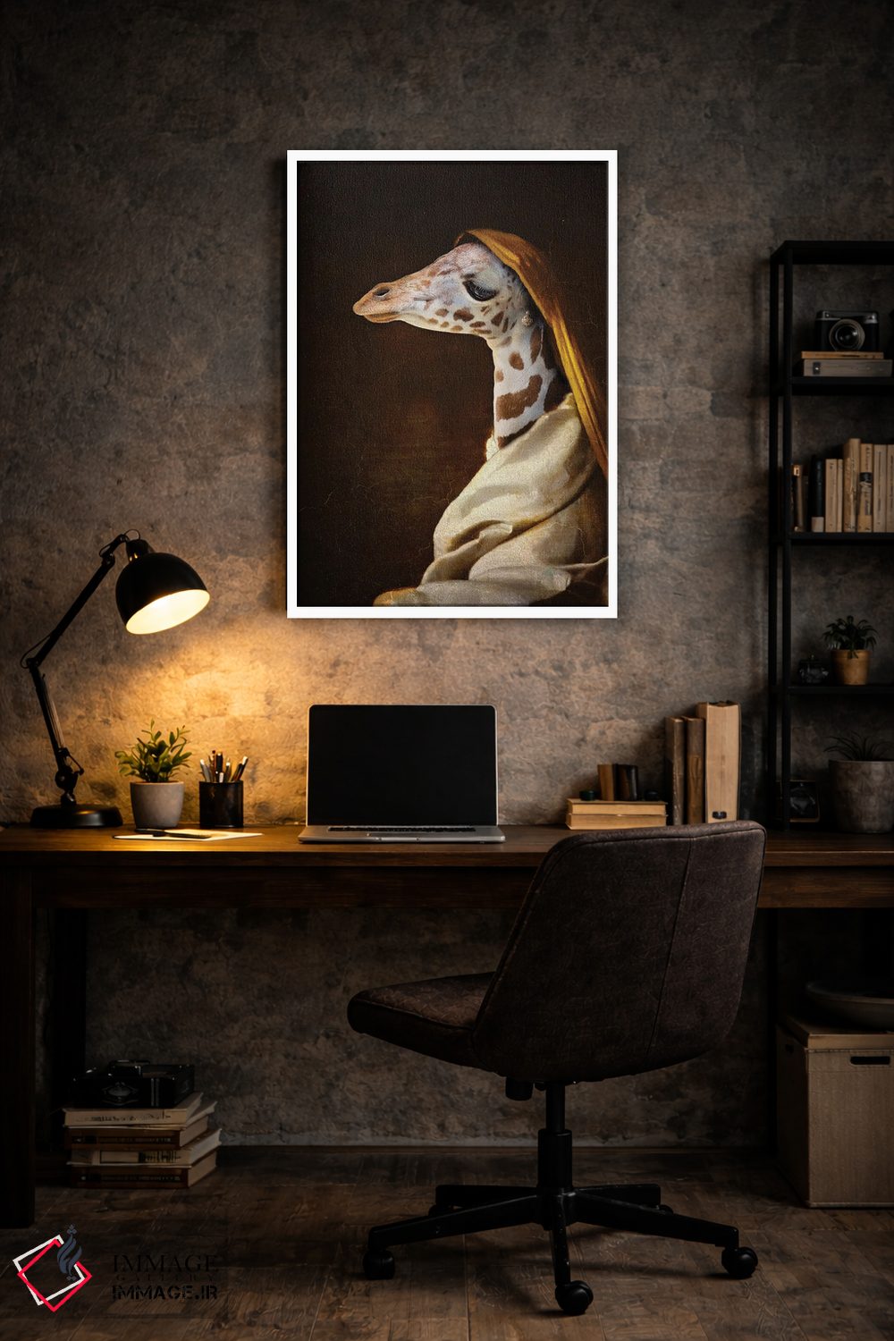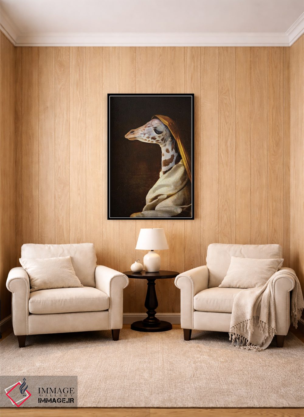 اگر به آثار حیوانات علاقه دارید، «پرتره زرافه جوان» اثرِ «کارن بورک» به دیوار، انرژیِ نرم و زنده میدهد، برای فضاهای روستیک یا بوهو گزینهٔ مناسبیست. با قاب چوبی یا مشکی، حس مرتبتری پیدا میکند.