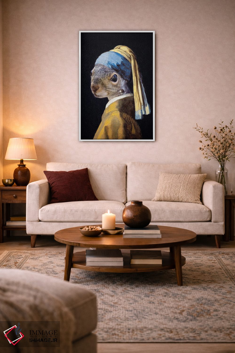 برای دیوارهای ساده، «سنجاب با گوشواره مروارید» اثرِ «کارن بورک» به دیوار، انرژیِ نرم و زنده میدهد؛ برای خانههایی با چوب و پارچههای گرم انتخابی خوشسلیقه است. با نورپردازی نقطهای، جذابتر هم میشود.