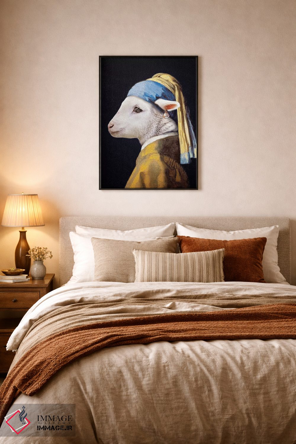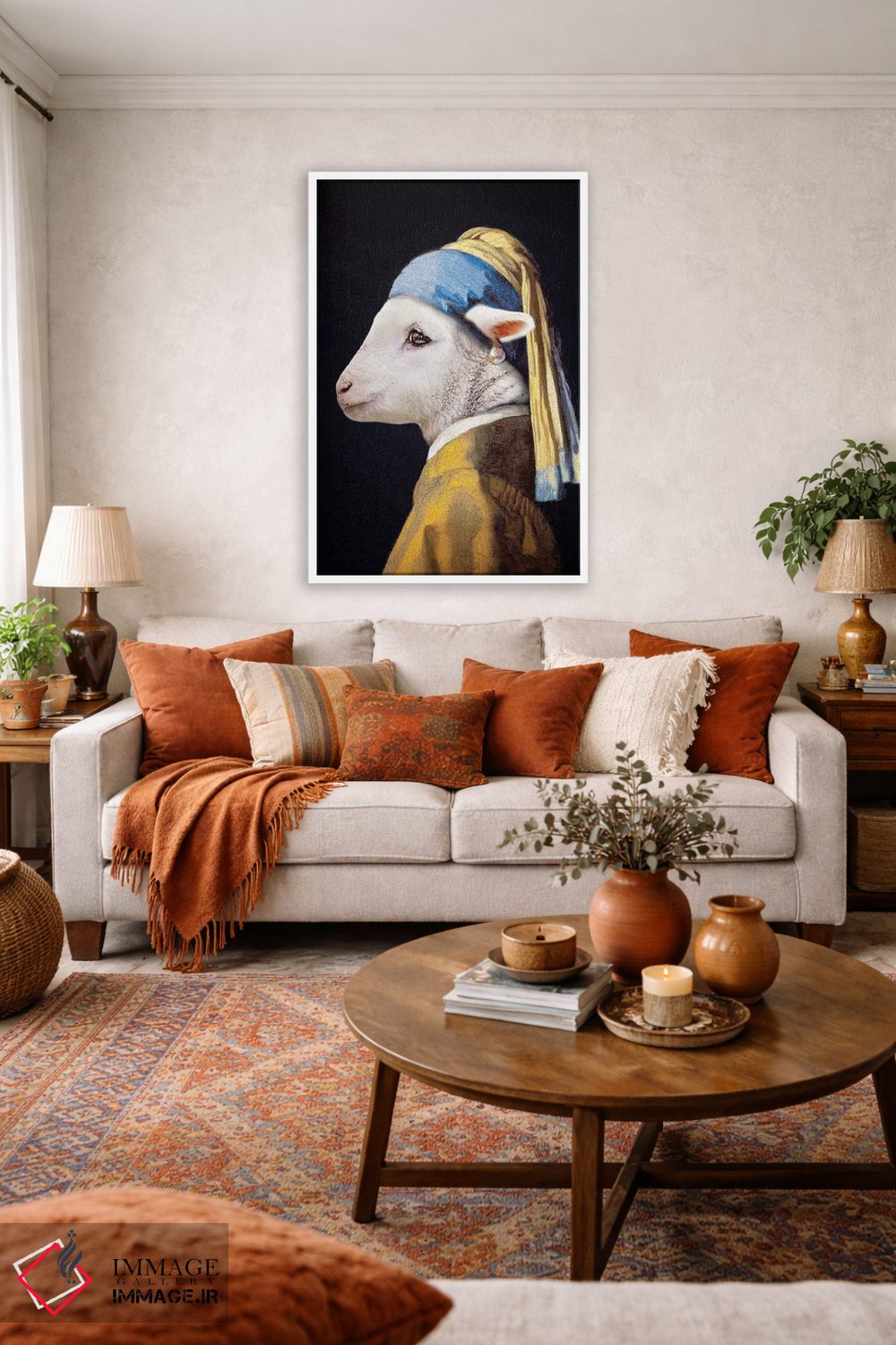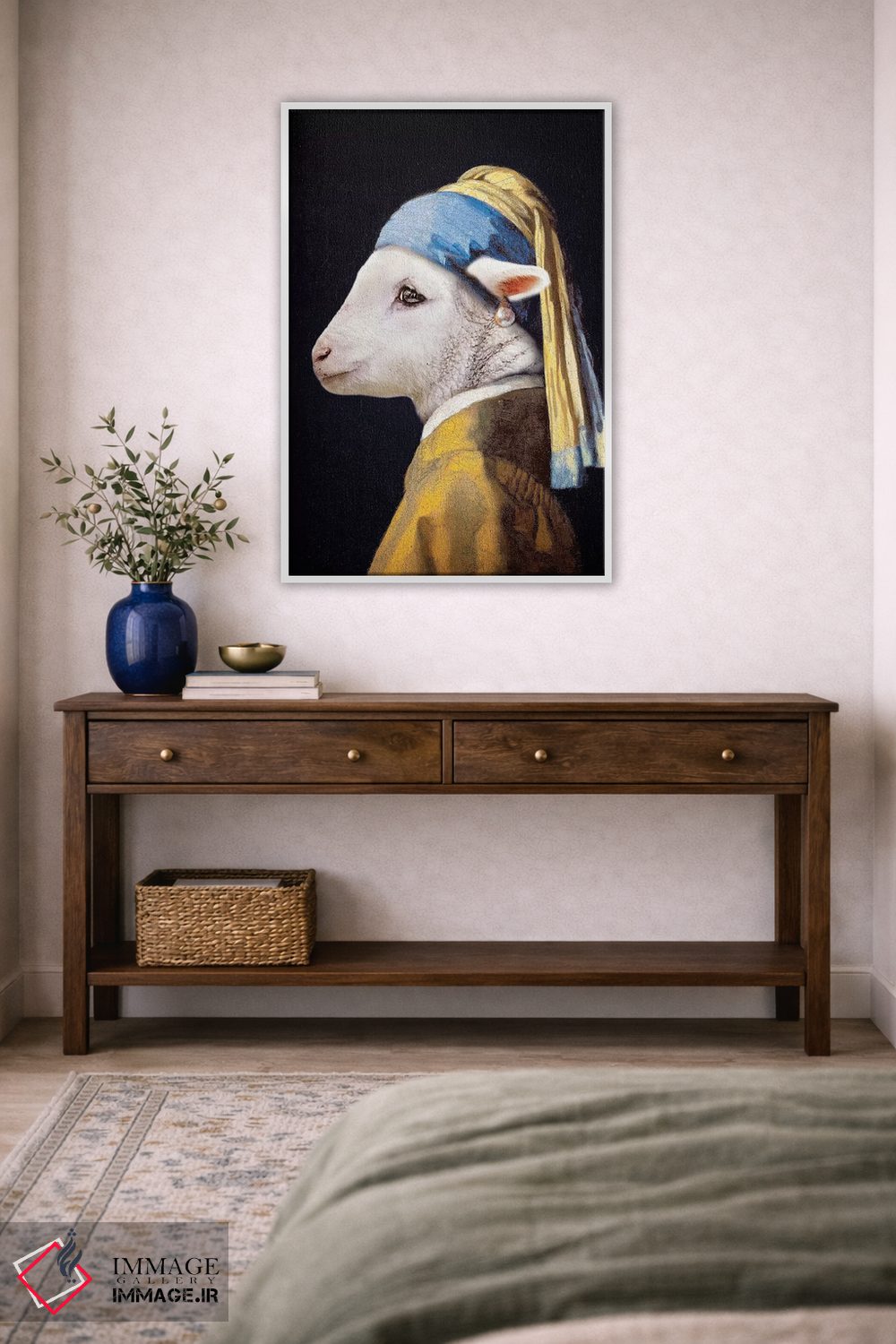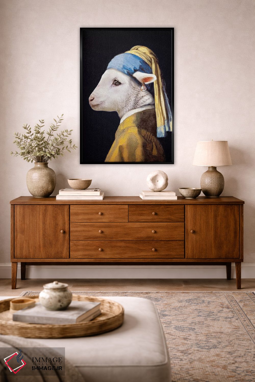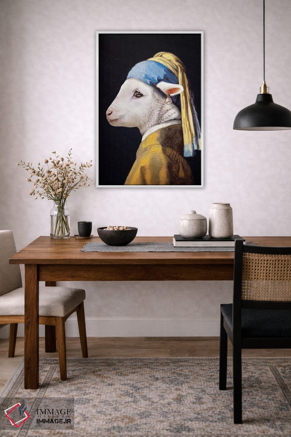 برای اتاقی که به یک عنصر دوستداشتنی نیاز دارد، «بره با گوشواره مروارید» اثرِ «کارن بورک» برای دکورهای مینیمال، یک نقطهٔ توجه میسازد؛ برای فضاهای روستیک یا بوهو انتخابی خوشسلیقه است. در کنار گیاهان و نور طبیعی، جذابتر هم میشود.
