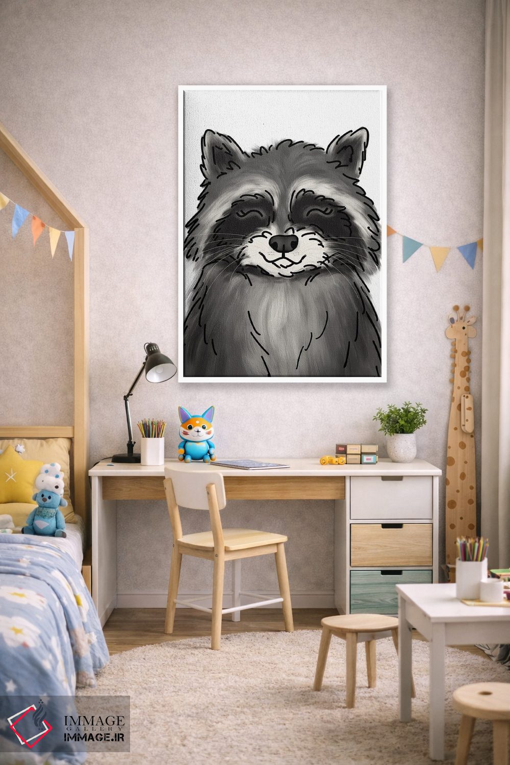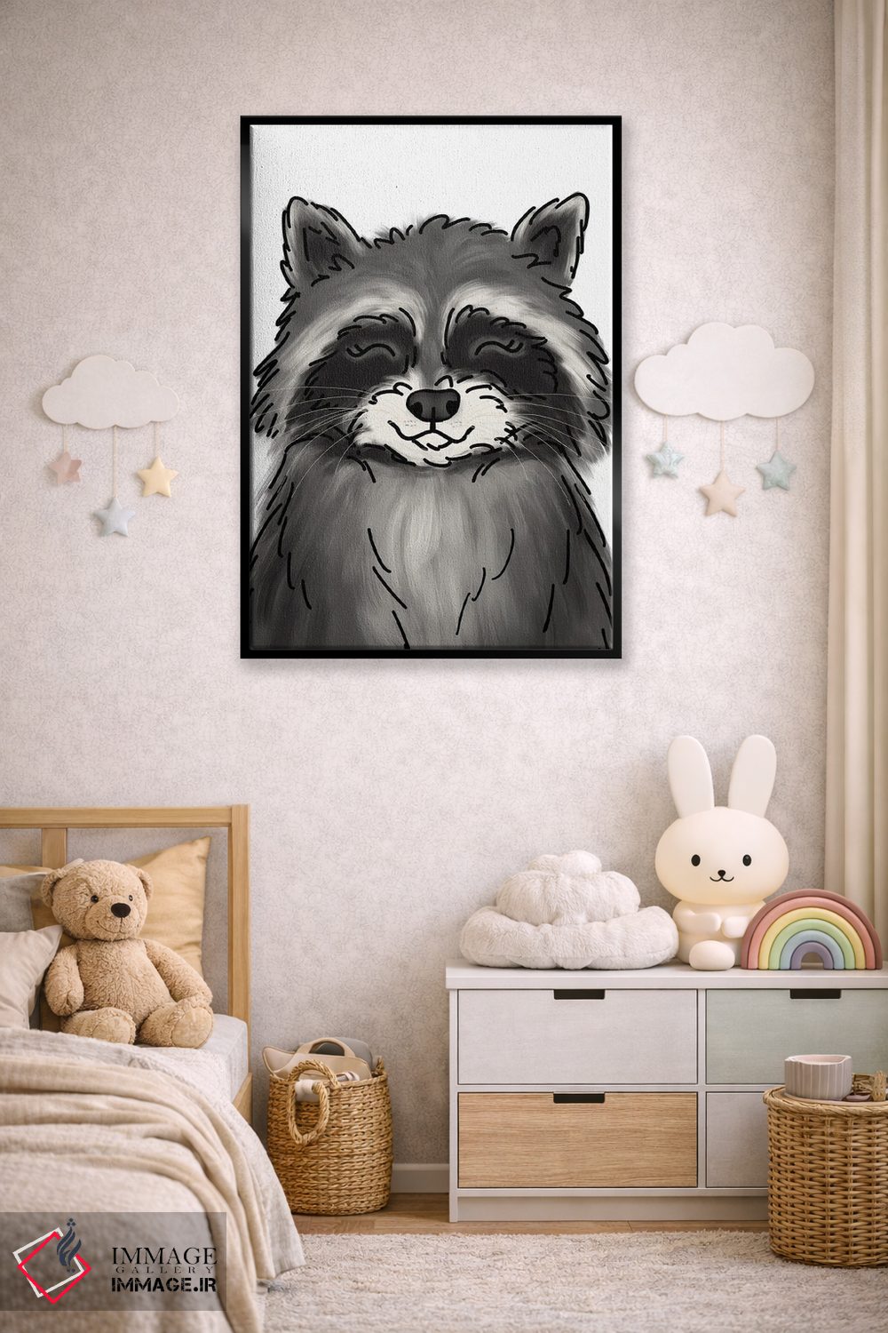 «راکون» اثرِ «کیتی برایانت» میتواند بافت و جزئیات را طوری نشان بدهد که نگاه میماند؛ برای اتاق کودک (بدون لحن کودکانه) پیشنهاد میشود. حسش صمیمی است، اما کیفیتش جدی و خوشپرداخت.
