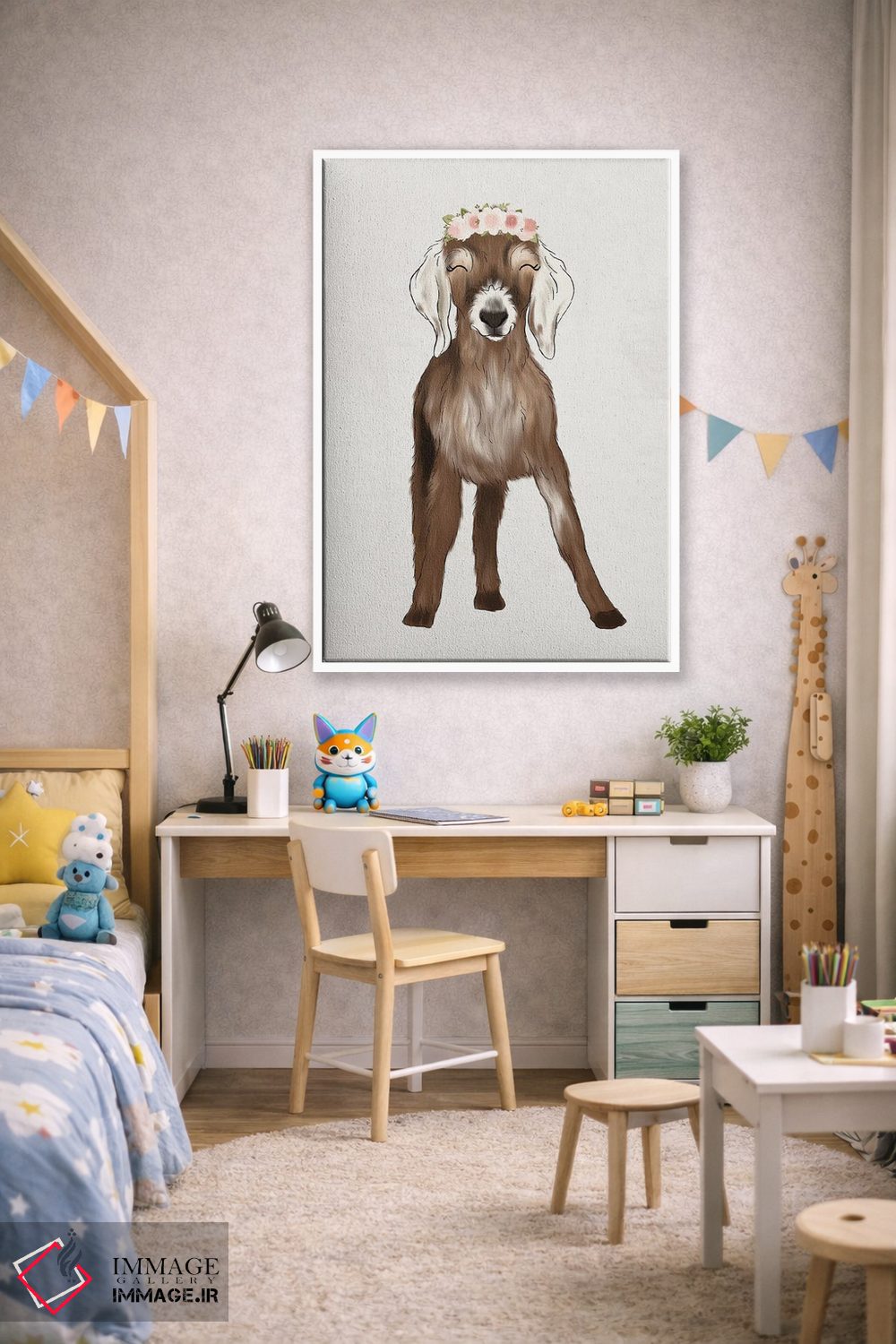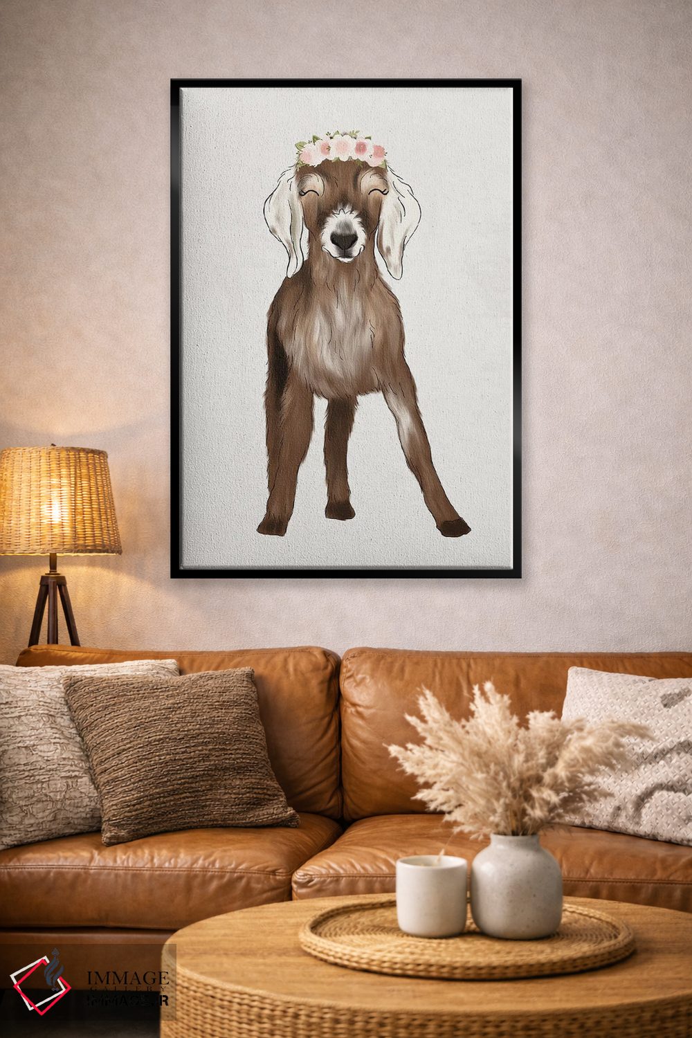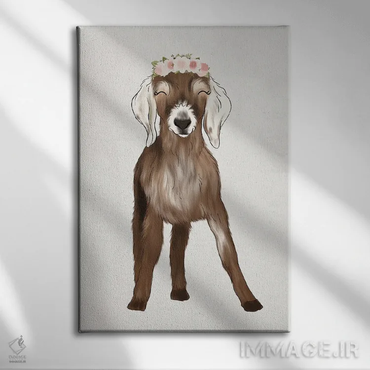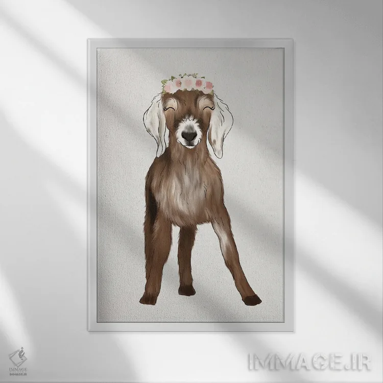 «بزغاله با تاج گل» اثرِ «کیتی برایانت» از آن کارهاییست که در کنار رنگهای خنثی، تضاد دلچسبی میسازد؛ برای اتاق بازی یا گوشهٔ مطالعه انتخاب خوبیست. با قاب چوبی یا مشکی، حس مرتبتری پیدا میکند.