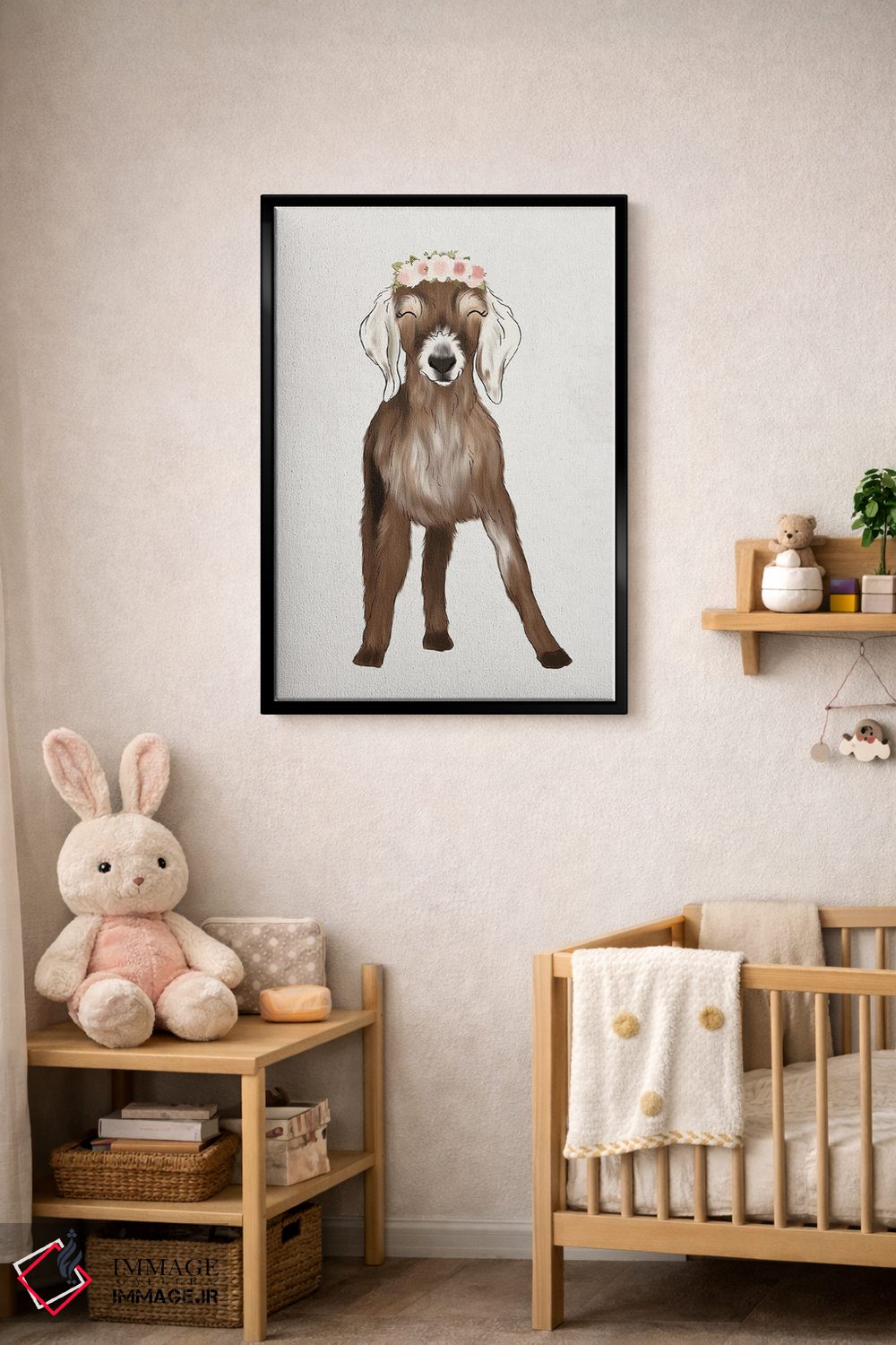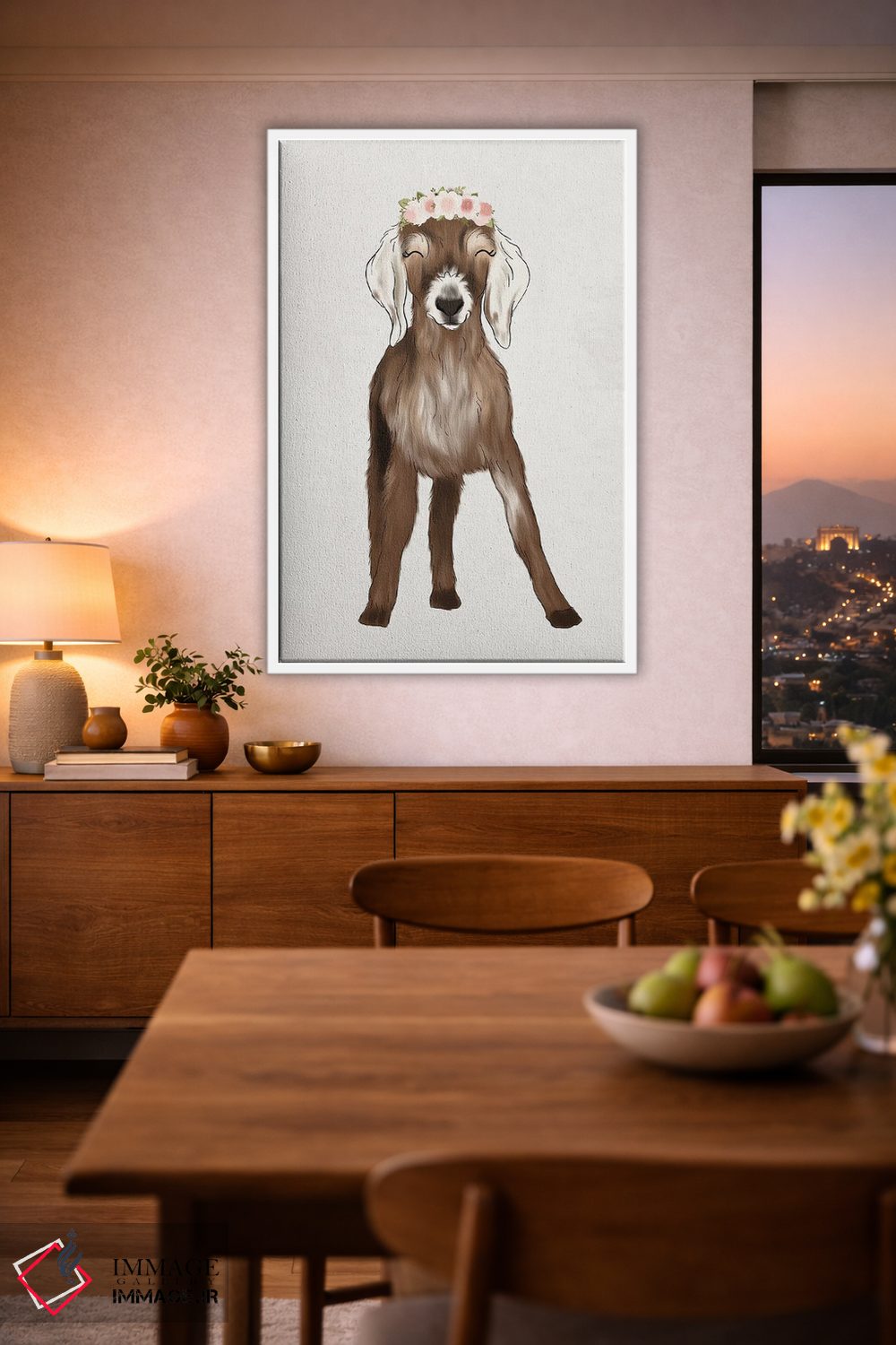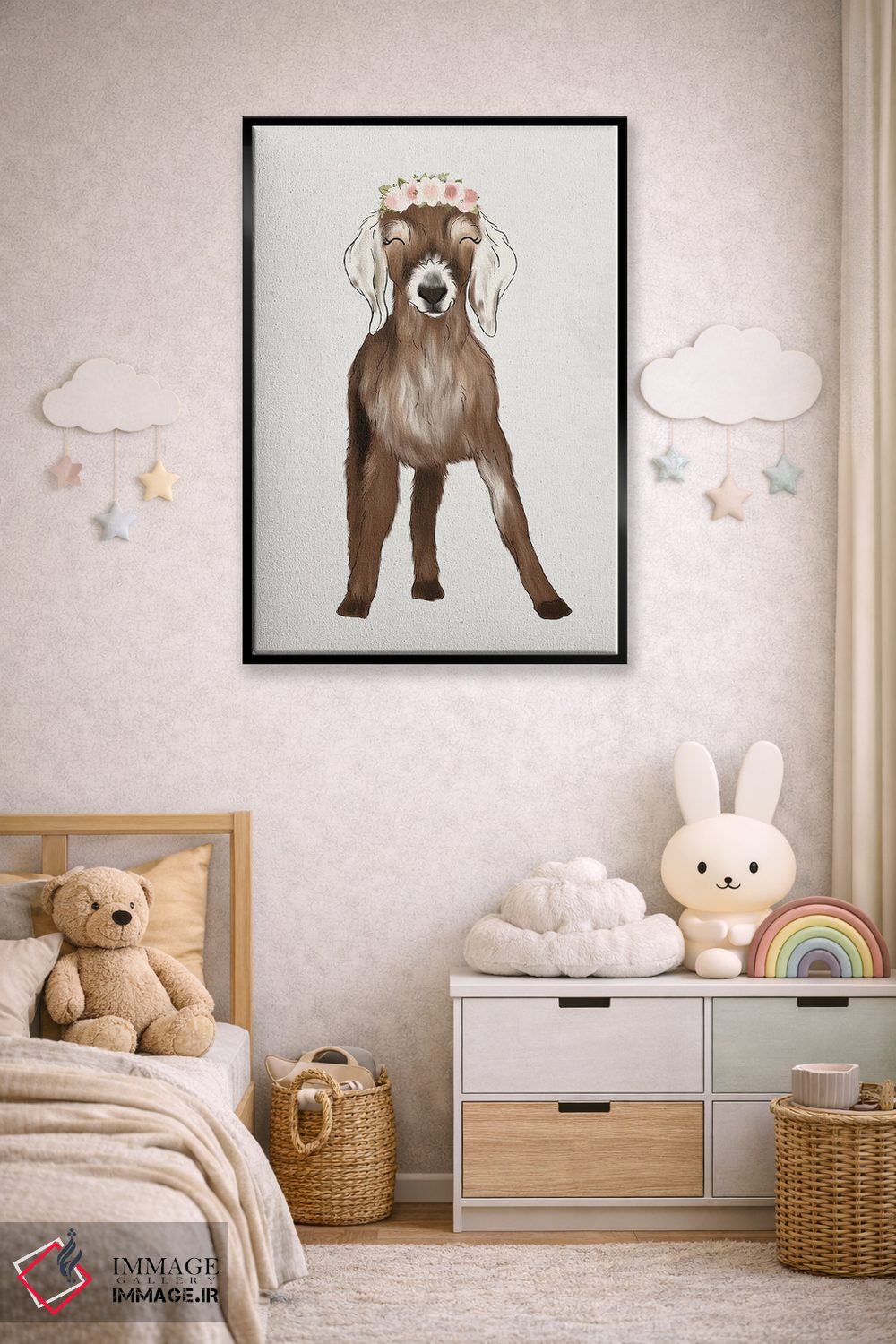 «بزغاله با تاج گل» اثرِ «کیتی برایانت» از آن کارهاییست که در کنار رنگهای خنثی، تضاد دلچسبی میسازد؛ برای اتاق بازی یا گوشهٔ مطالعه انتخاب خوبیست. با قاب چوبی یا مشکی، حس مرتبتری پیدا میکند.