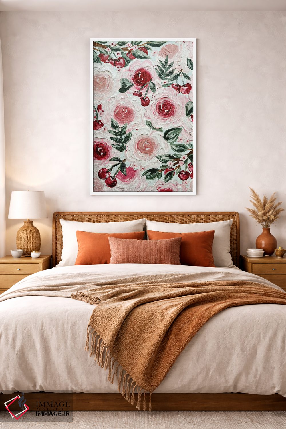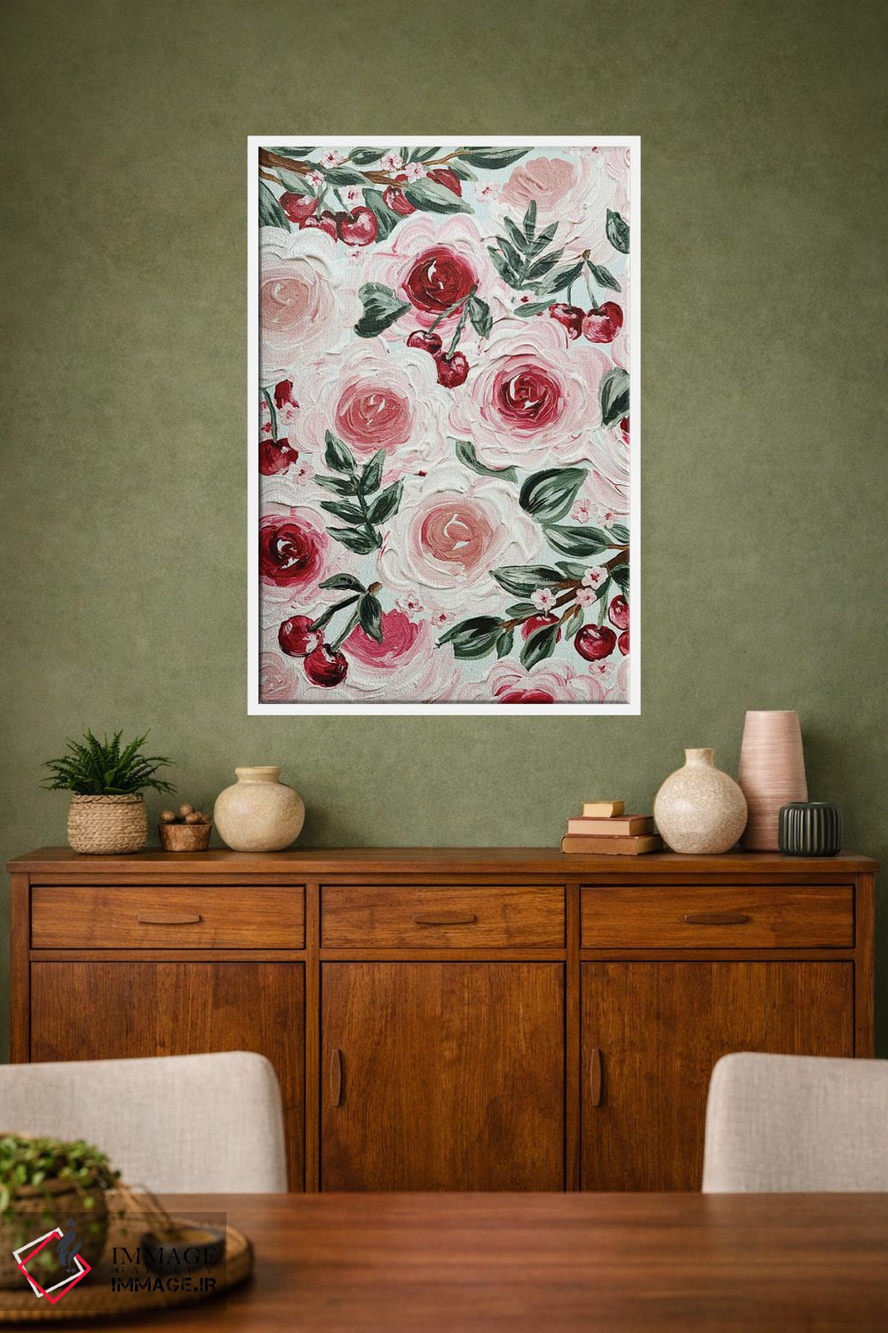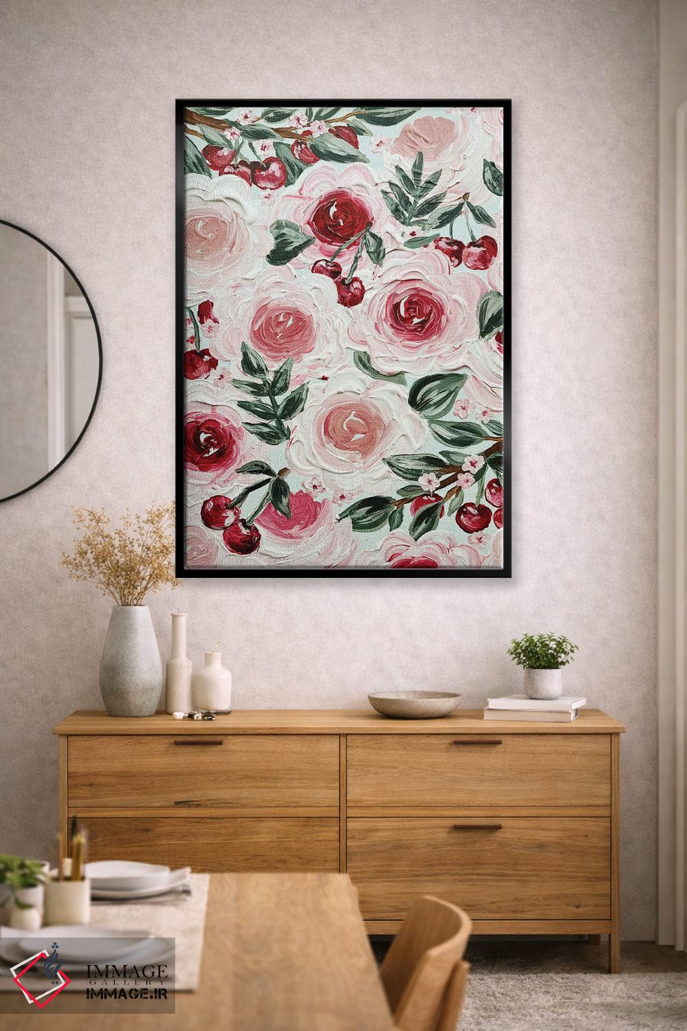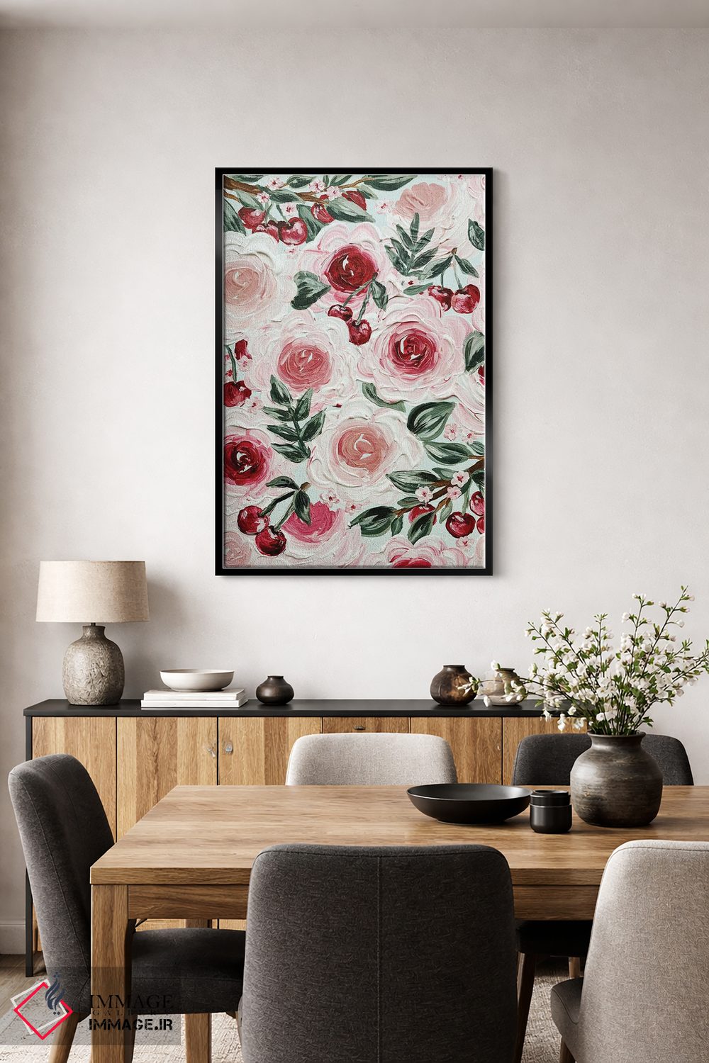 برای دیواری که میخواهید نرمتر دیده شود، «گلهای گیلاس» اثرِ «کیتی برایانت» چیدمان را از خشکی بیرون میآورد؛ برای خانههایی با نور طبیعی انتخابی خوشسلیقه است. در کنار گیاهان آپارتمانی، هماهنگتر هم میشود.