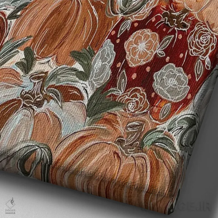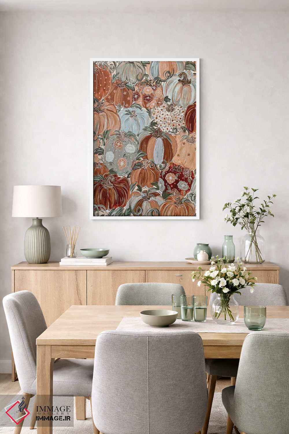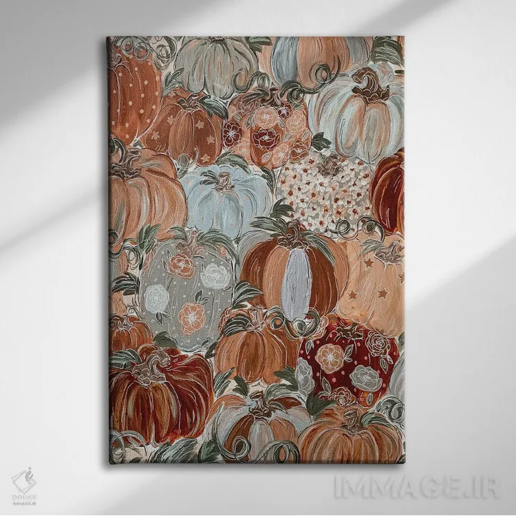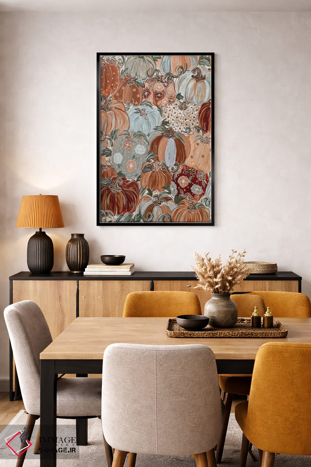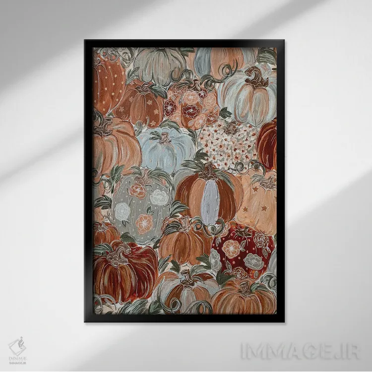 این تابلو با عنوان «گلهای کدویی الگودار» اثرِ «کیتی برایانت»، حسِ گرم و صمیمی به فضا میدهد.