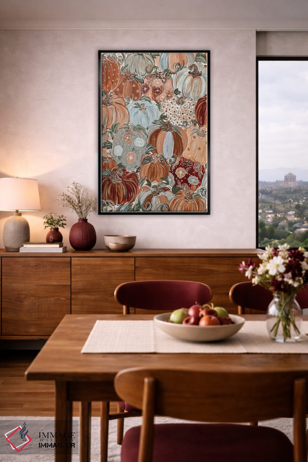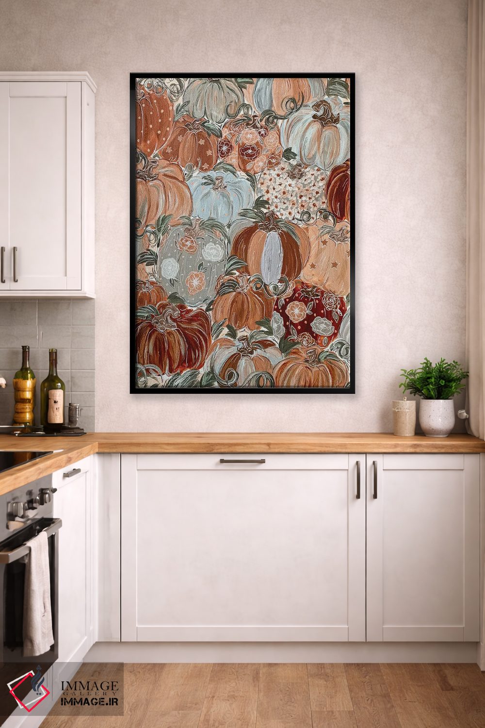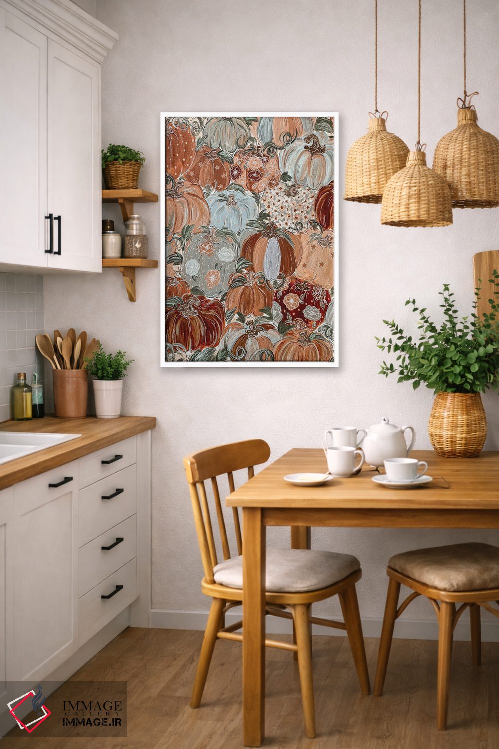این تابلو با عنوان «گلهای کدویی الگودار» اثرِ «کیتی برایانت»، حسِ گرم و صمیمی به فضا میدهد.