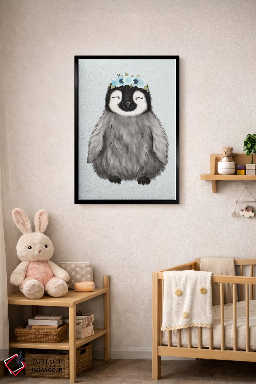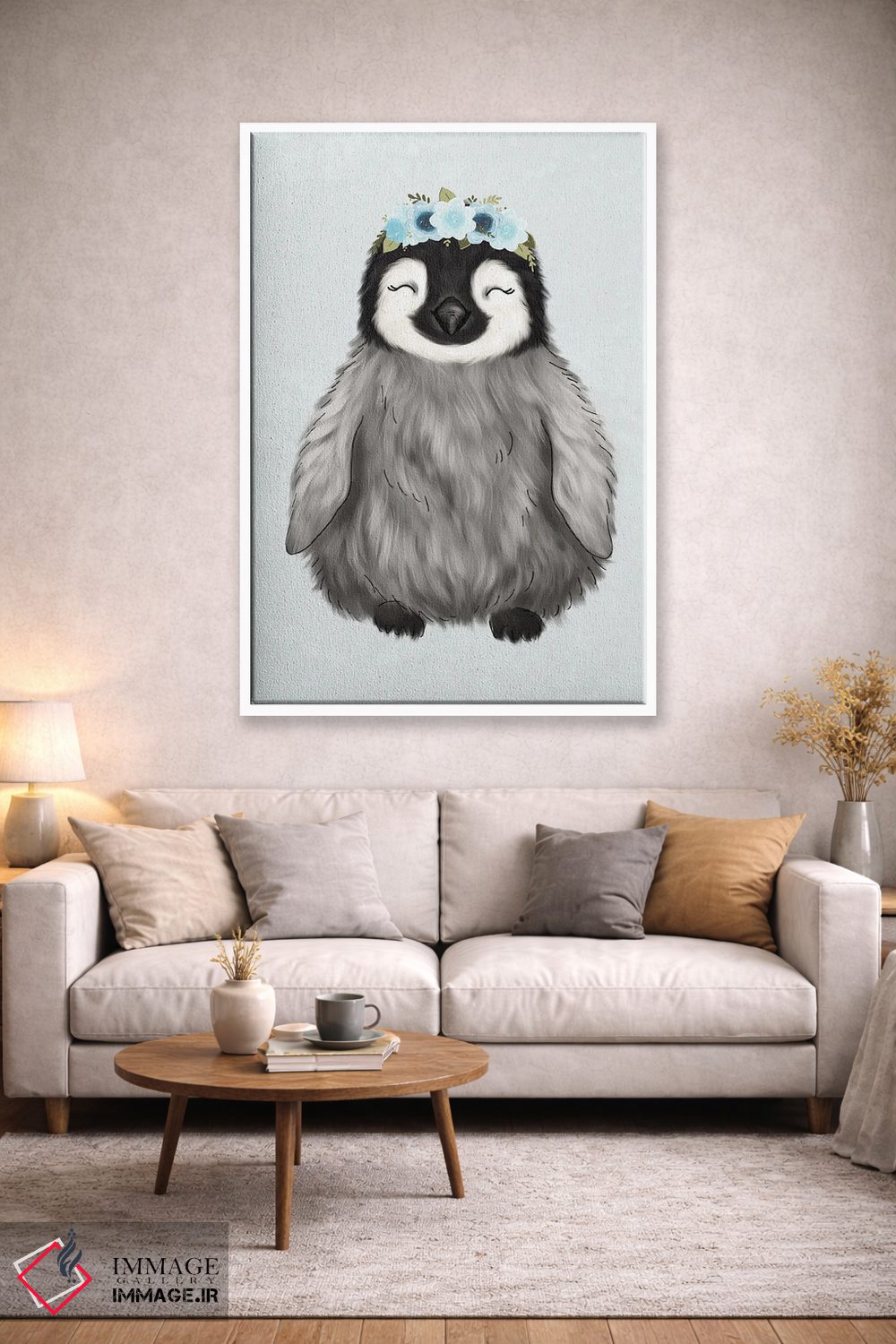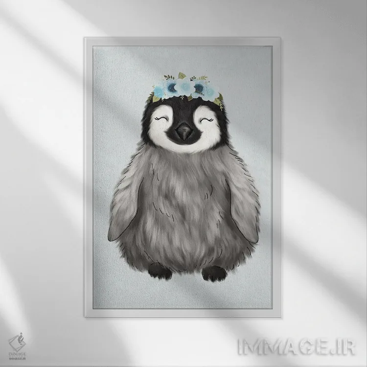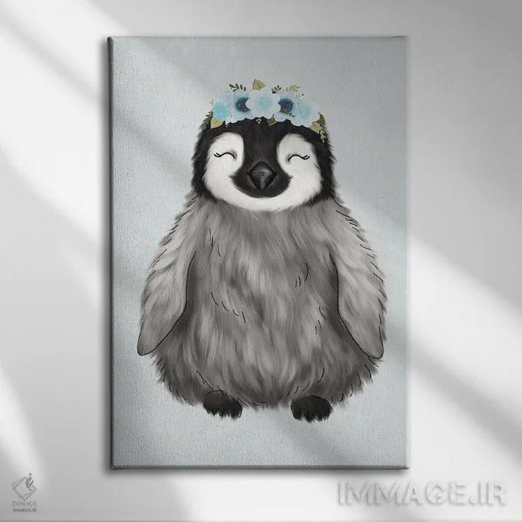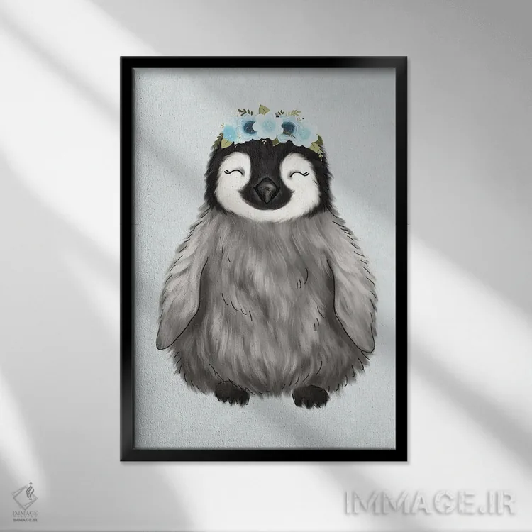 در «پنگوئن نوزاد با تاج گل» اثرِ «کیتی برایانت»، حضور حیوانات فضا را صمیمیتر و دعوتکنندهتر نشان میدهد؛ برای خانههایی با چوب و پارچههای گرم انتخابی خوشسلیقه است. با قاب چوبی یا مشکی، حس مرتبتری پیدا میکند.