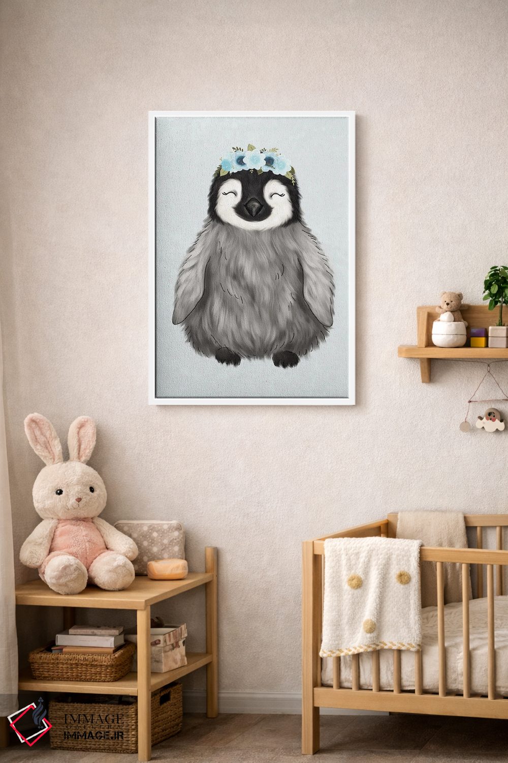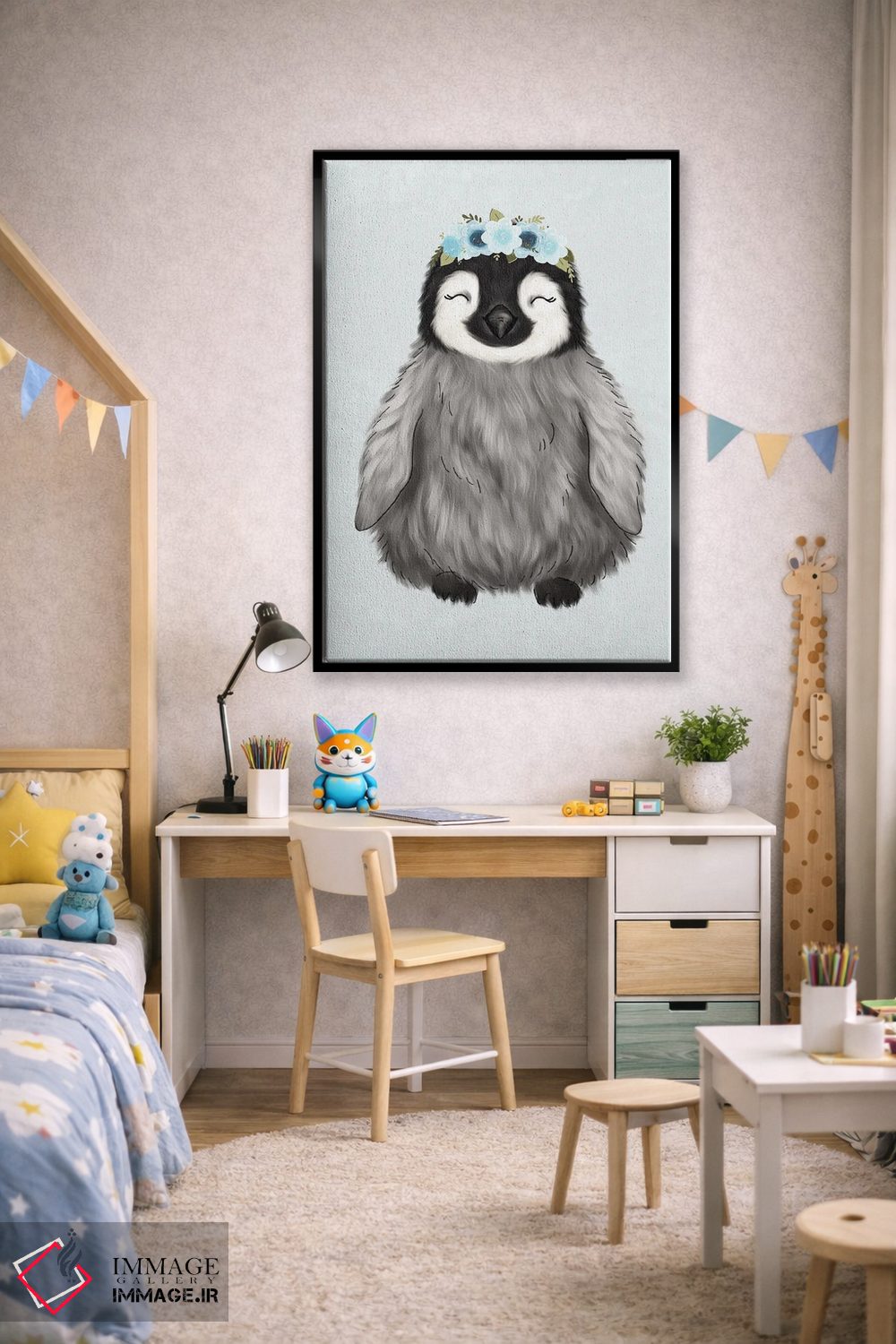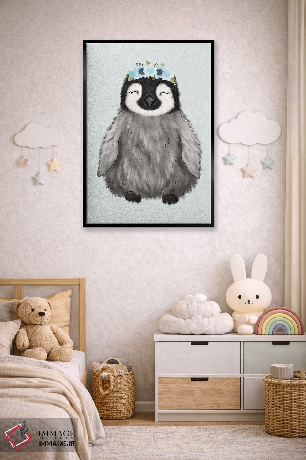در «پنگوئن نوزاد با تاج گل» اثرِ «کیتی برایانت»، حضور حیوانات فضا را صمیمیتر و دعوتکنندهتر نشان میدهد؛ برای خانههایی با چوب و پارچههای گرم انتخابی خوشسلیقه است. با قاب چوبی یا مشکی، حس مرتبتری پیدا میکند.