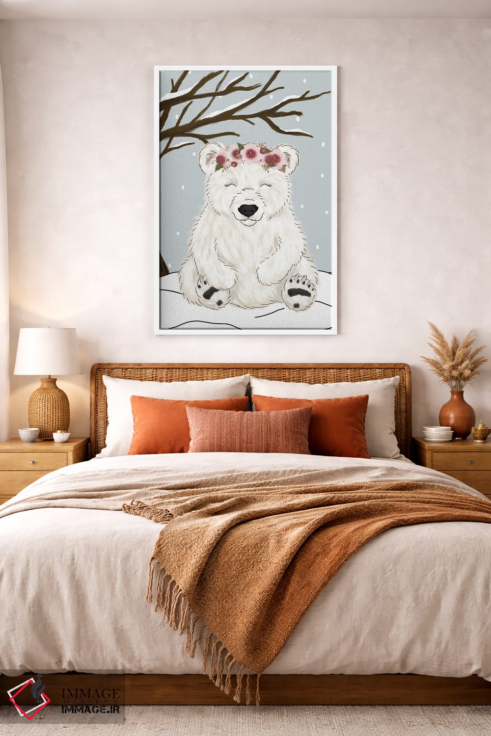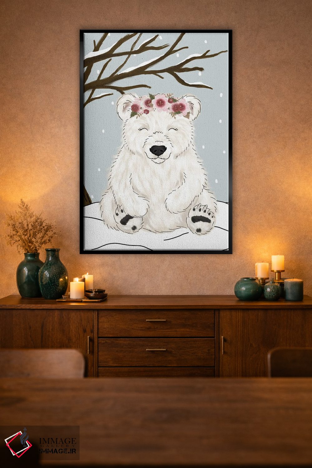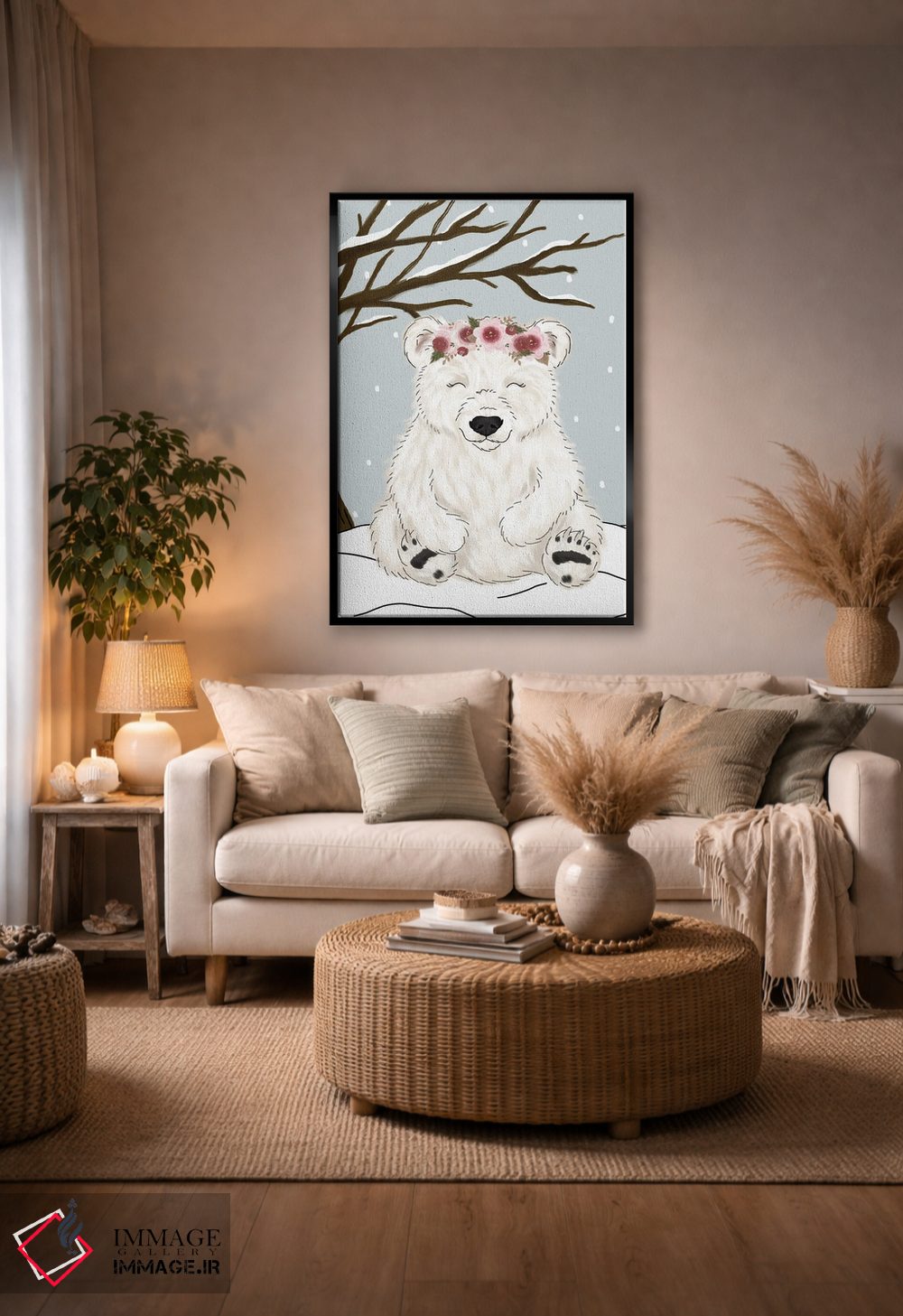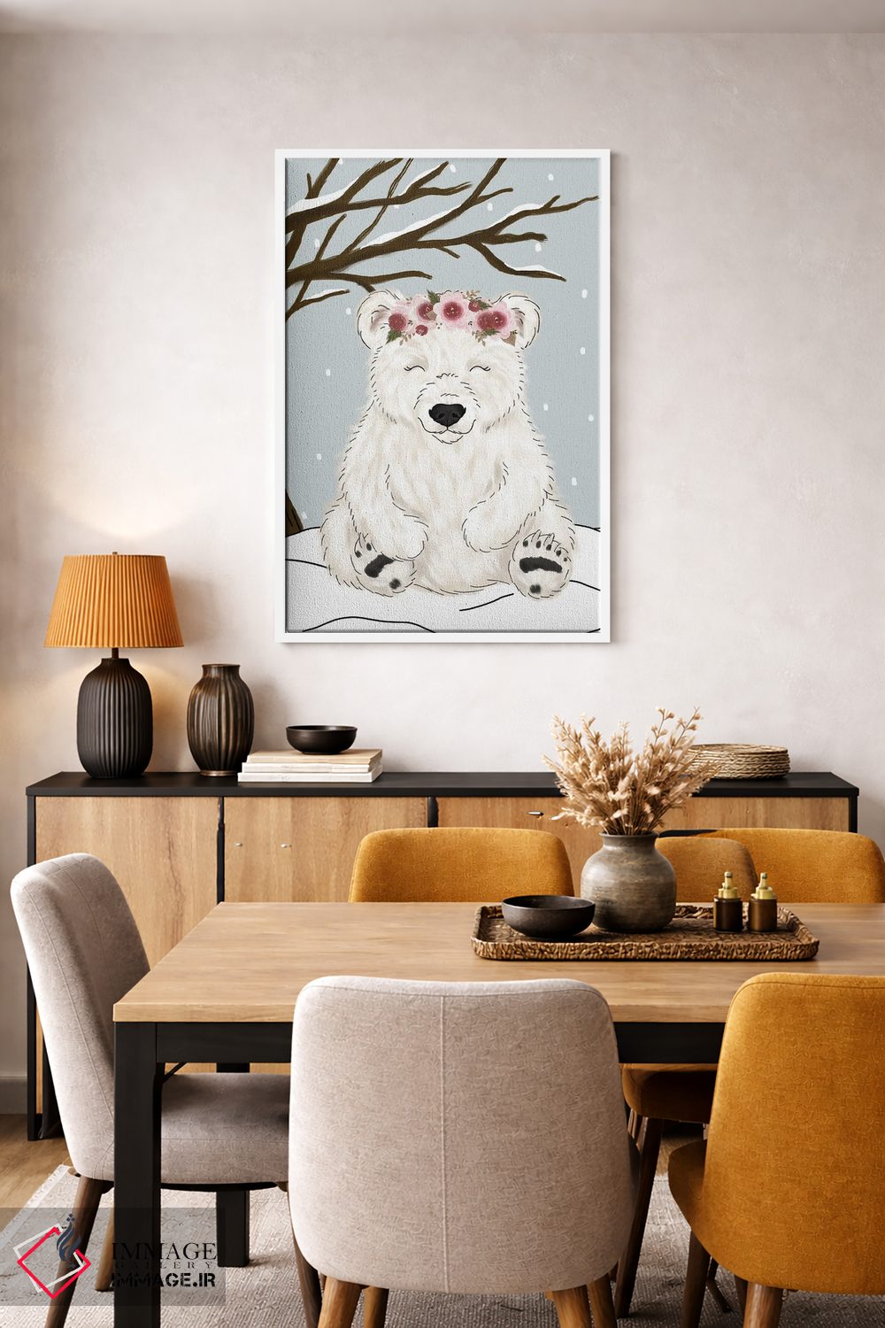 براساس پالت گرم اثر، قاب بلوط روشن (چوبی) پیشنهاد اول است و استخوانی ملایم مکمل. برای سفارشهای پروژهای با ابعاد و قابهای اختصاصی با ایماژ در تماس باشید.