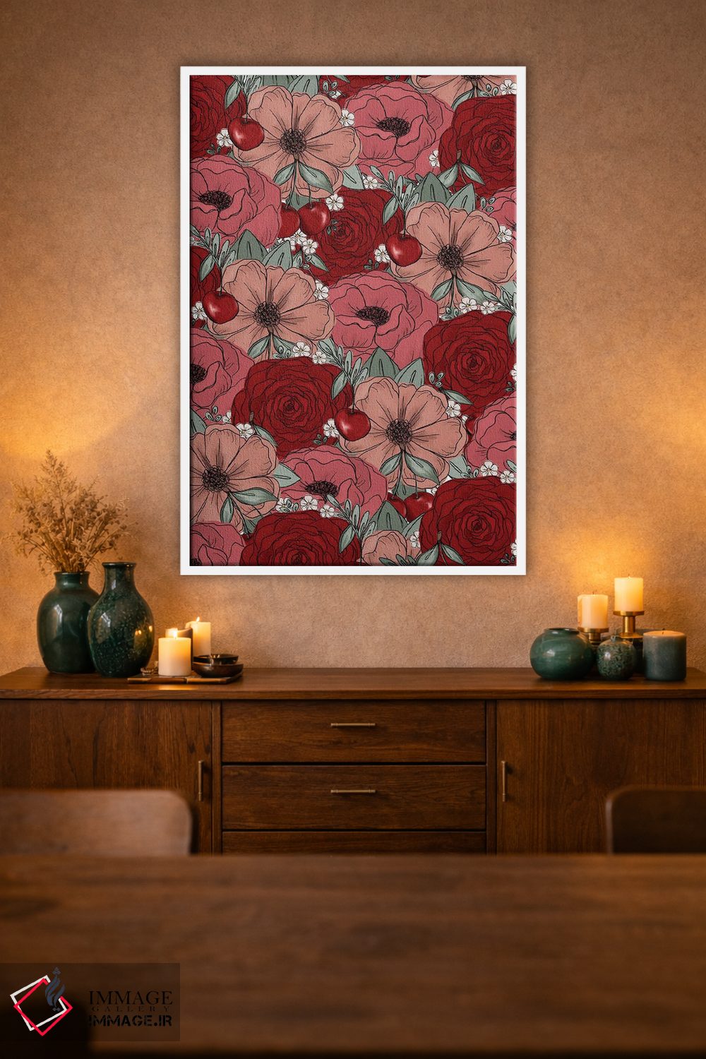 براساس پالت گرم اثر، قاب تیک گرم (چوبی) پیشنهاد اول است و مشکی مات (فریم متوسط) مکمل. برای سفارشهای پروژهای با ابعاد و قابهای اختصاصی با ایماژ در تماس باشید.