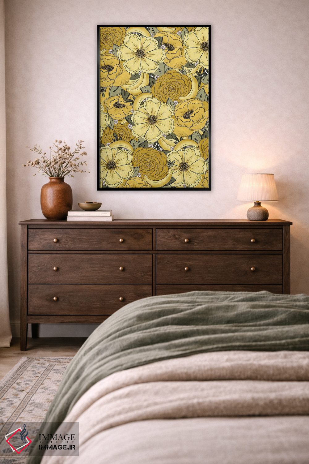 براساس پالت ترکیبی اثر، قاب بلوط روشن (چوبی) پیشنهاد اول است و استخوانی ملایم مکمل. برای سفارشهای پروژهای با ابعاد و قابهای اختصاصی با ایماژ در تماس باشید.