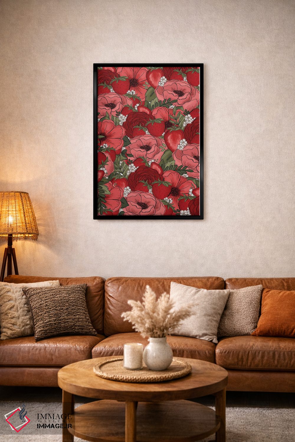 براساس پالت ترکیبی اثر، قاب تیک گرم (چوبی) پیشنهاد اول است و مشکی مات (فریم متوسط) مکمل. برای سفارشهای پروژهای با ابعاد و قابهای اختصاصی با ایماژ در تماس باشید.