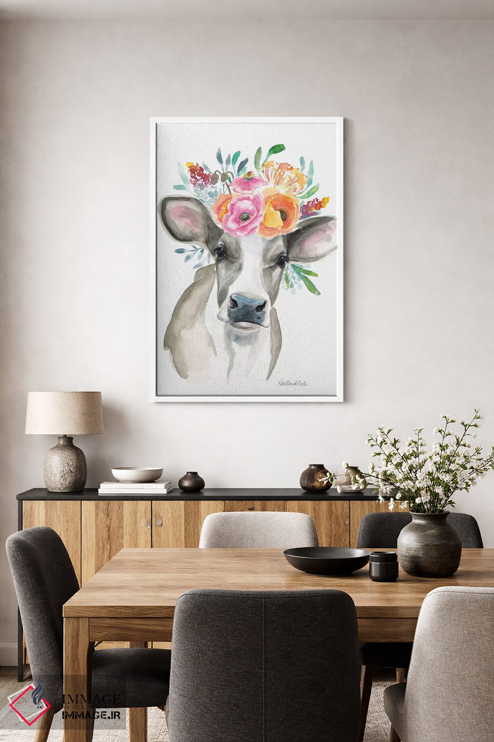 برای دیواری که میخواهید نرمتر دیده شود، «گاو» اثرِ «کیرستن دیل» تعادل رنگیِ لطیفی به چیدمان میدهد؛ برای راهروهای مینیمال انتخابی خوشسلیقه است. جزئیاتش از نزدیک هم ارزش تماشا دارد.