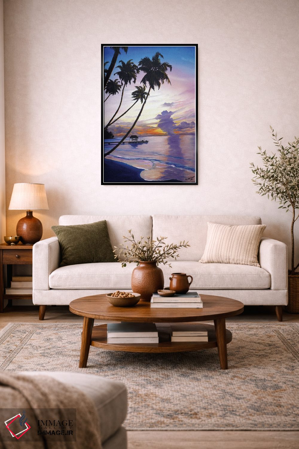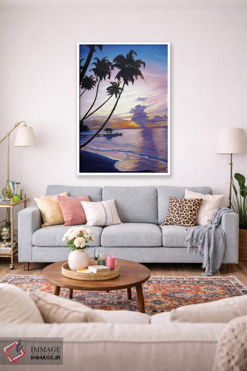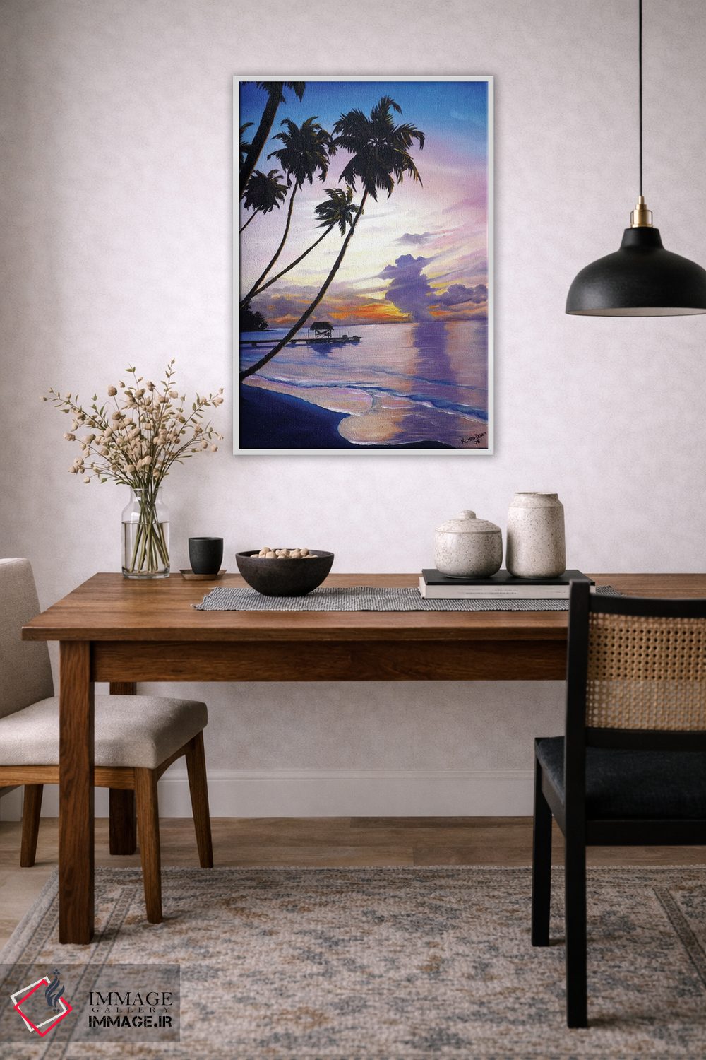 «غروب در نقطه کبوتر» اثرِ «کارین داون کلشال—بست» با حالوهوای این اثر و لحنِ دکور ساحلی، فضا را روشنتر و سبکتر نشان میدهد—مناسبِ نشیمنهای آفتابگیر.