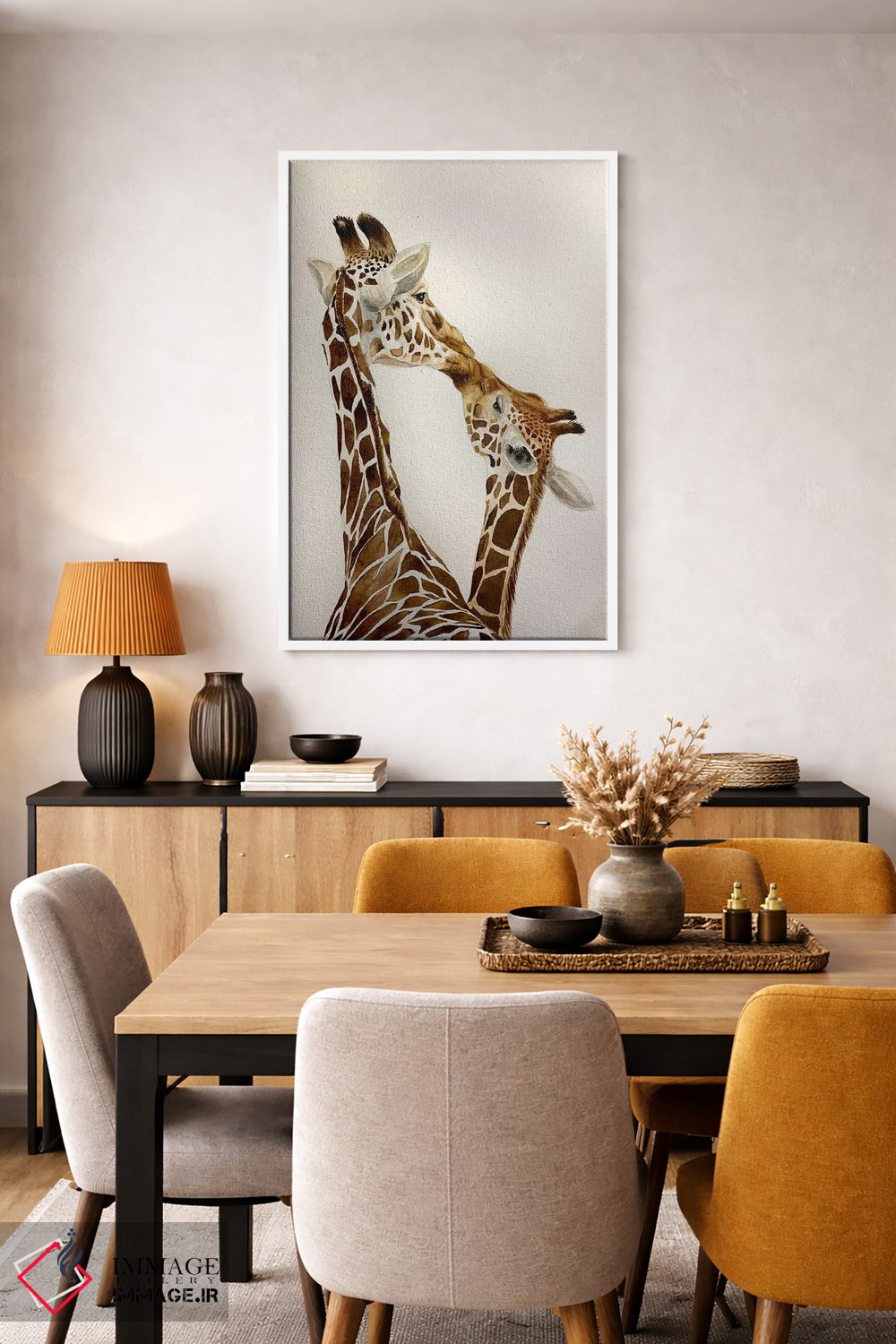 براساس پالت گرم اثر، قاب تیک گرم (چوبی) پیشنهاد اول است و مشکی مات (فریم متوسط) مکمل. برای سفارشهای پروژهای با ابعاد و قابهای اختصاصی با ایماژ در تماس باشید.