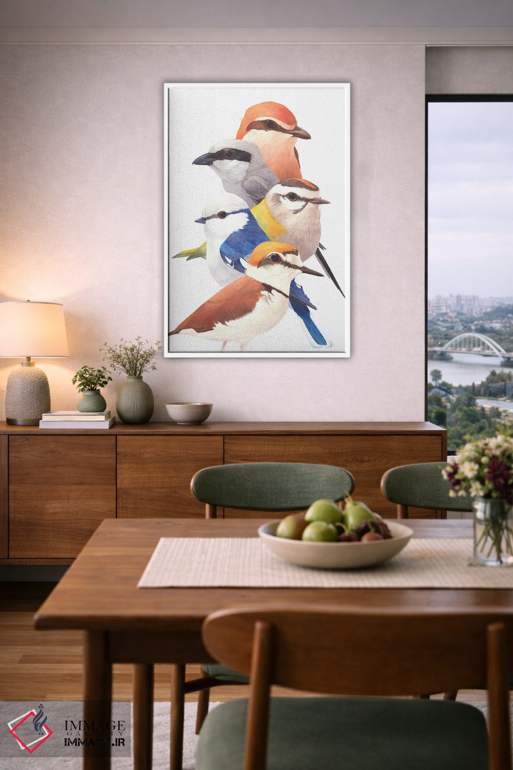 «پنج پرنده» اثرِ «کارینا دانیلچوک» میتواند به دیوار، انرژیِ نرم و زنده بدهد؛ برای دکورهای مدرن و مینیمال پیشنهاد میشود. حسش صمیمی است، اما کیفیتش جدی و خوشپرداخت.