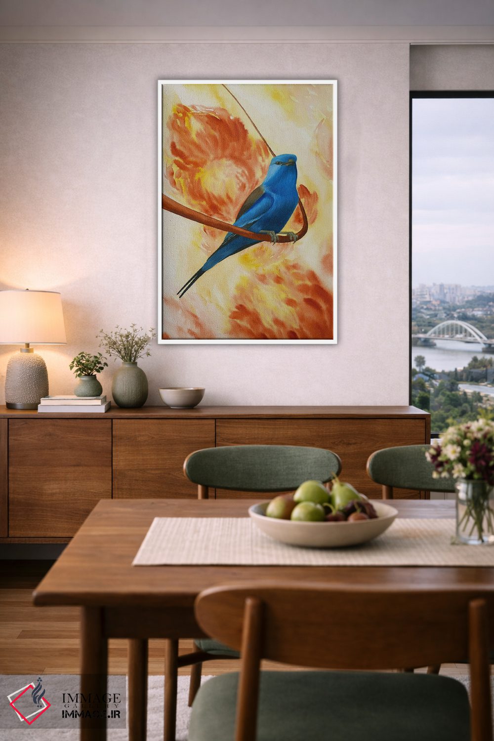 اگر میخواهید دیوار کمی سرزندگیِ محترمانه داشته باشد، «پرنده آبی روی شاخه با گلها» اثرِ «کارینا دانیلچوک» در کنار رنگهای خنثی، تضاد دلچسبی میسازد، برای اتاق بازی یا گوشهٔ مطالعه گزینهٔ مناسبیست. هم فضا را گرم میکند، هم شلوغش نمیکند.