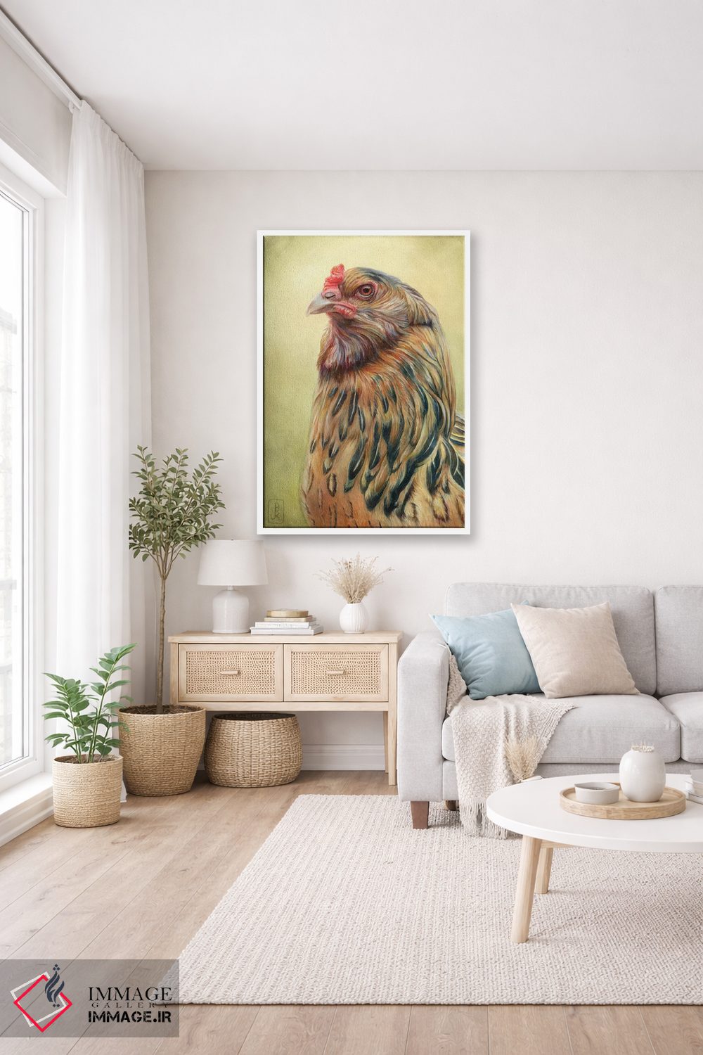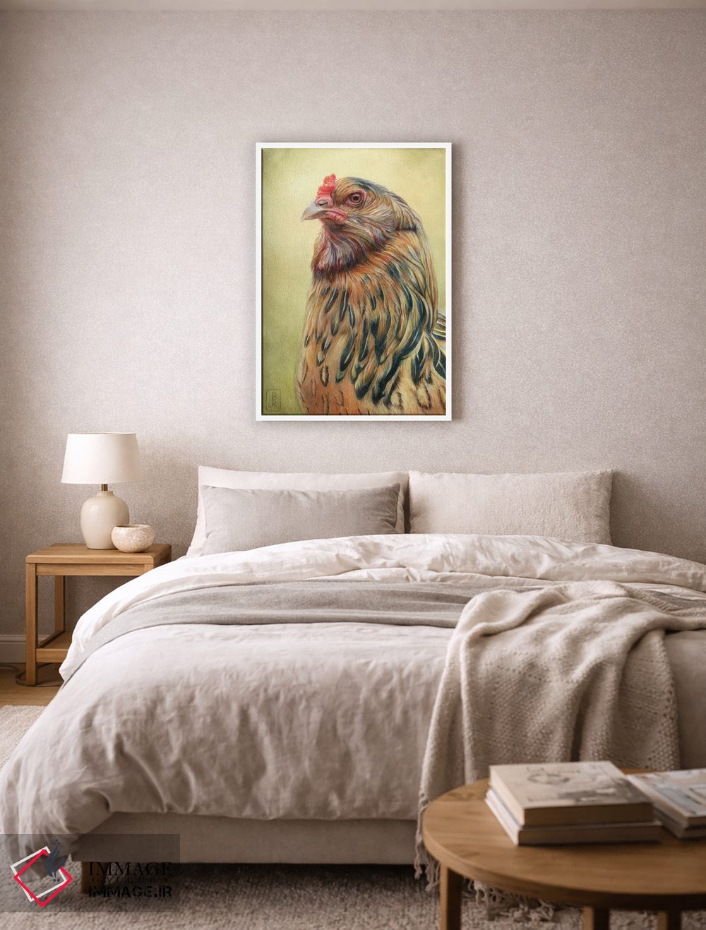 براساس پالت گرم اثر، قاب بلوط روشن (چوبی) پیشنهاد اول است و استخوانی ملایم مکمل. برای سفارشهای پروژهای با ابعاد و قابهای اختصاصی با ایماژ در تماس باشید.