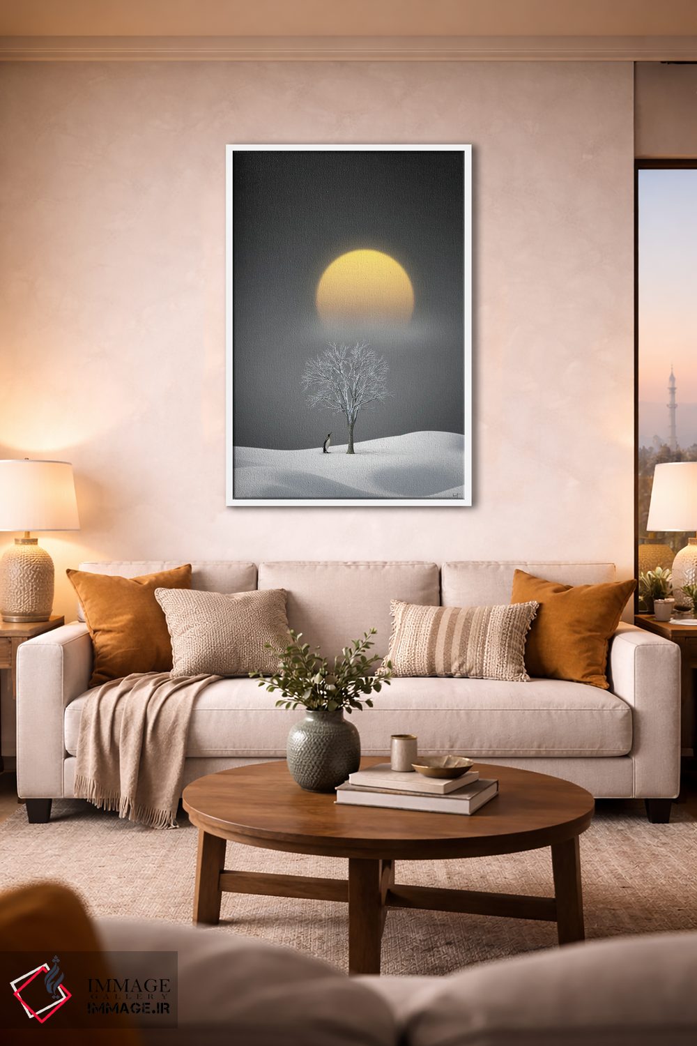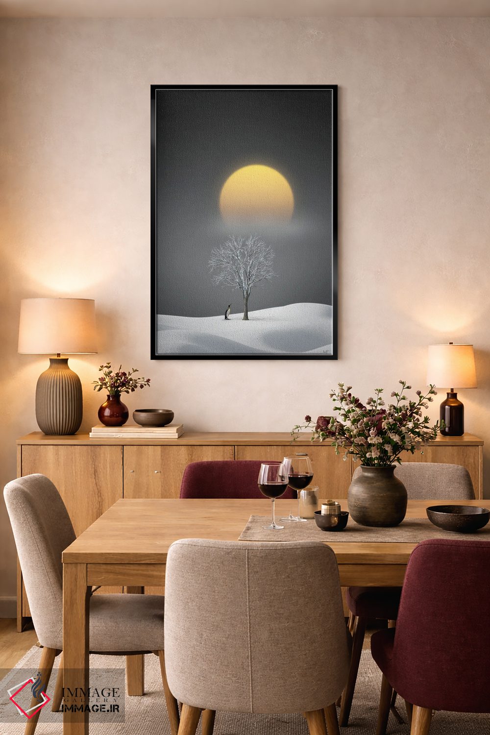 براساس پالت گرم اثر، قاب تیک گرم (چوبی) پیشنهاد اول است و مشکی مات (فریم متوسط) مکمل. برای سفارشهای پروژهای با ابعاد و قابهای اختصاصی با ایماژ در تماس باشید.