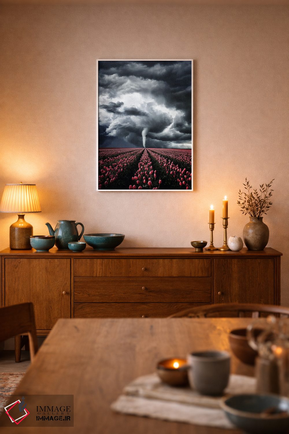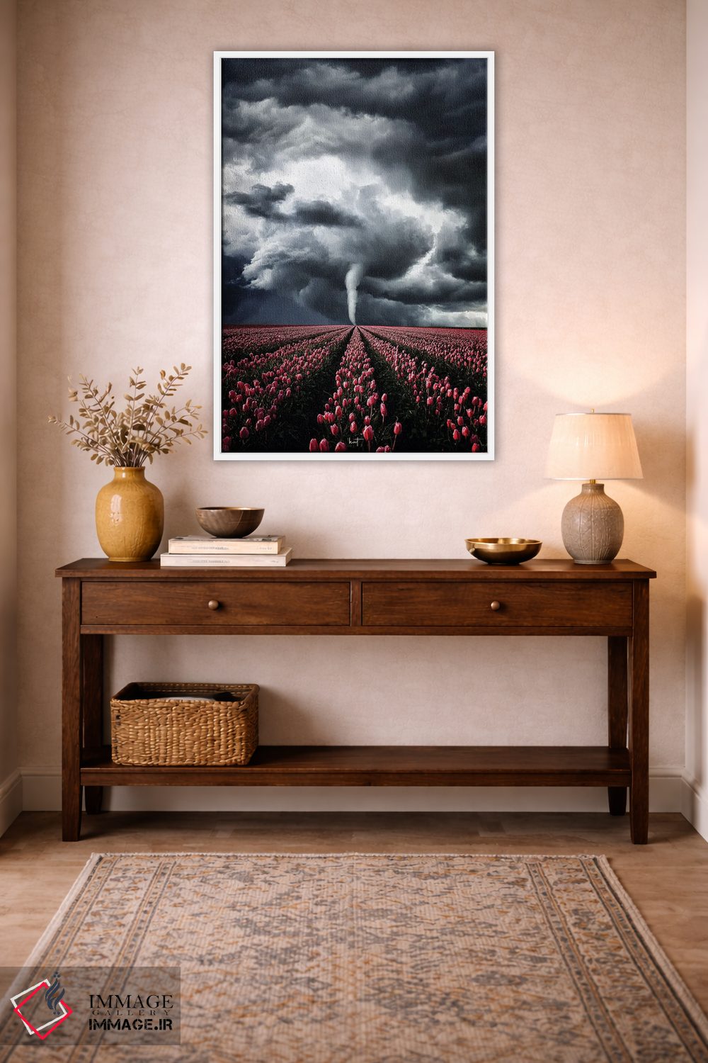 این اثر با عنوان «لالههایی که با طوفان میجنگند» اثرِ «کاترین فدرر» حس طراوت را بدون شلوغی وارد اتاق میکند؛ برای کنار میز آرایش یا کنسول انتخابی خوشسلیقه است. فضا را شلوغ نمیکند؛ فقط لطیفترش میکند.