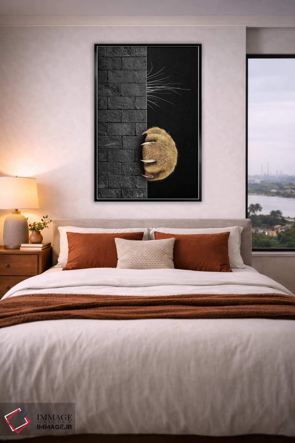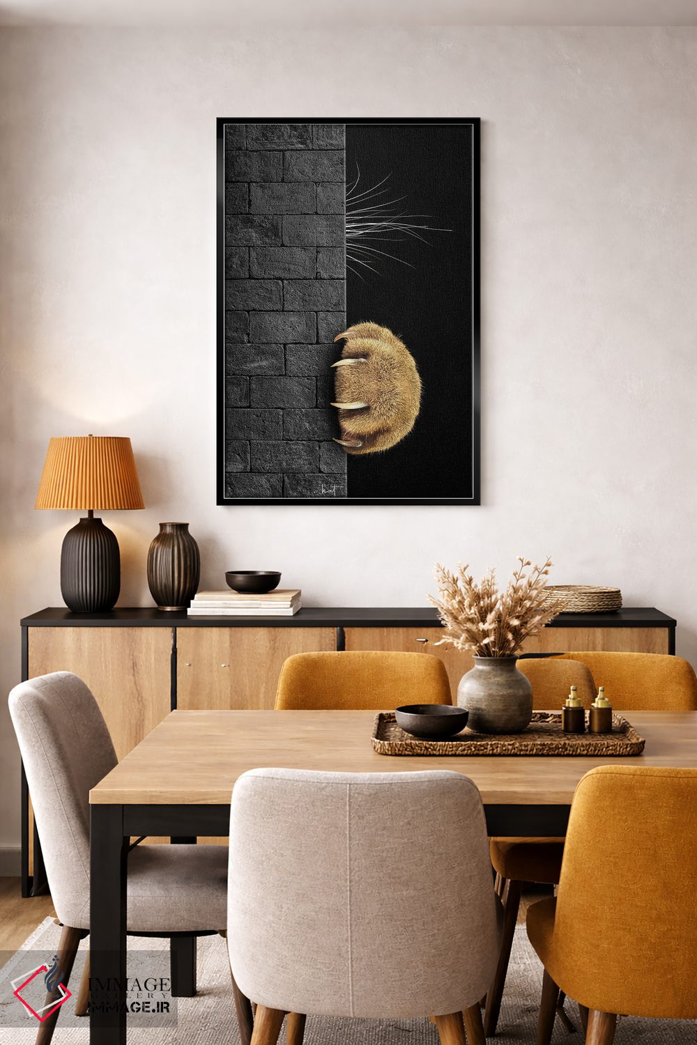 براساس پالت گرم اثر، قاب تیک گرم (چوبی) پیشنهاد اول است و مشکی مات (فریم متوسط) مکمل. برای سفارشهای پروژهای با ابعاد و قابهای اختصاصی با ایماژ در تماس باشید.