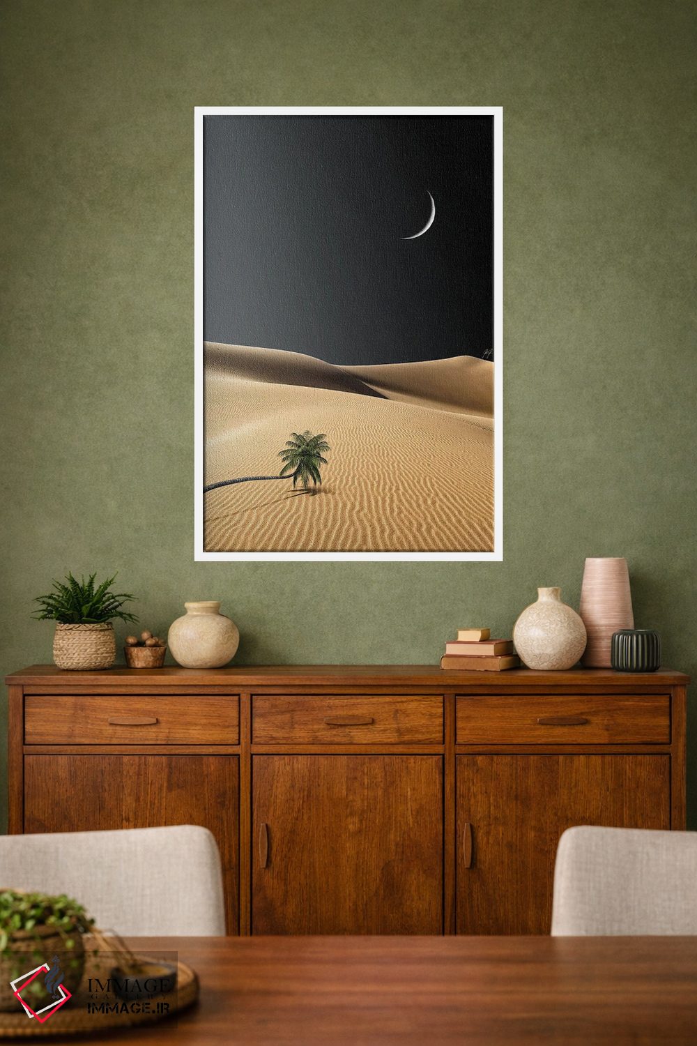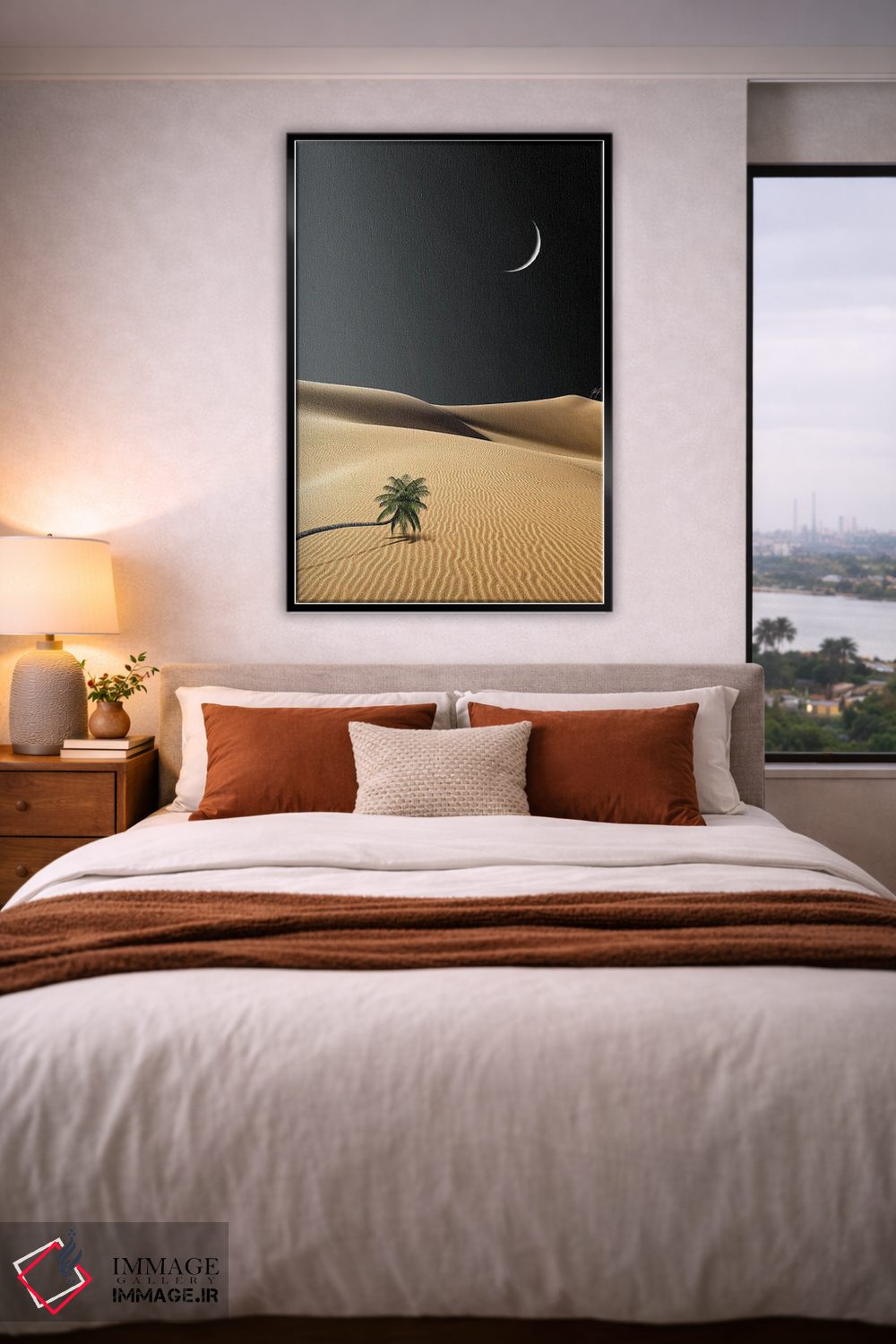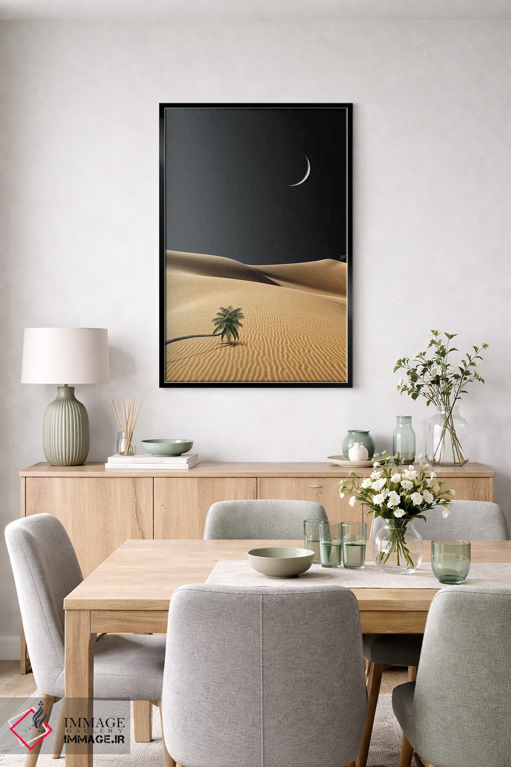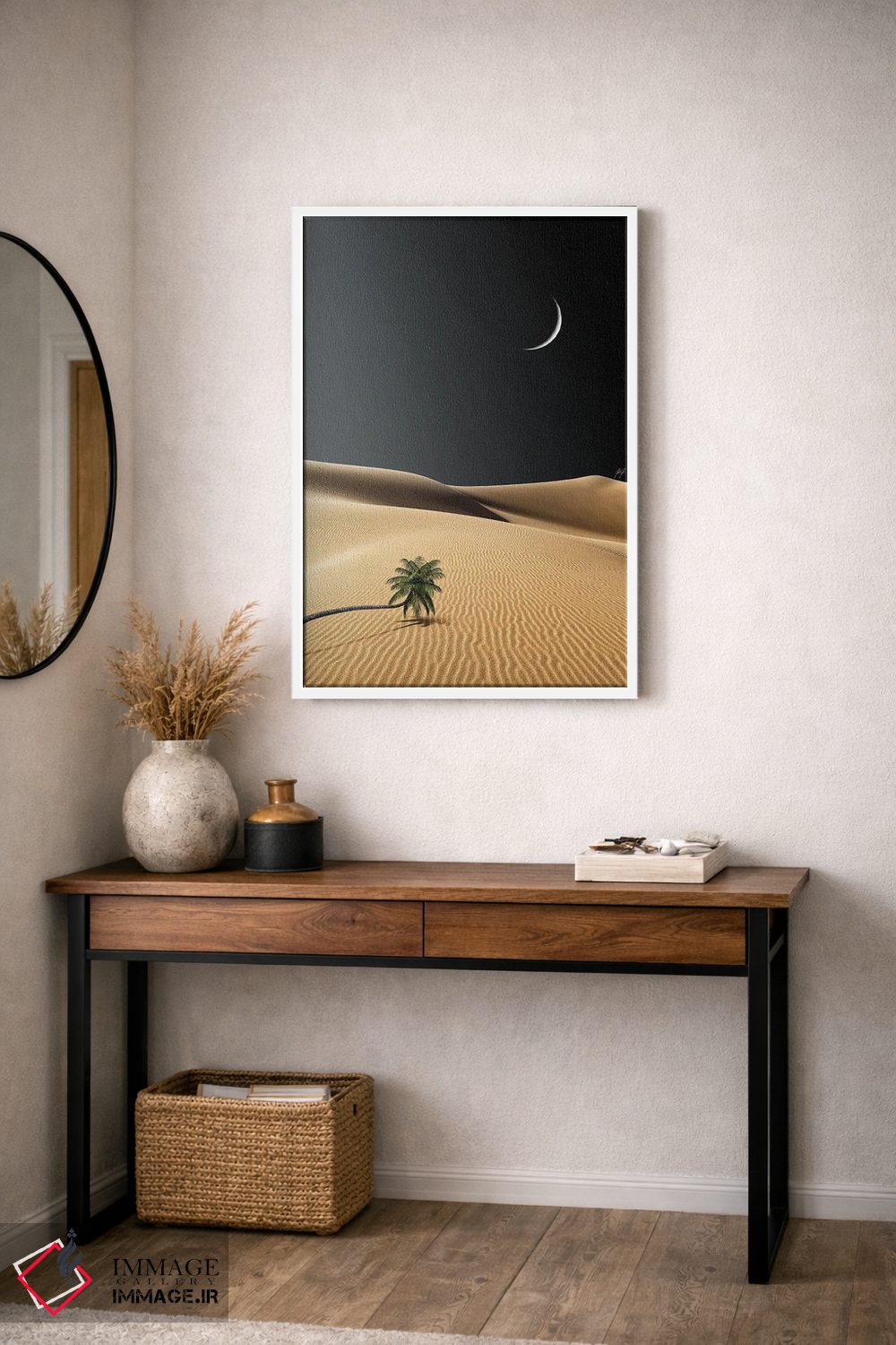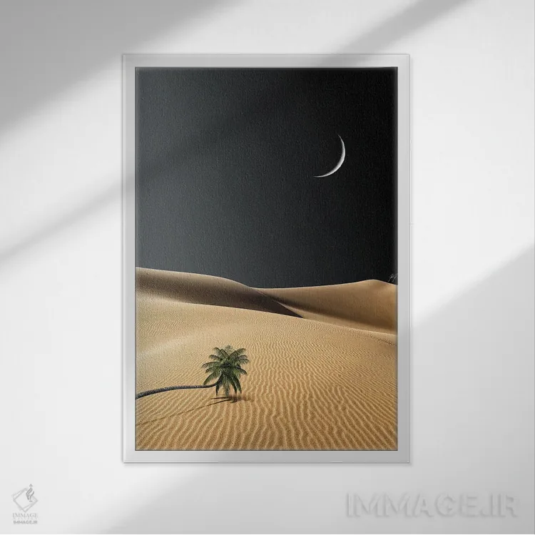 براساس پالت گرم اثر، قاب بلوط روشن (چوبی) پیشنهاد اول است و استخوانی ملایم مکمل. برای سفارشهای پروژهای با ابعاد و قابهای اختصاصی با ایماژ در تماس باشید.