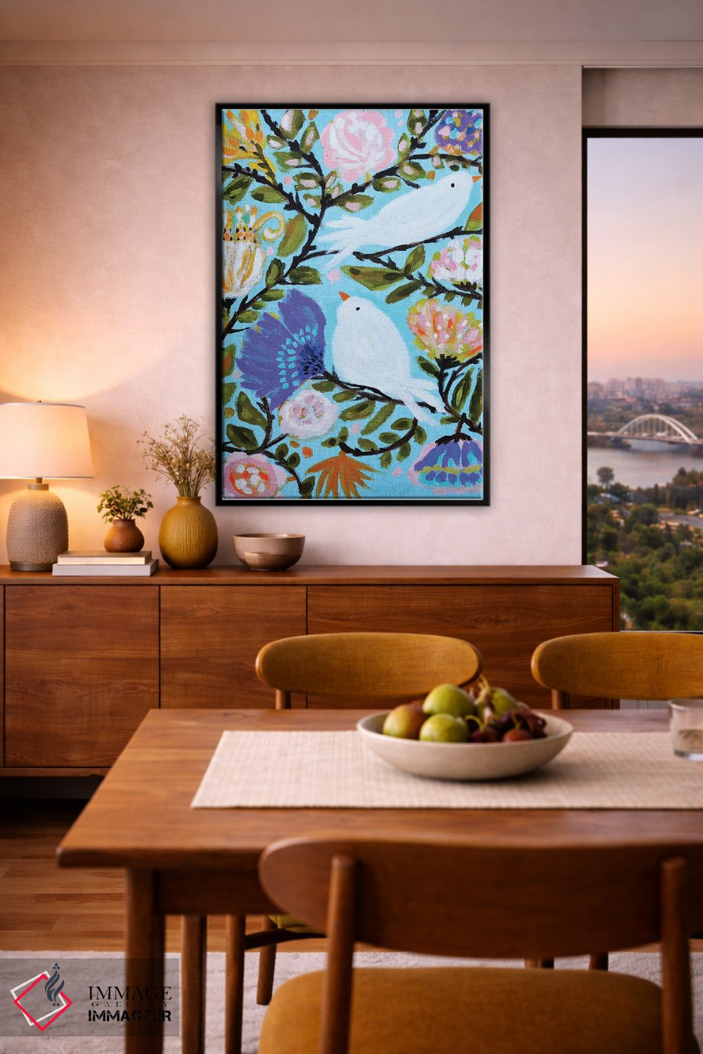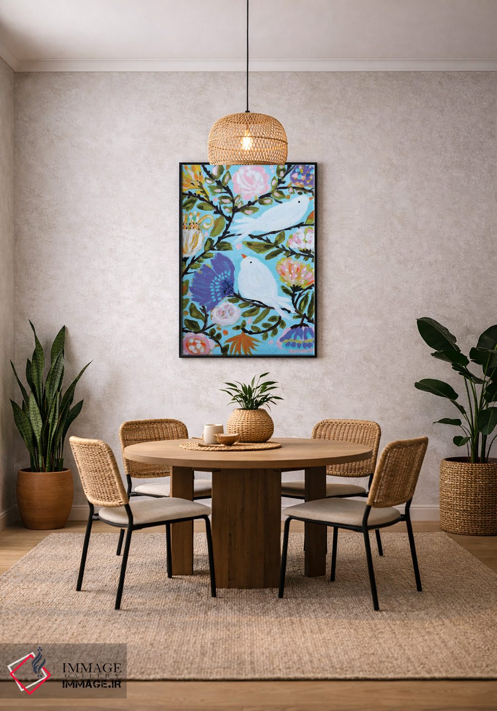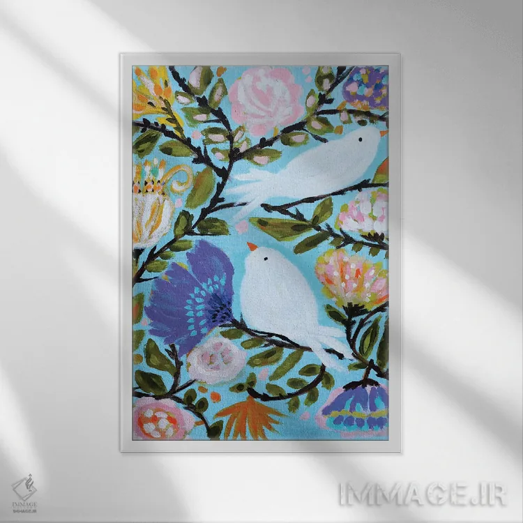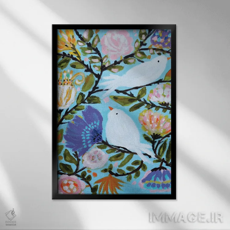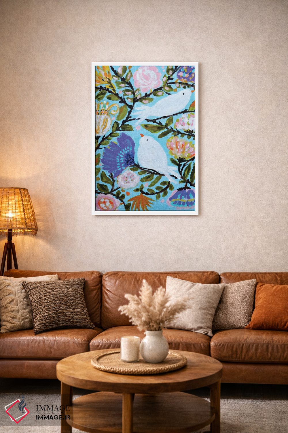 برای دکورهای صمیمی، «مرغان عاشق دوستداشتنی ۲» اثرِ «کارن فیلدز» به فضا، گرمیِ ملایم اضافه میکند؛ برای کافههای کوچک و صمیمی انتخابی خوشسلیقه است. در کنار گیاهان و نور طبیعی، جذابتر هم میشود.