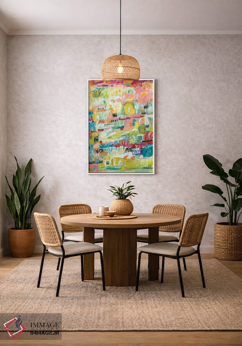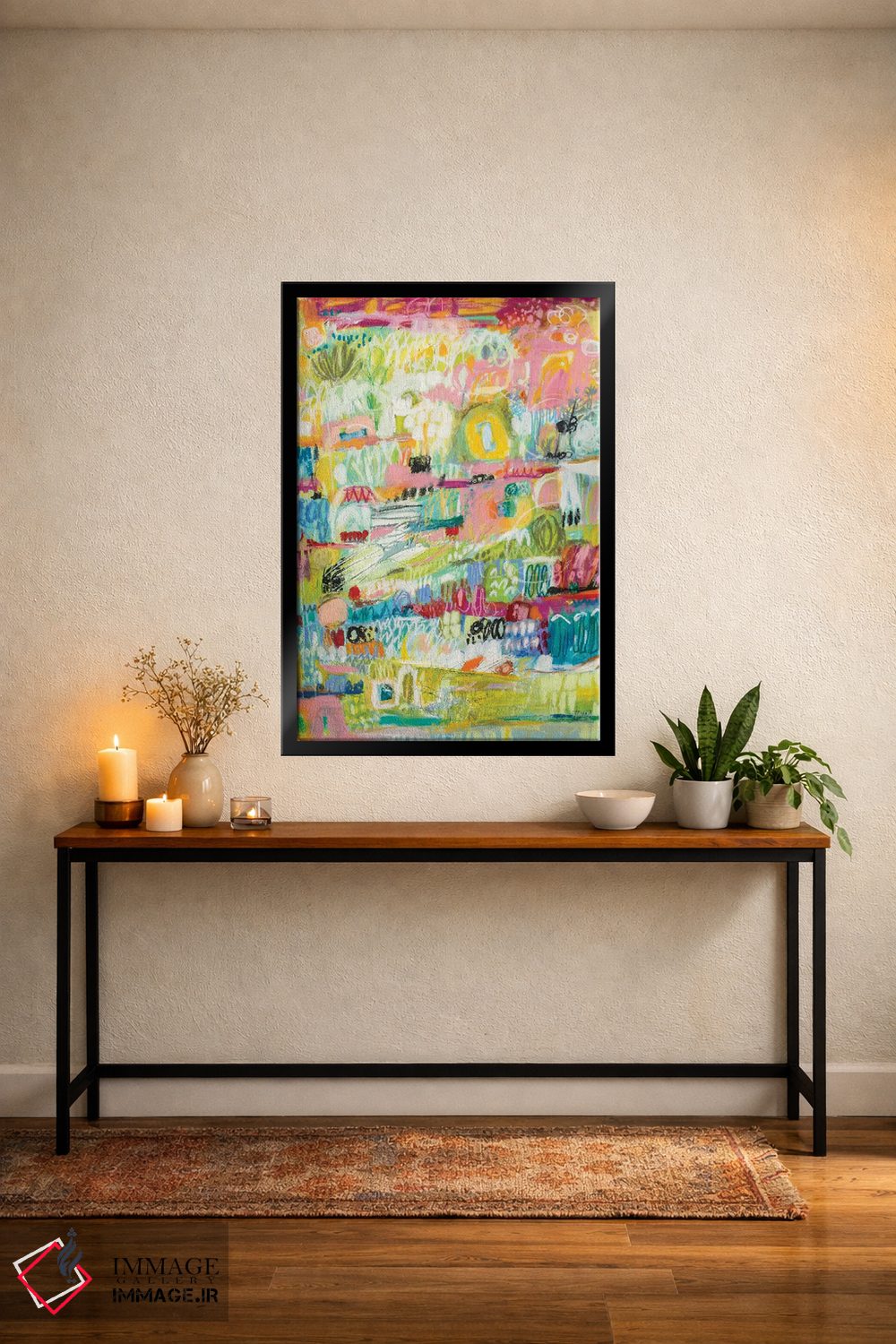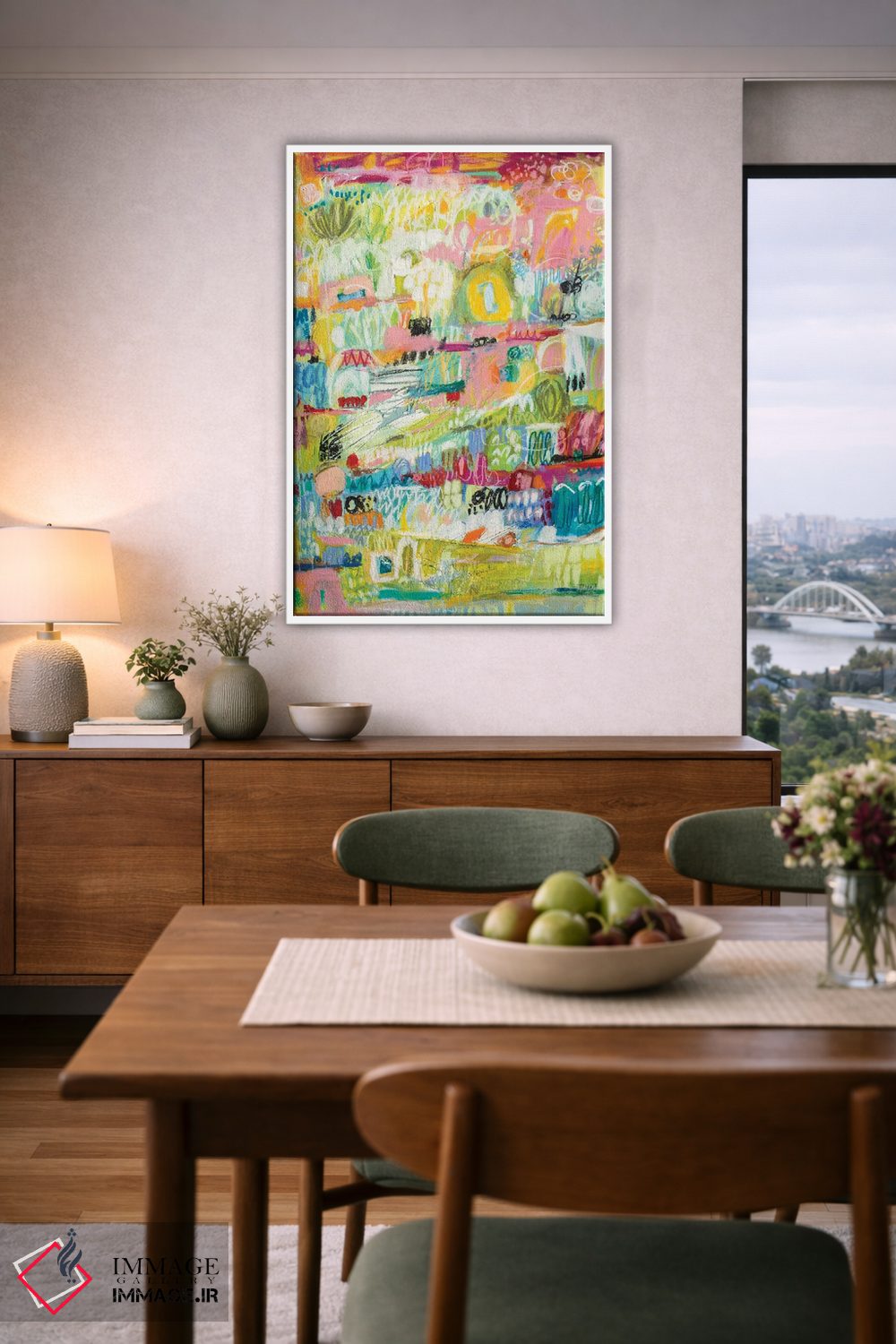 براساس پالت ترکیبی اثر، قاب تیک گرم (چوبی) پیشنهاد اول است و مشکی مات (فریم متوسط) مکمل. برای سفارشهای پروژهای با ابعاد و قابهای اختصاصی با ایماژ در تماس باشید.