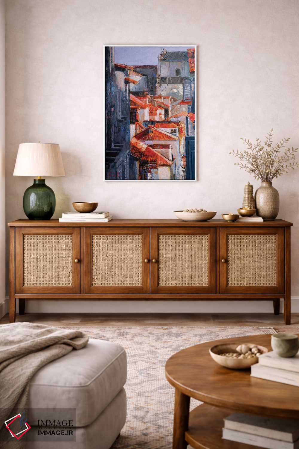 براساس پالت ترکیبی اثر، قاب تیک گرم (چوبی) پیشنهاد اول است و مشکی مات (فریم متوسط) مکمل. برای سفارشهای پروژهای با ابعاد و قابهای اختصاصی با ایماژ در تماس باشید.