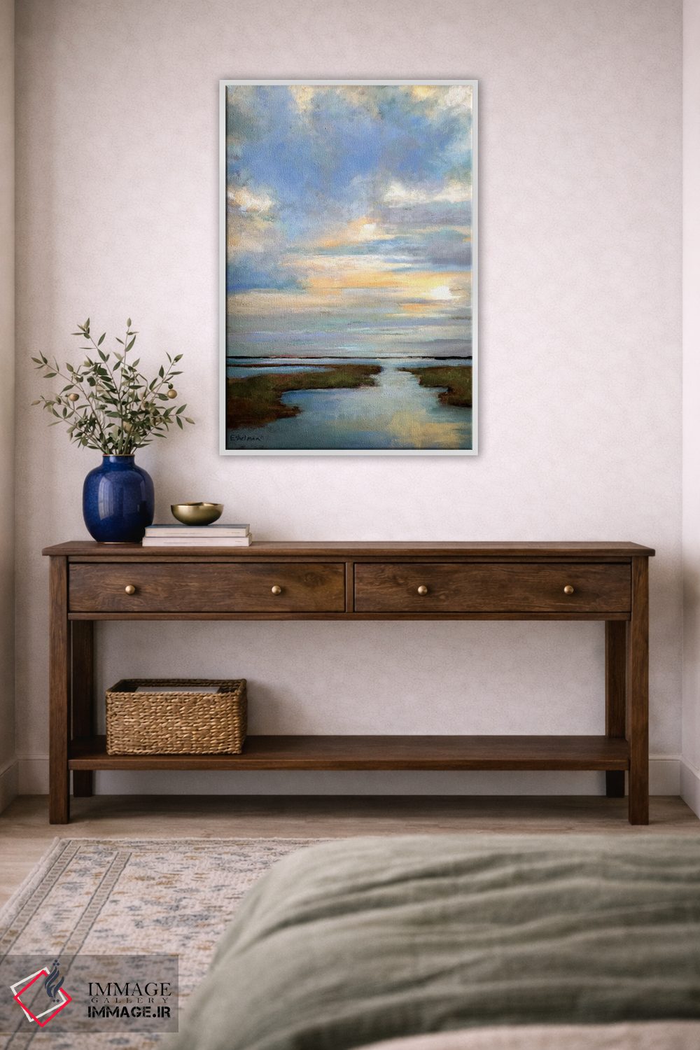 براساس پالت ترکیبی اثر، قاب بلوط روشن (چوبی) پیشنهاد اول است و استخوانی ملایم مکمل. برای سفارشهای پروژهای با ابعاد و قابهای اختصاصی با ایماژ در تماس باشید.