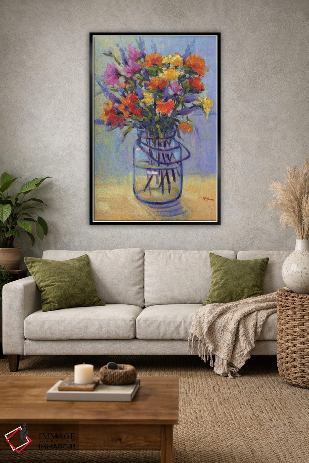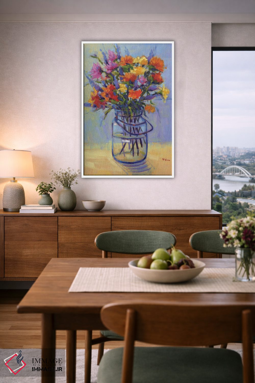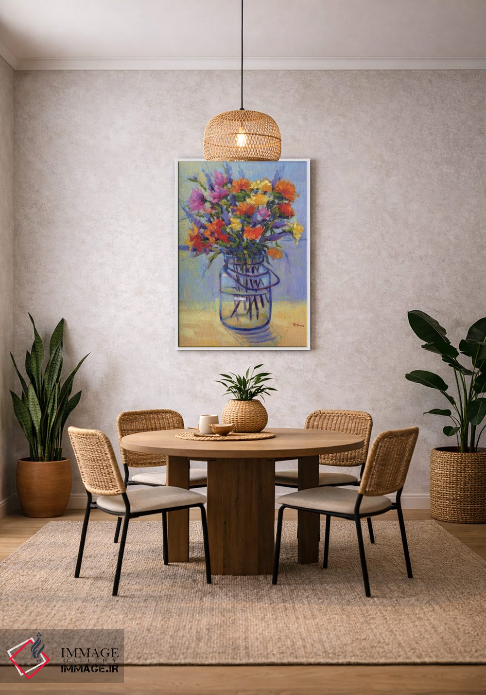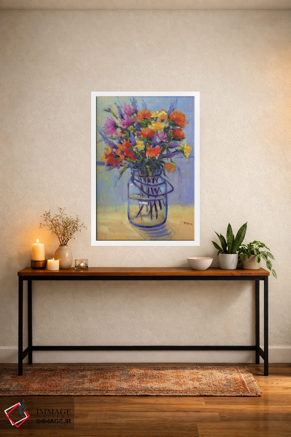 اگر دوست دارید دیوار روشنتر و آرامتر دیده شود، «دستهگل بهاری» اثرِ «کانی کیم» چیدمان را از خشکی بیرون میآورد، برای کنار میز آرایش یا کنسول گزینهٔ مناسبیست. برای دیوار گالری هم ترکیبپذیر و خوشنشین است.