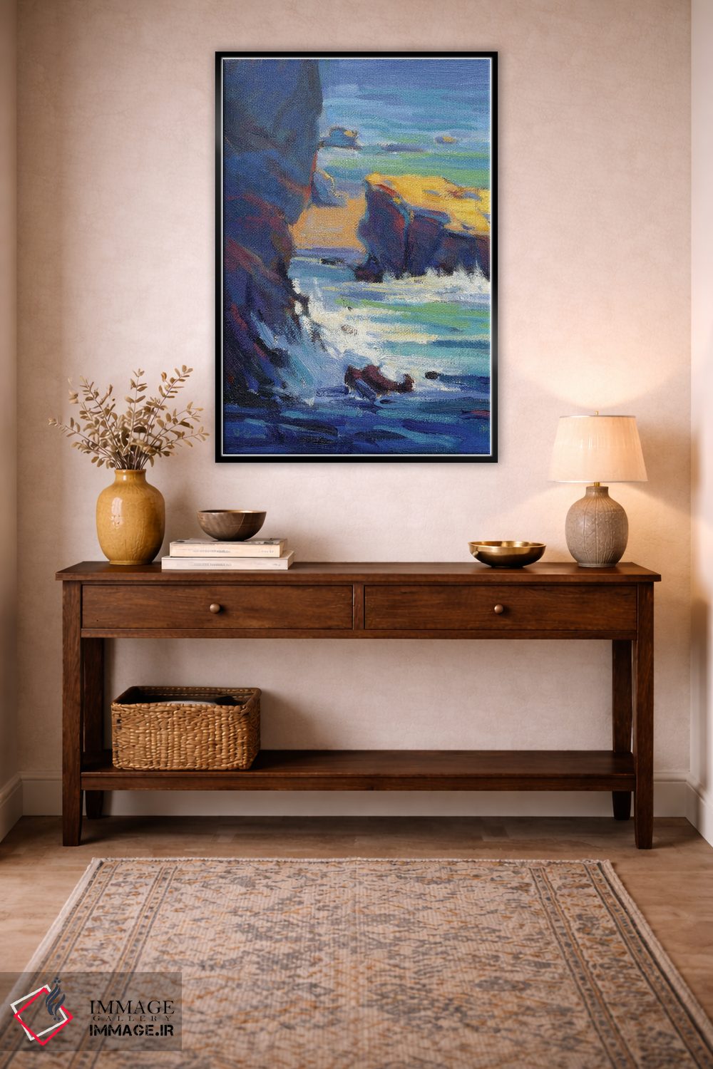 براساس پالت ترکیبی اثر، قاب تیک گرم (چوبی) پیشنهاد اول است و مشکی مات (فریم متوسط) مکمل. برای سفارشهای پروژهای با ابعاد و قابهای اختصاصی با ایماژ در تماس باشید.