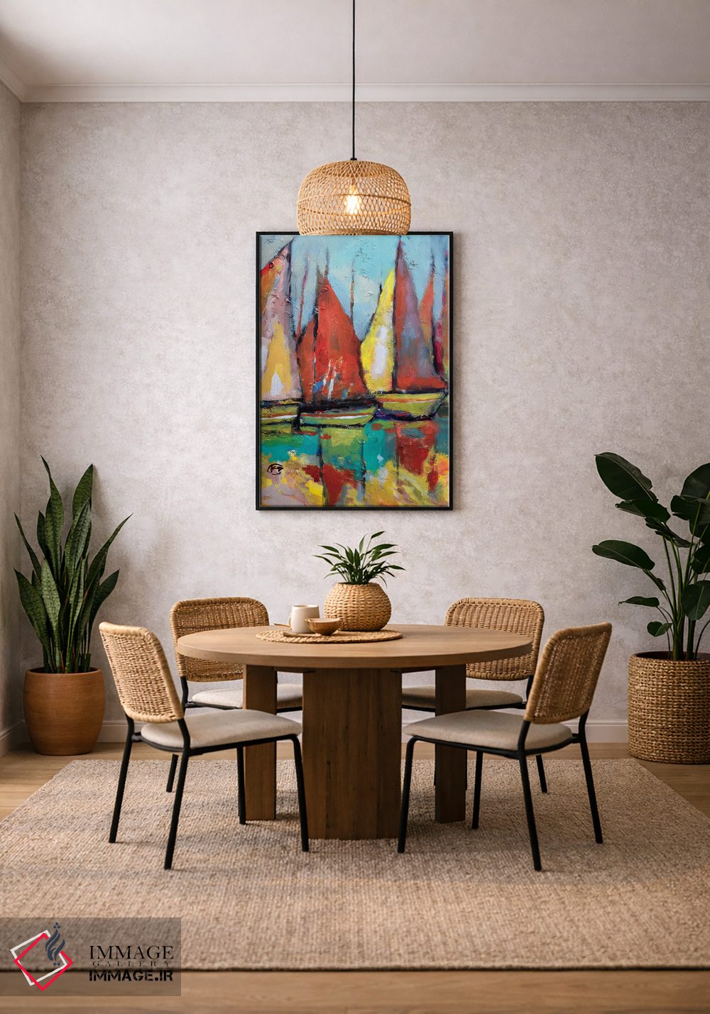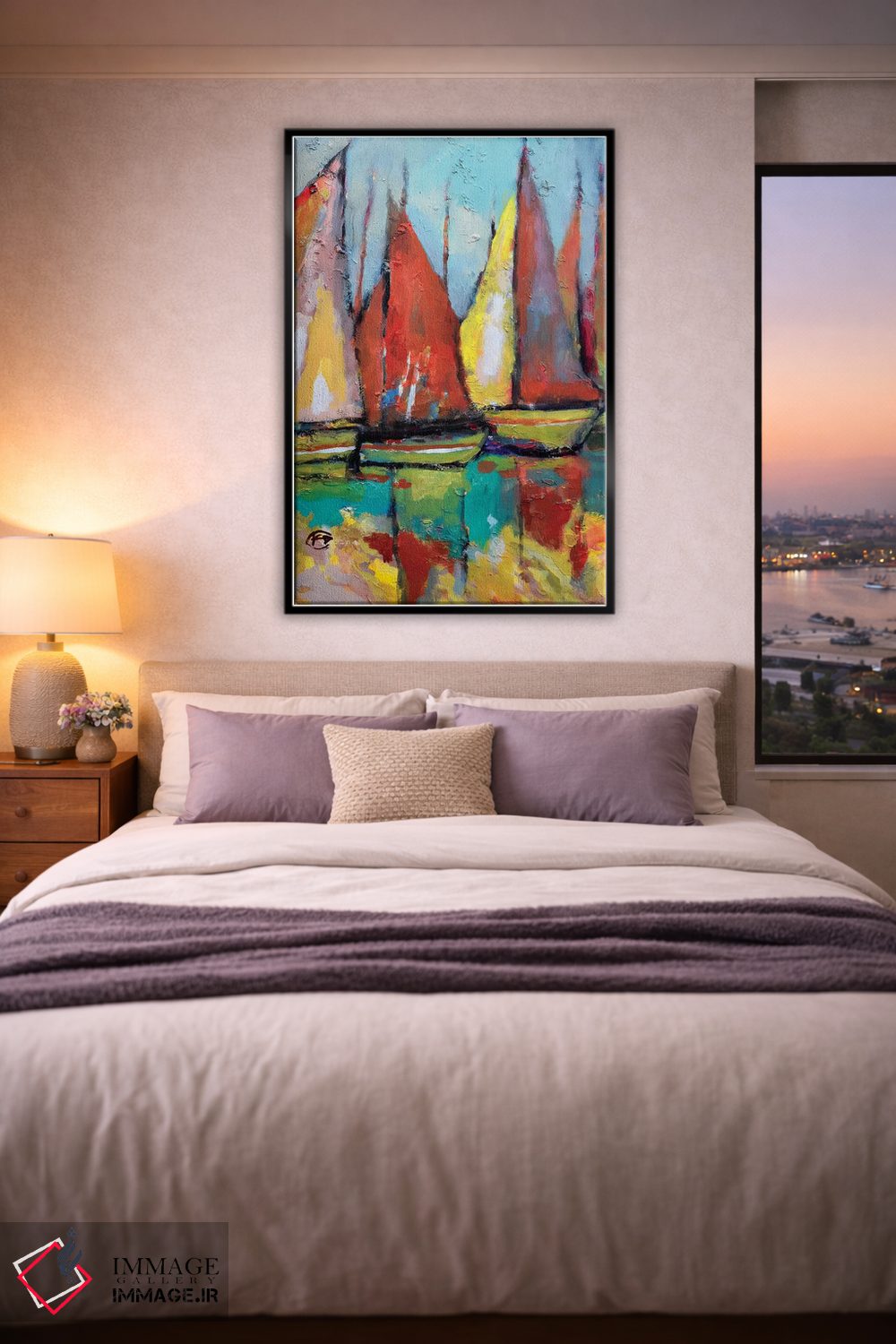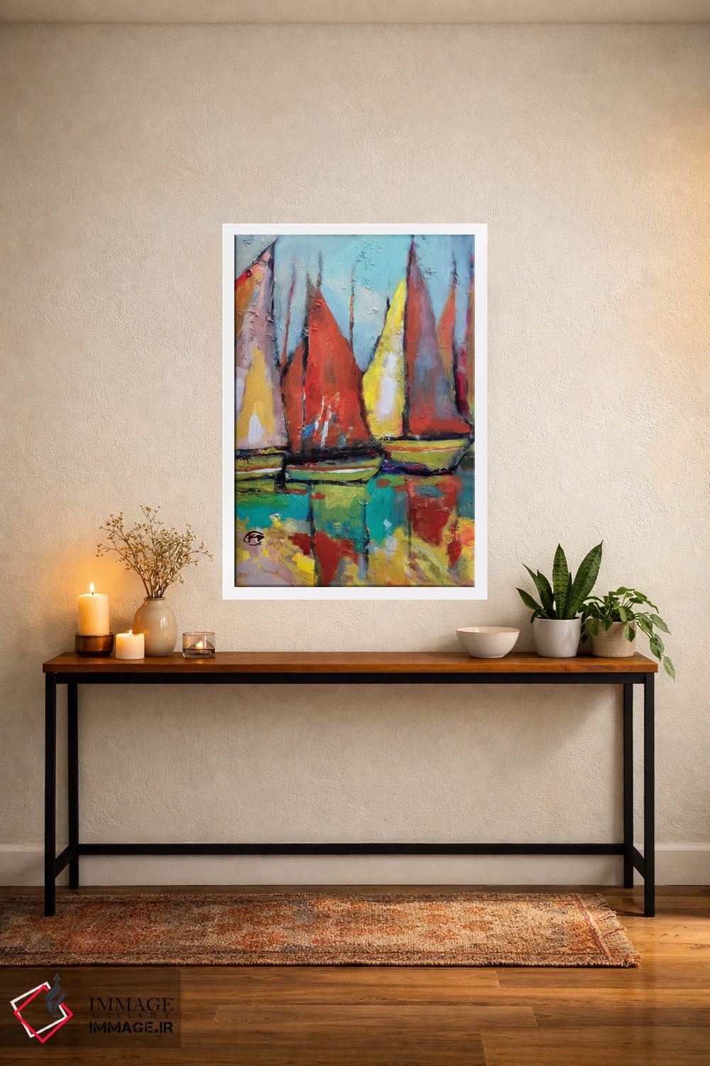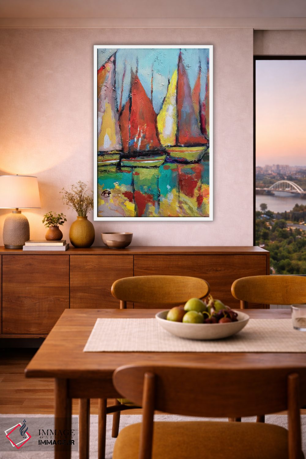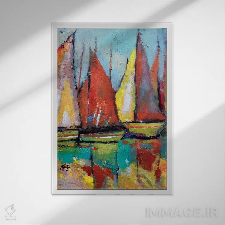 براساس پالت ترکیبی اثر، قاب تیک گرم (چوبی) پیشنهاد اول است و مشکی مات (فریم متوسط) مکمل. برای سفارشهای پروژهای با ابعاد و قابهای اختصاصی با ایماژ در تماس باشید.