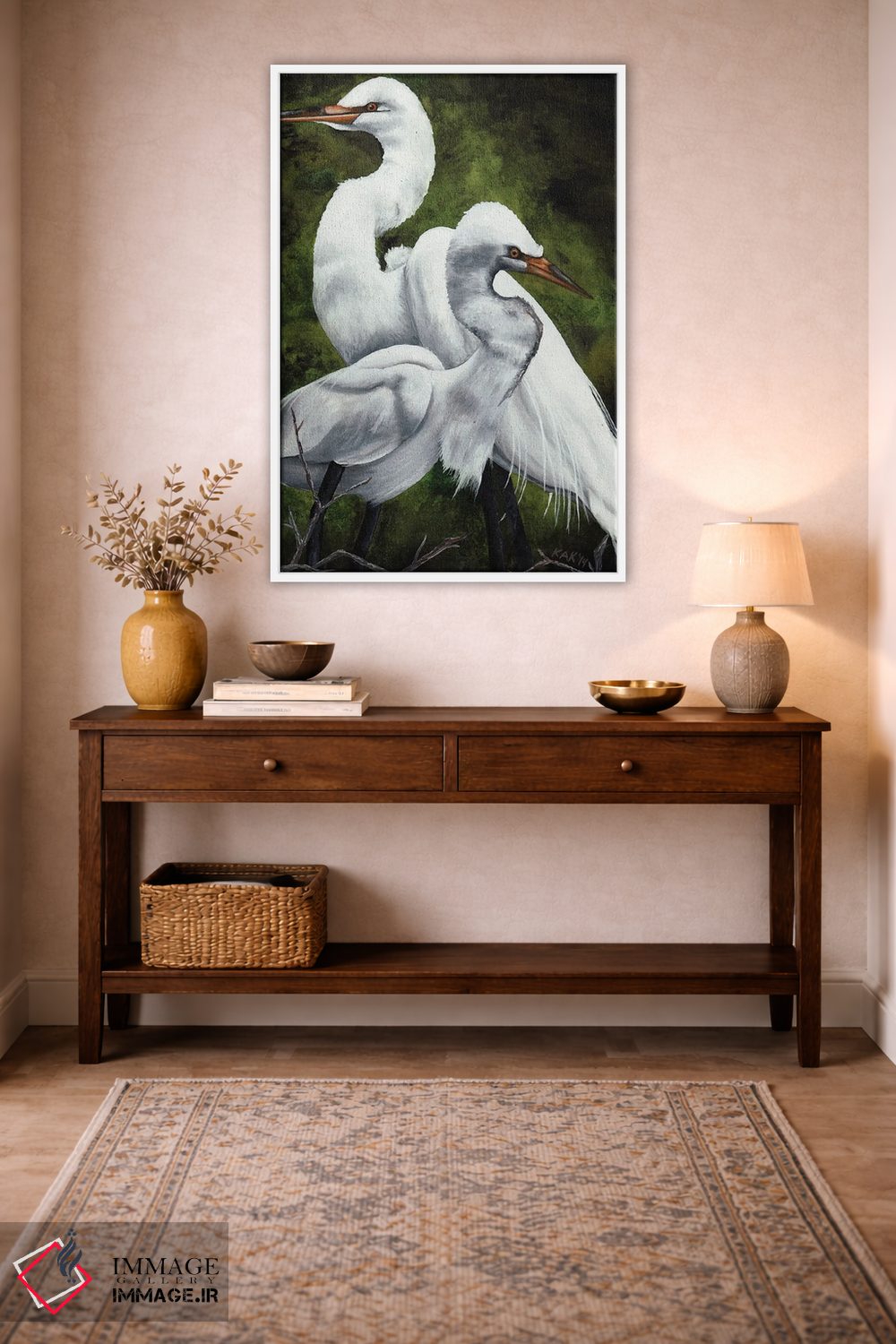 اگر میخواهید دیوار کمی سرزندگیِ محترمانه داشته باشد، «جفت اگرت» اثرِ «هنر و طراحی KAK (استودیو هنری)» در کنار رنگهای خنثی، تضاد دلچسبی میسازد، برای خانههایی با چوب و پارچههای گرم گزینهٔ مناسبیست. با نورپردازی نقطهای، جذابتر هم میشود.