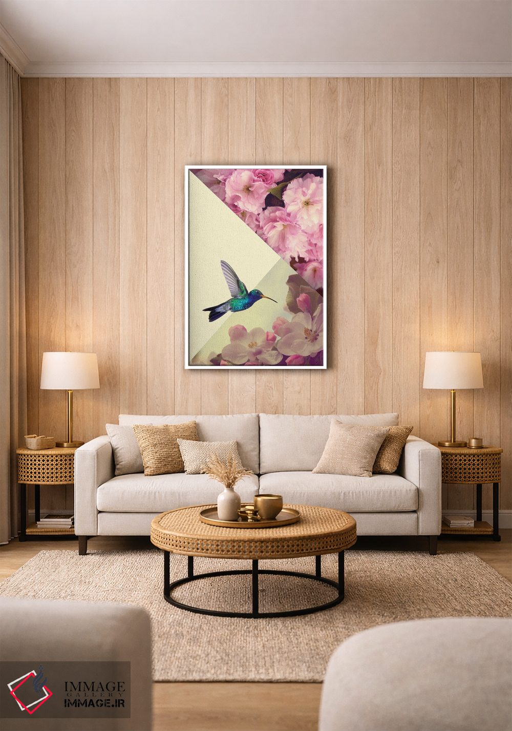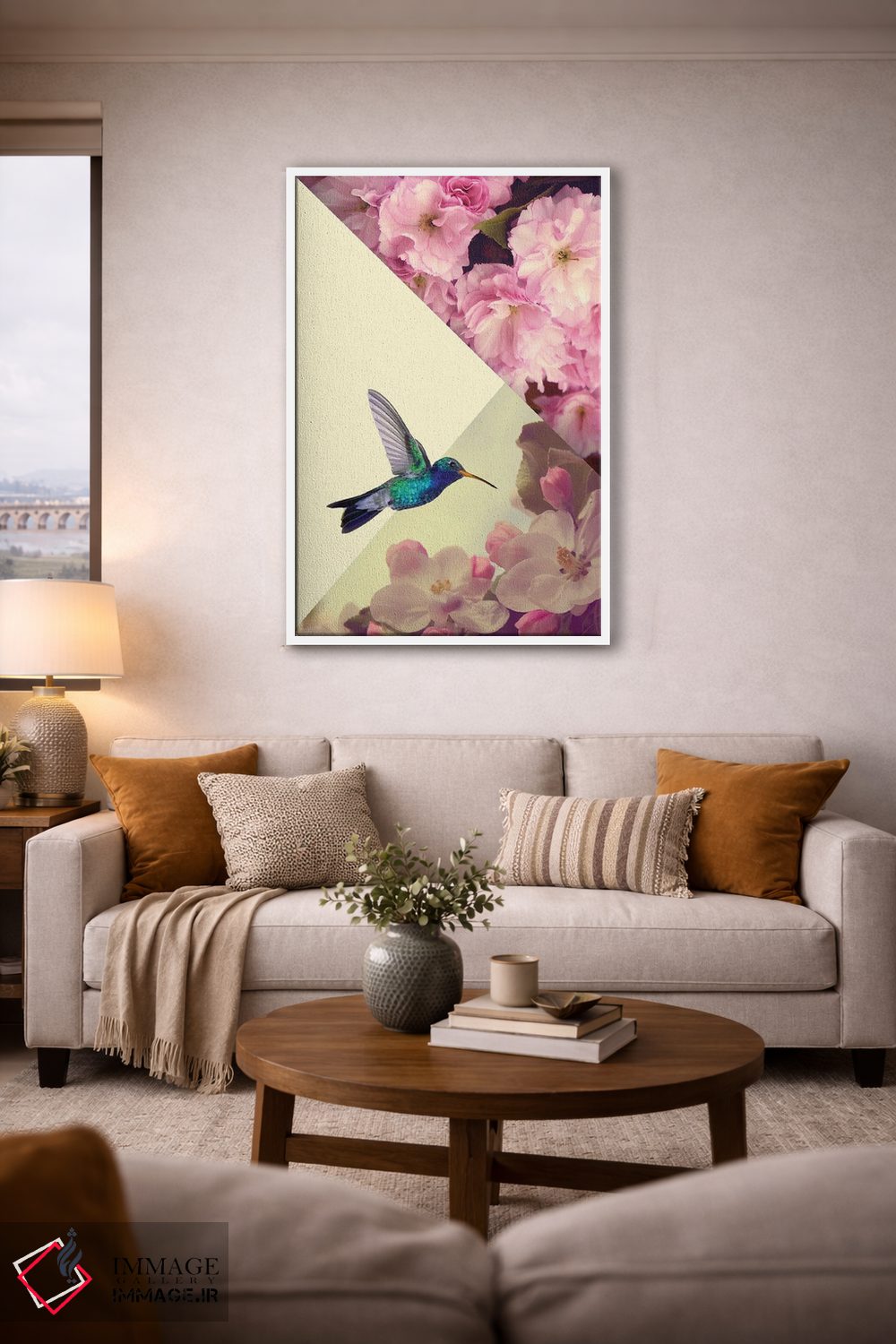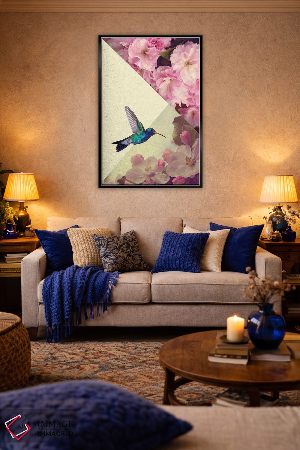 اگر میخواهید دیوار کمی سرزندگیِ محترمانه داشته باشد، «مرغ مگس عاشق» اثرِ «کیکی سی لندن» بافت و جزئیات را طوری نشان میدهد که نگاه میماند، برای دکورهایی با رنگهای خنثی گزینهٔ مناسبیست. با نورپردازی نقطهای، جذابتر هم میشود.