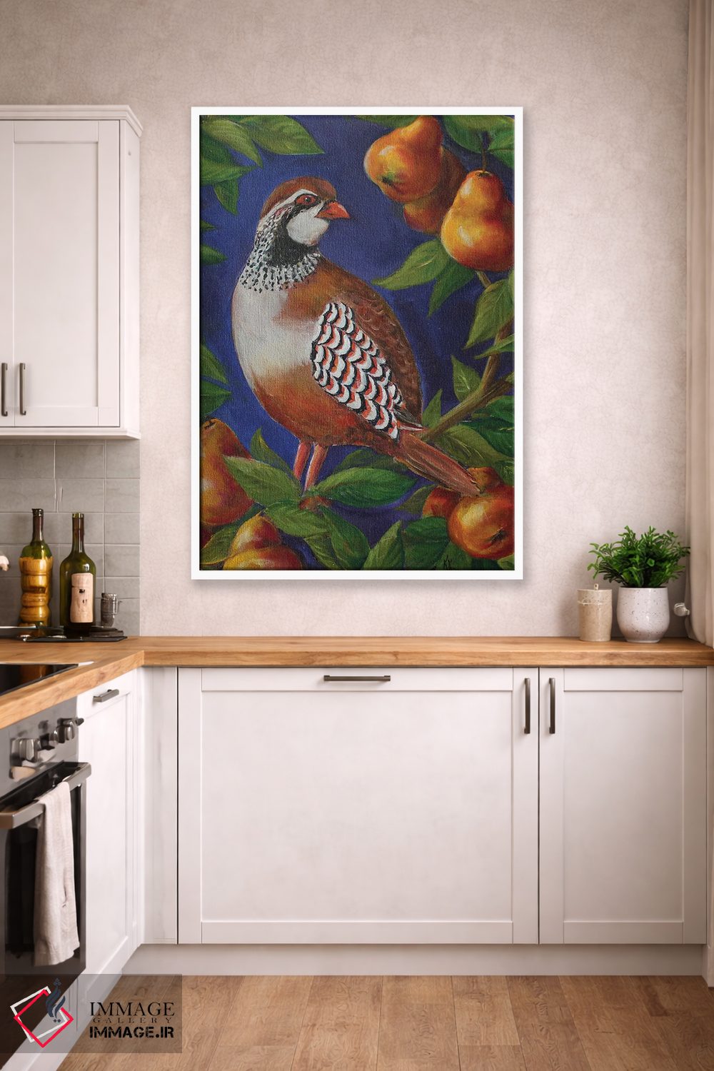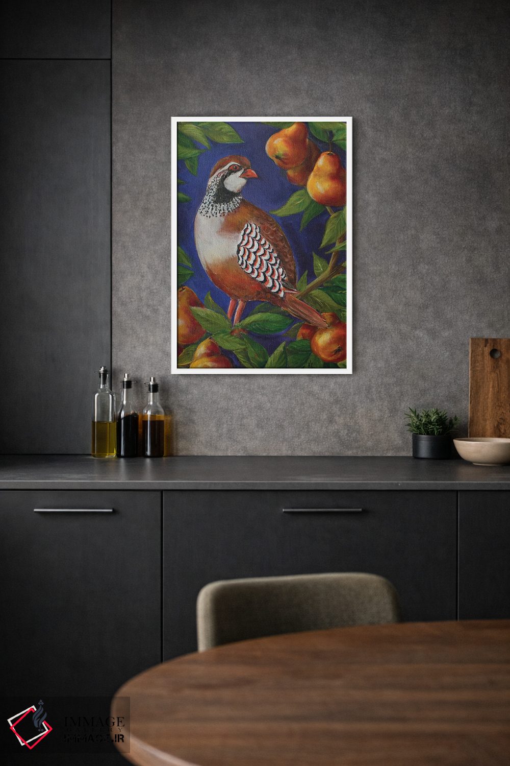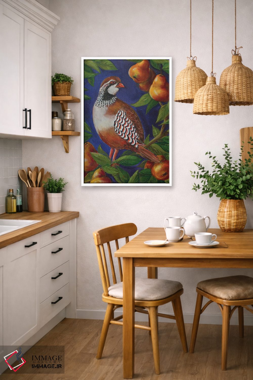 براساس پالت ترکیبی اثر، قاب تیک گرم (چوبی) پیشنهاد اول است و مشکی مات (فریم متوسط) مکمل. برای سفارشهای پروژهای با ابعاد و قابهای اختصاصی با ایماژ در تماس باشید.