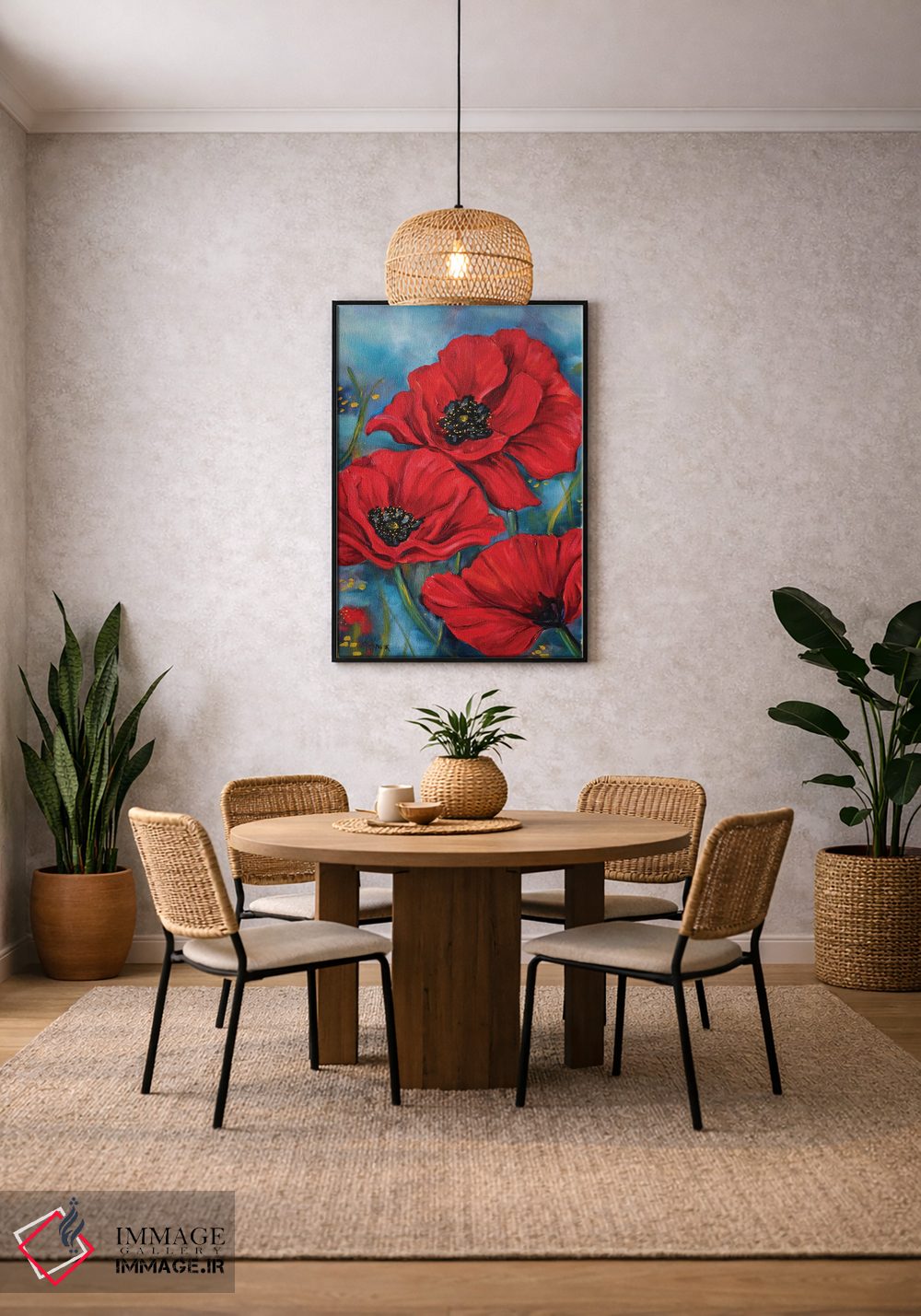 اگر دوست دارید دیوار روشنتر و آرامتر دیده شود، «شقایقهای قرمز» اثرِ «کریستین کاینر» در کنار چوب و پارچههای روشن، عالی مینشیند، برای کنار میز آرایش یا کنسول گزینهٔ مناسبیست. در کنار گیاهان آپارتمانی، هماهنگتر هم میشود.